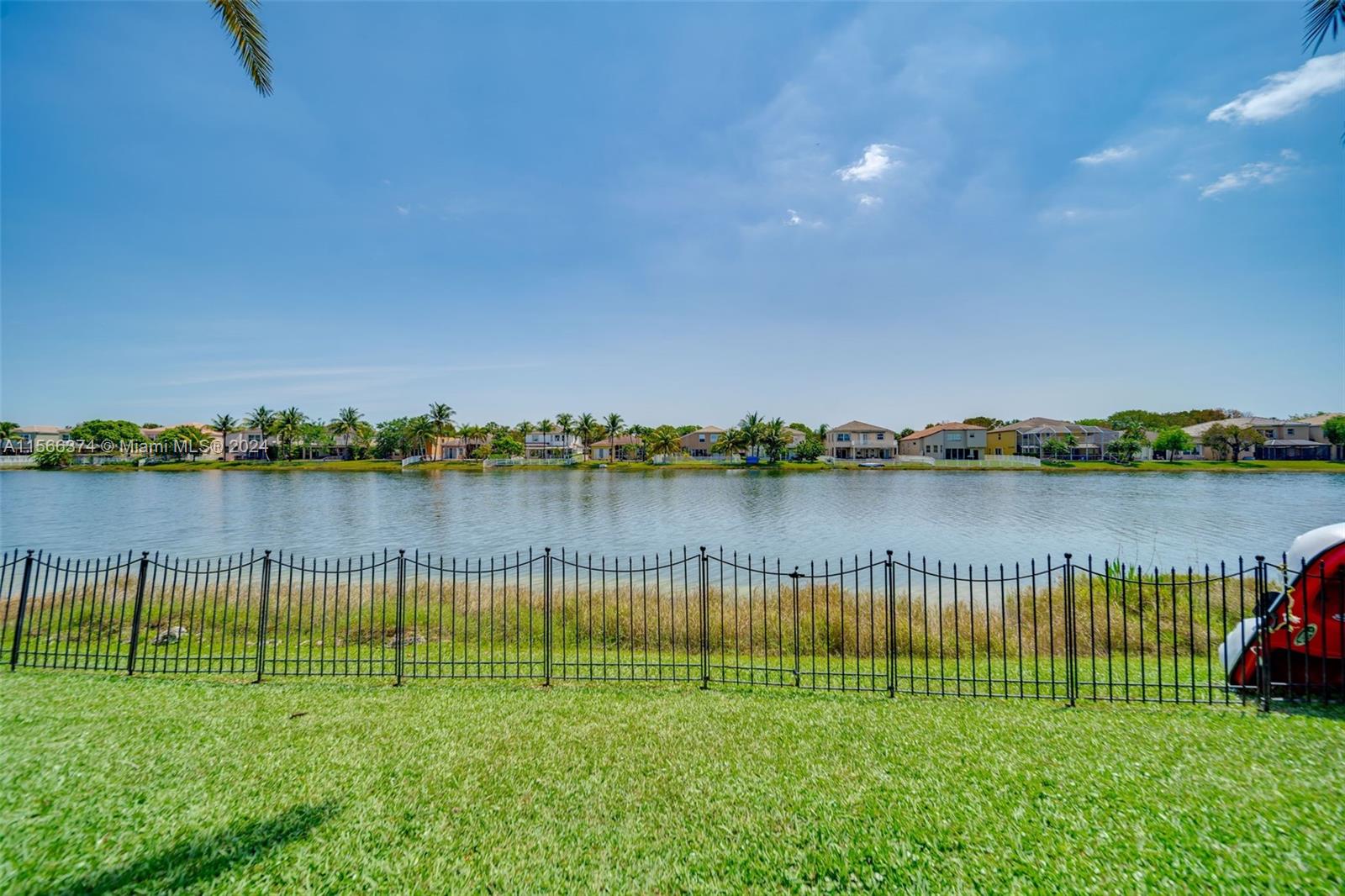 Gorgeous two story, lakefront home in Capri section of Riviera Isles Cambria Model. Very open and bright! Large, remodeled kitchen and new Porcelain tile flooring downstairs with vaulted ceilings. New Impact Windows and Doors thru-out. Original Roof. One Full bedroom & totally remodeled full bath downstairs. Formal dining room, living room and large family room are Perfect for family gatherings. Primary BR upstairs with separate sitting area. Could be office/den. New Covered Gazebo & patio in the waterfront backyard. Serene Tropical Setting. Additional upgrades include New Solar Water Heater, New Water Filter/Softener, Attic insulation & solar attic fan keep the house nice & cool. Separate Laundry Room in house. Riviera Isles has a 24/7 manned guard gate & amazing community pool.
