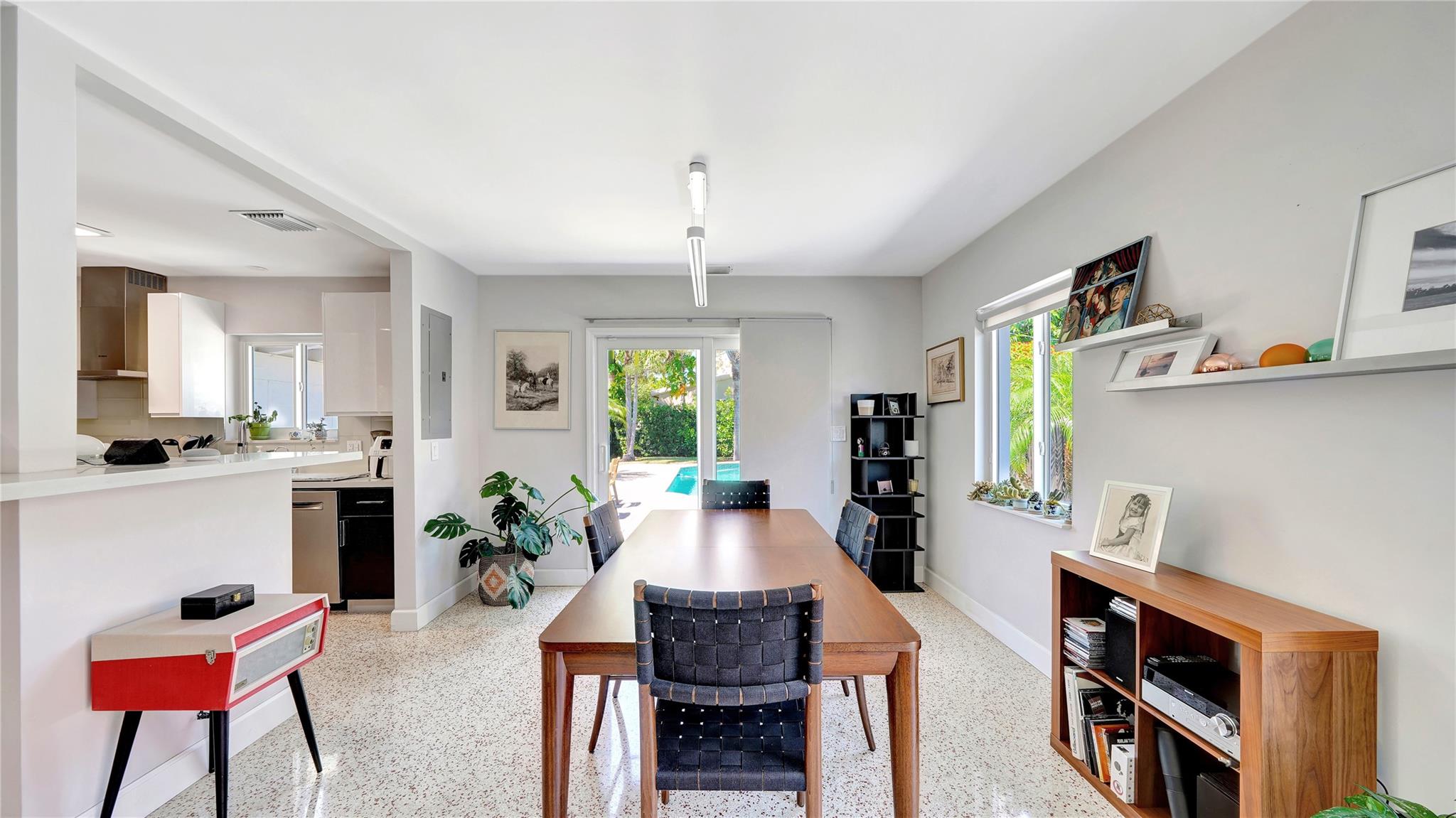 Nestled in Victoria park, this elegant home offers simplicity and peaceful tranquility. Thoughtfully designed kitchen has white quartz countertops and modern cabinetry. All Stainless Bosch Appliances. Polished Terrazzo Floors, Impact Windows and Doors, New A/C, Tankless W/h, three ring cameras for security, solar heating for pool, composite decking, own well for irrigation sprinkler system w new pump. Garage was converted into a home office -game room - with closet.. Could convert back to garage. Backyard is an Oasis with pool, waterfall and lush tropical landscaping. Great place for entertaining and outdoor dining. Walk to movies, restaurants, parks, waterfront dining and shops. A+Schools Minutes from the Ocean. Home is now empty of all furniture. Large Lot. !A must see!