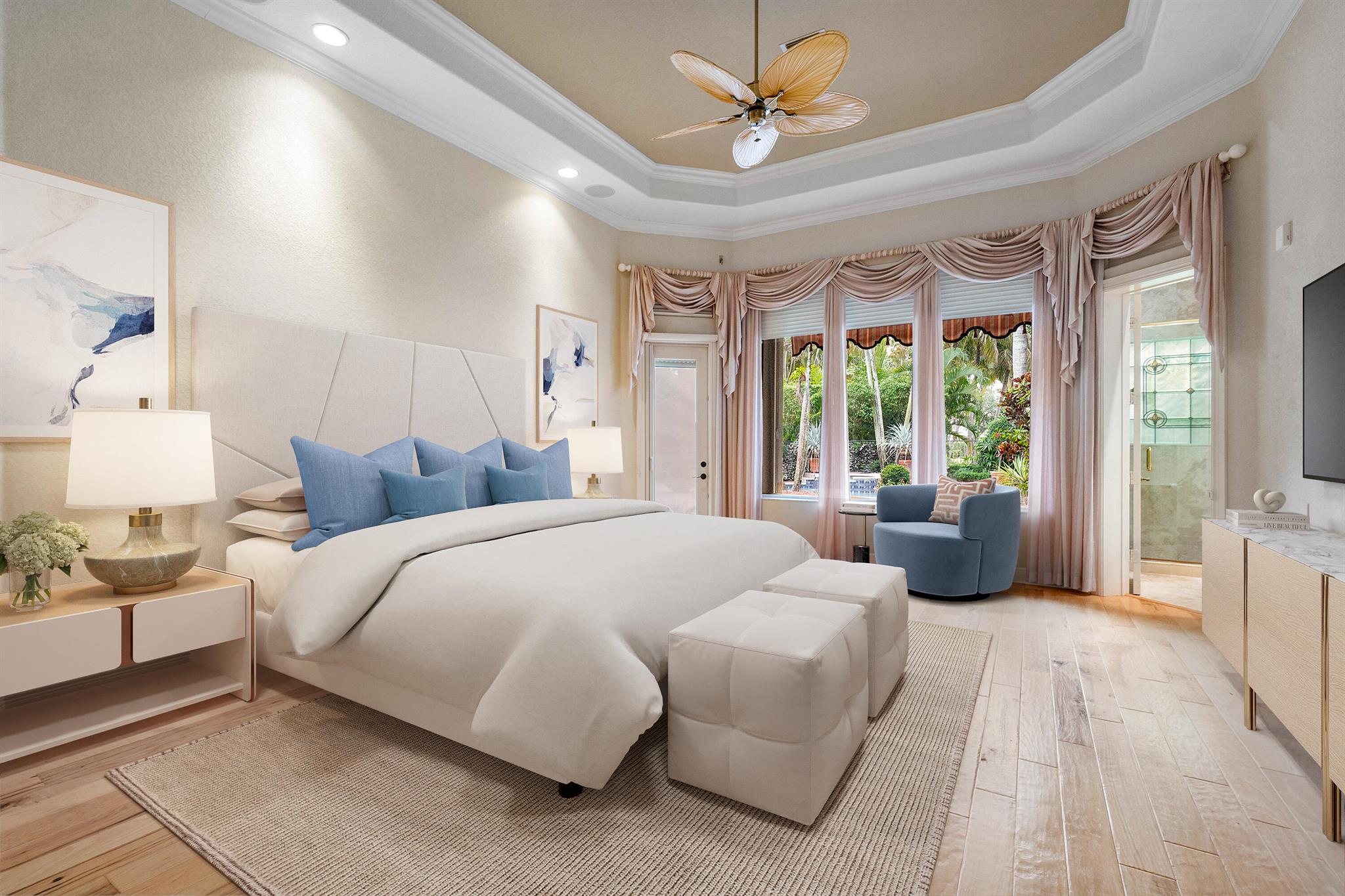 Rarely available Chateau estate in the coveted Country Club community of Boca Grove! You are immediately greeted by two double-gated entries, a large circular driveway, 3-car garage and lush landscaping. This property features soaring ceilings and high doorways throughout with over 4,250 living SqFt, 4 bedrooms, 5 full baths, powder room & cabana bath. The backyard is enhanced by your private pool & spa with Southern Exposure for Sun all day long overlooking a beautiful fountain / lake view on one of the most Private Lots in all of Boca Grove. Schedule your private tour today!