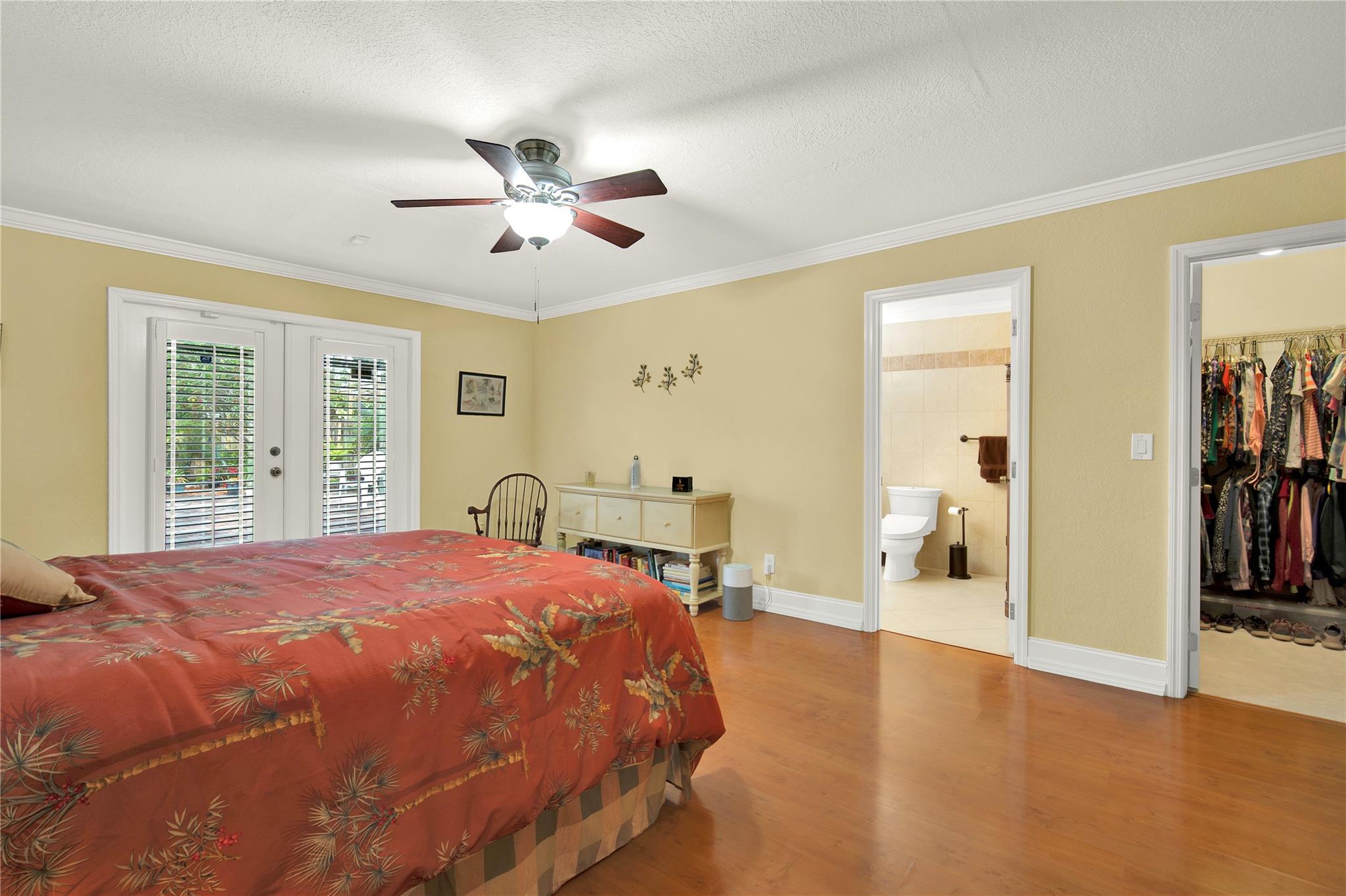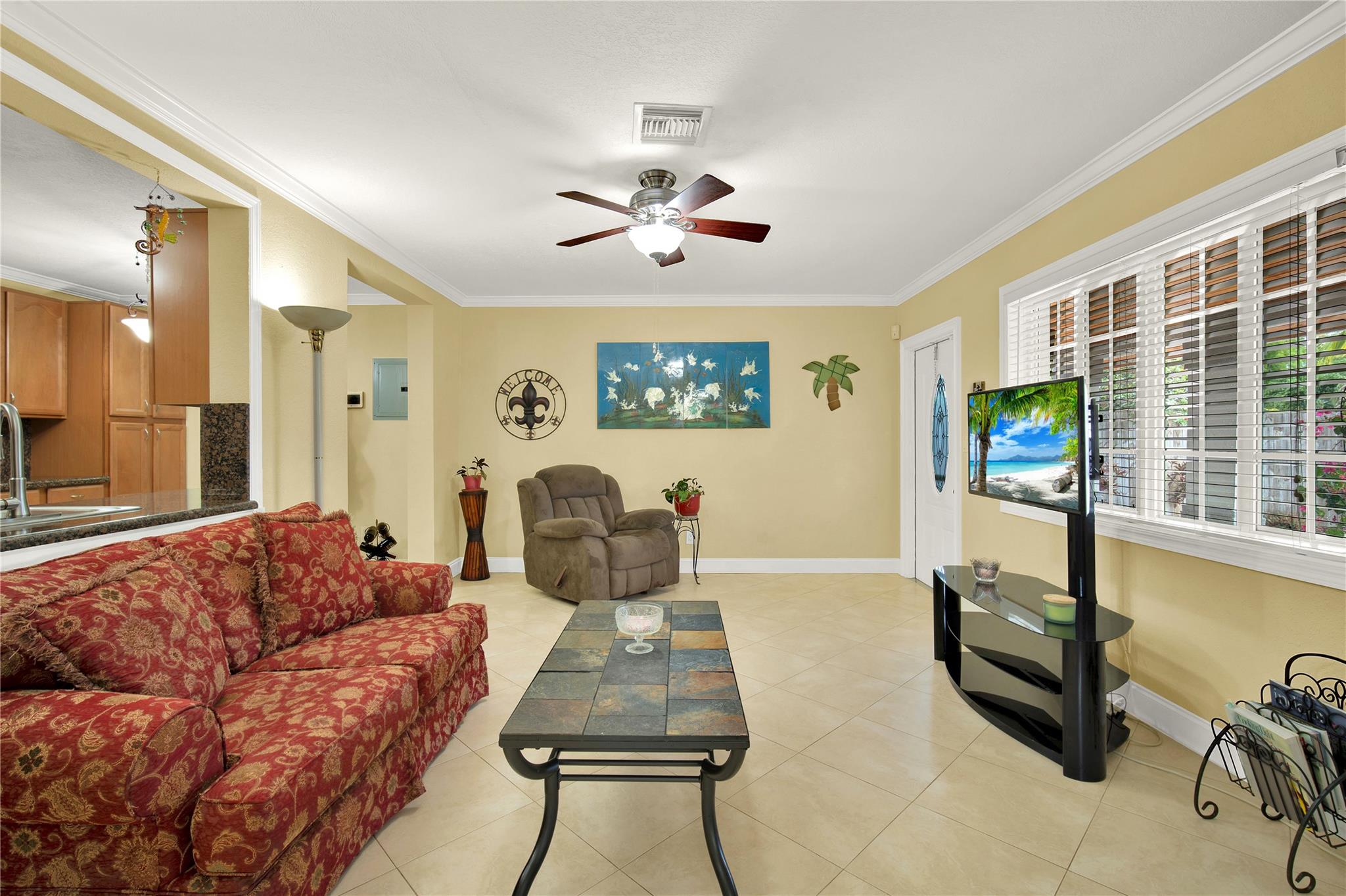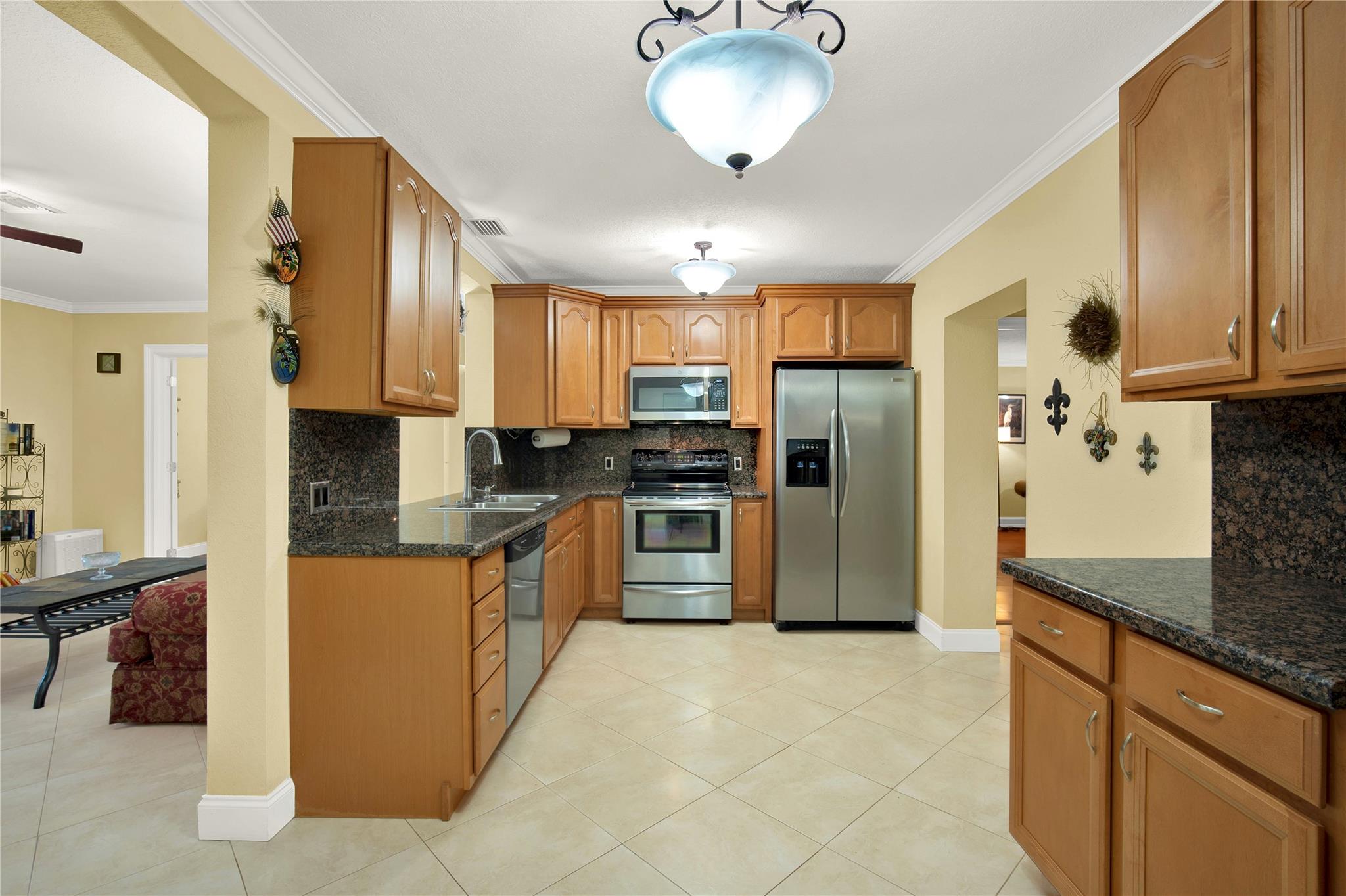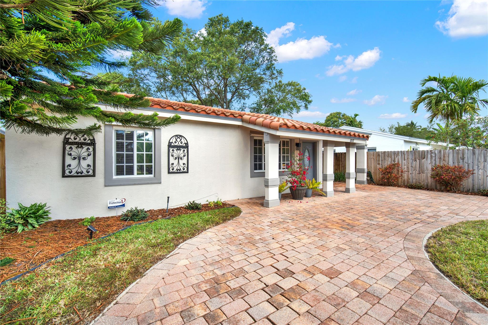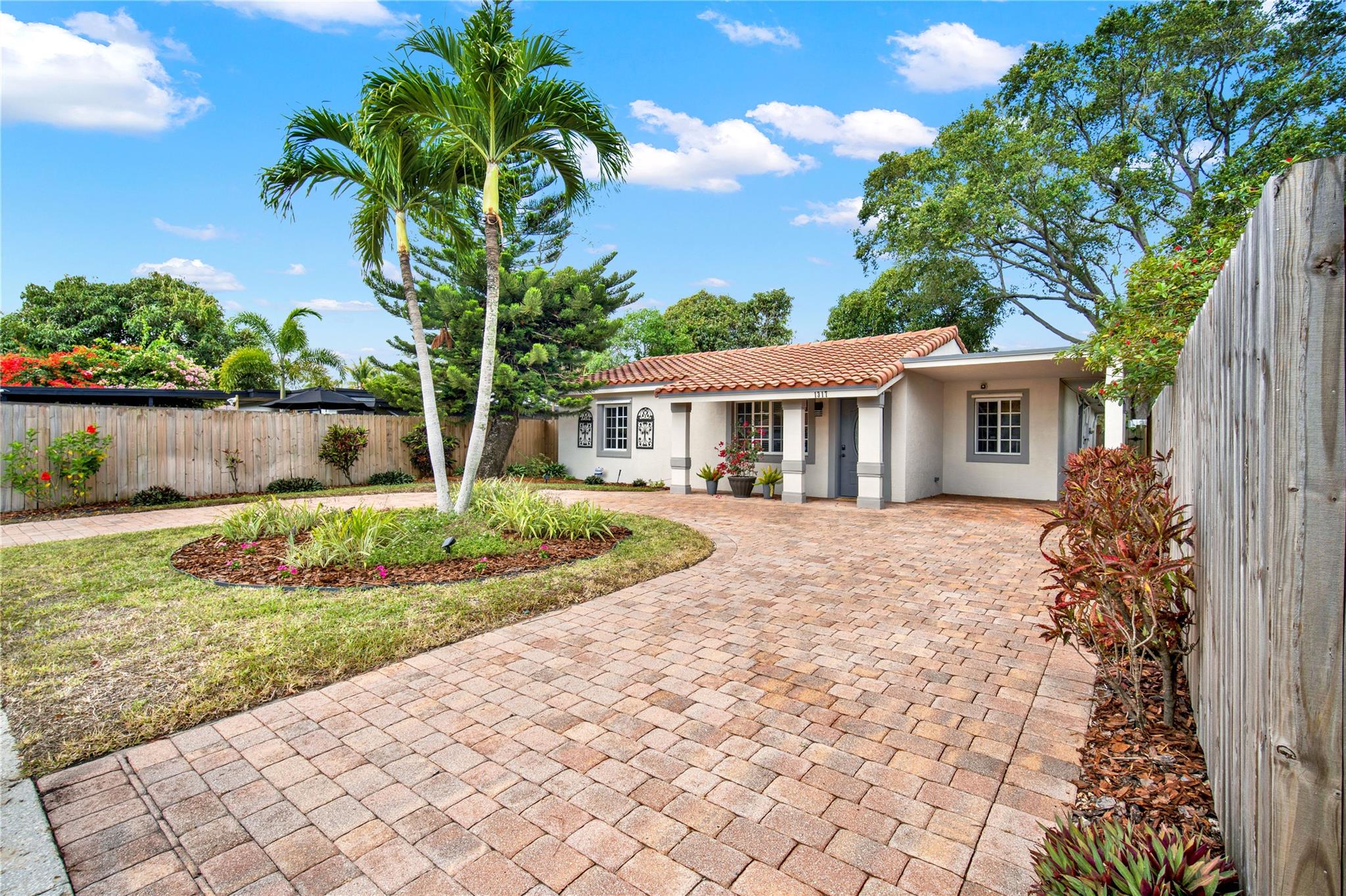 Well-maintained 3 bedroom 2 bath home, built to last with overly spacious rooms that open up with plantation shutter french doors to the large paved back yard, with delightful flowers, fruit trees, and vegetable garden. The home was rebuilt in 2006 with complete new PVC plumbing and updated electrical. Tile Roof replaced in 2016 with custom rain gutters. Pest control insulation in 2023. Master bath has large shower his/hers sinks, kitchen beautifully updated with wood cabinets, granite tops, and walk in pantry/utility with washer and dryer in a closet. The exterior was painted and property fenced in 2022. Property has shutters,motion lighting around the exterior, transferable ADT alarm system, and water irrigation. Perfect blend of modern convenience and cozy charm.