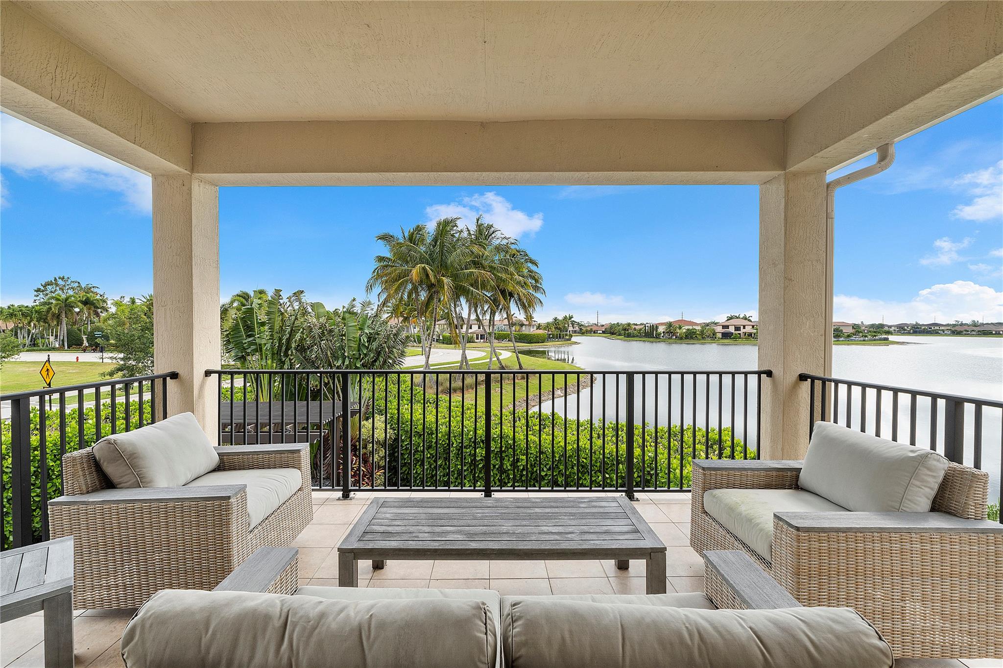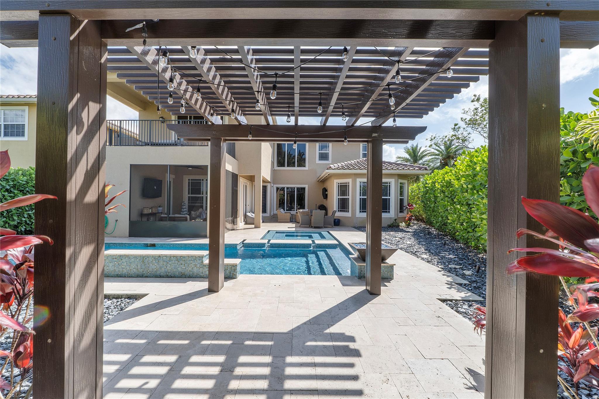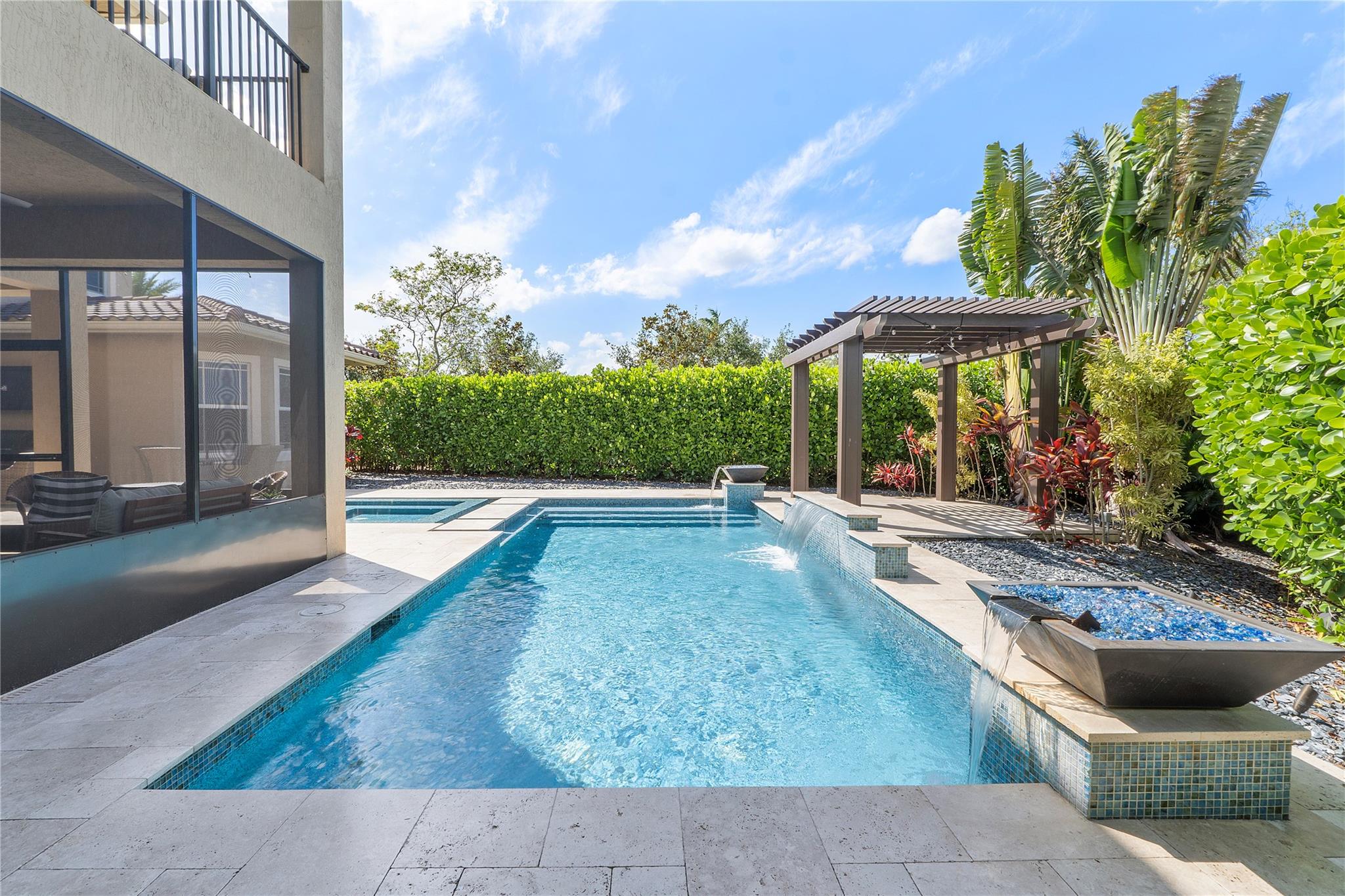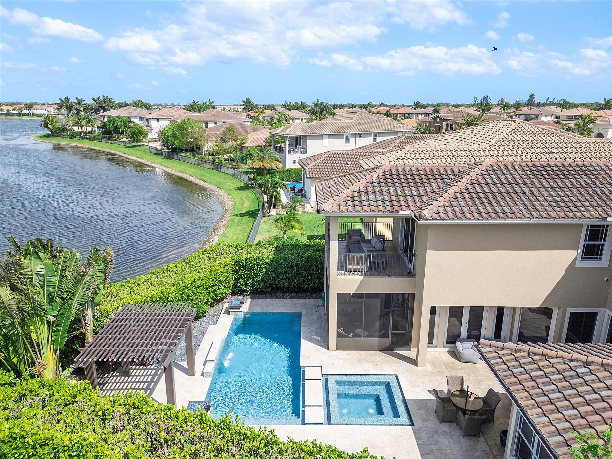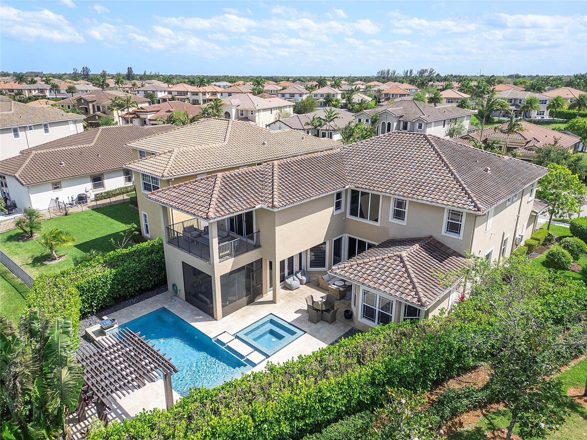 Resort-style living at Parkland’s prestigious, man-gated community of Miralago. Elegant Wentworth model with five bedrooms, and six-and-one-half baths. Spacious downstairs Primary suite with custom built-in closets, three ensuite bedrooms upstairs, plus an additional bedroom, bathroom, and theater room with a custom built-in bar and humidor. Den, Laundry, and air-conditioned three-car garage with parking for up to three cars. Screened-in back patio with a beautiful, heated saltwater pool with water and fire features. Impact windows/doors throughout. Hard wired cat 5, mosquito system installed by Mosquito Mix, surround sound system, wiring for 2 outdoor tvs, remote controlled Zebra shades on the first floor. Use of two clubhouses with resort-style amenities and sport complex!