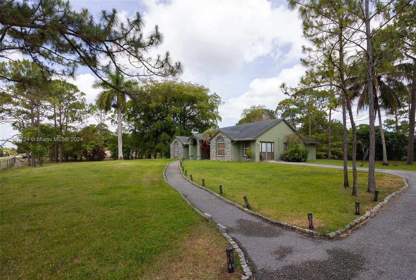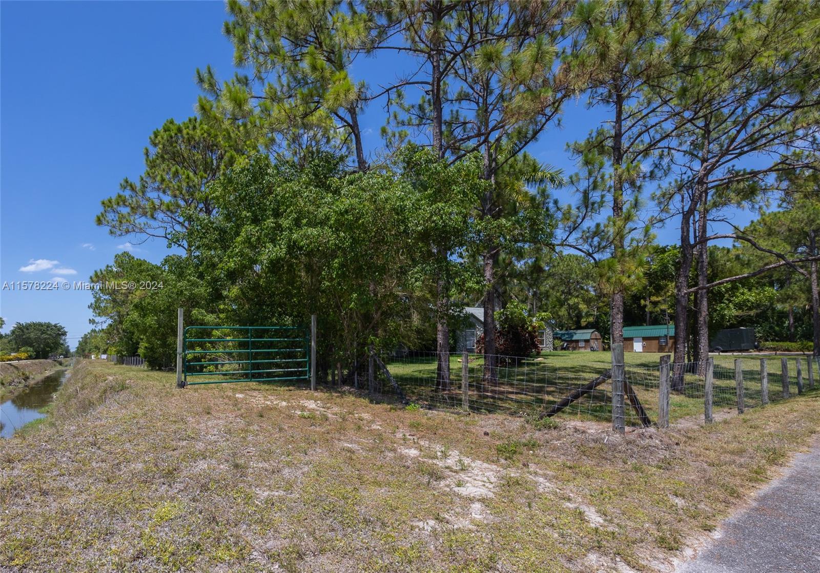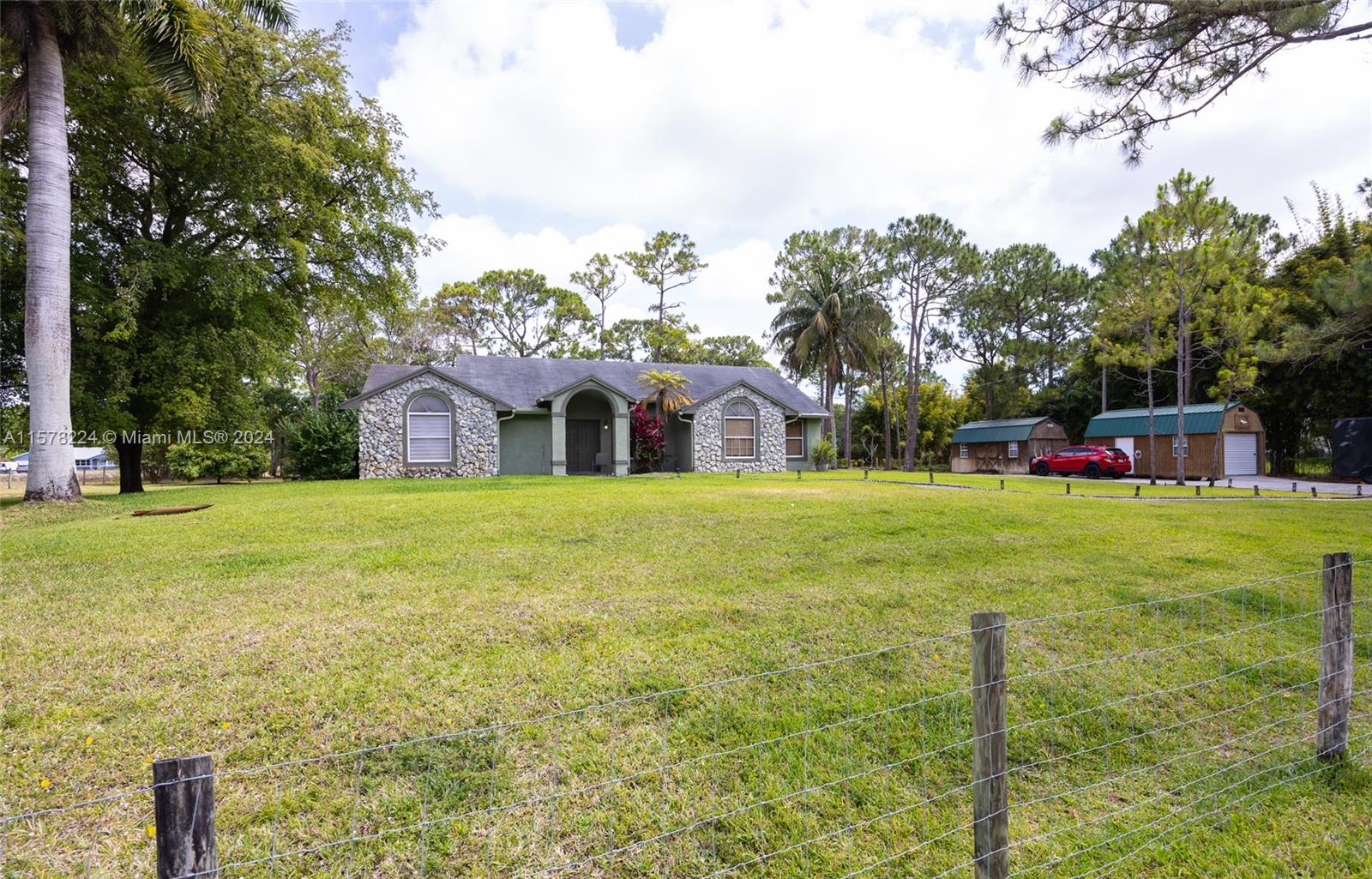 Very well maintained, 2200 sq.ft. under air, recently updated 3/2 in the heart of The Acreage on oversized 1.37 acre fenced/gated lot. Open concept with 12' ceilings in the living room and kitchen. Bathrooms and kitchen 100% updated in 2023 with high end appliances and cabinets. Large master bath includes rain shower and separate triangular tub. Home painted inside/out in 2023. Massive 22X34 screened/tiled patio. Property includes plenty of mature decorative and fruit-bearing trees and an automatic sprinkler system. Stocked and self maintaining pond containing a variety of native fish and turtles. Two 15X20 out buildings with electricity, one being a single car garage with rollup door. Home is on a paved road with paved driveway. Newer A/C and Roof. Call Listing Agent for a Showing.