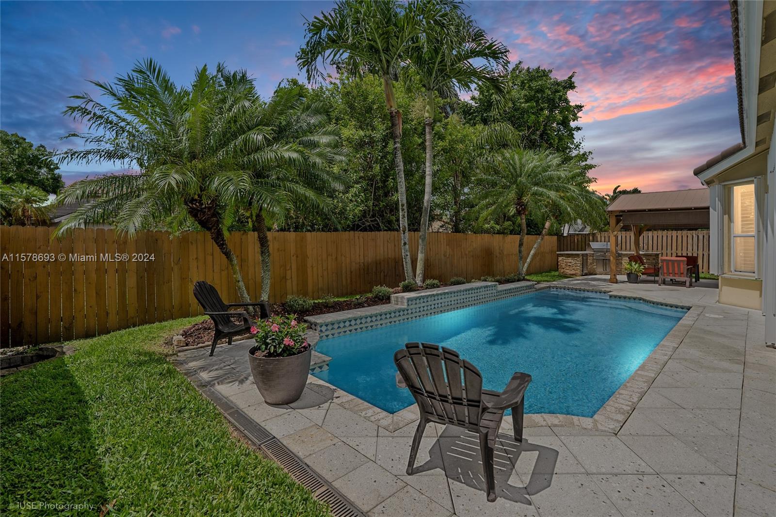 Welcome Home! This home is move in ready! Immaculately maintained, Original Owner. This 1-story, 3/2 Single Family Home Boasts a Backyard Oasis with Pool, Gazebo, Outdoor Kitchen, Palm Trees and 6 Ft Fence. 2024 New Roof, Exterior Painted Exterior 2024, A/C (2019), Plantation Shutters, Accordian Shutters and Security Lighting. Large driveway, 2 Car Garage and nearby guest parking spaces provides for plenty of convenient parking while entertaining. Master bedroom has walk-in-closet, his and her vanity, separate shower & roman tub. Renovated Kitchen and Bath. Home is surrounded by well maintained landscaping and privacy. Low HOA Fees. No HOA Buyer approval. HOA includes basic cable and internet through Comcast.