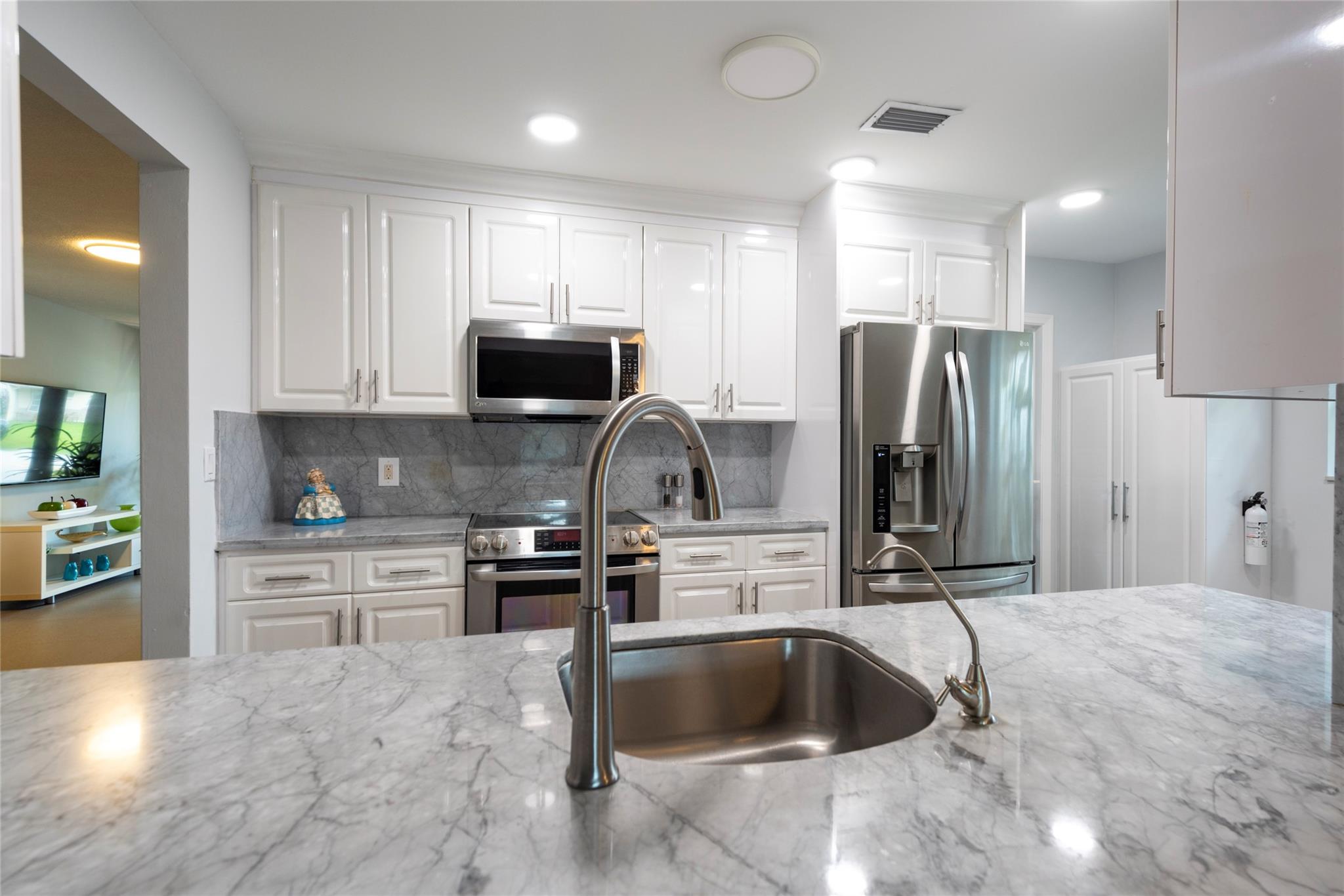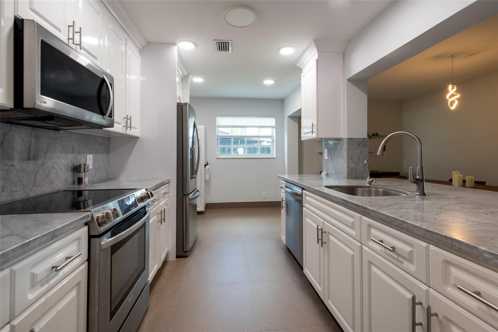 GREAT HOME - GREAT NEIGHBORHOOD - RENOVATED 3 BEDROOM/2 BATH HOME IN A QUIET, FRIENDLY COMMUNITY OF 267 HOMES. THIS HOME OFFERS A LARGE LIVING AREA WITH SEPARATE DINING AND AN OPEN KITCHEN, THE HOME HAS 3 WELL PROPORTIONED STACKED BEDROOMS WITH UPGRADED BATHS. KITCHEN OFFERS WHITE CABINETRY, STAINLESS APPLIANCES, AND CARRERA MARBLE COUNTERS. DINING ROOM ADJOINS THE KITCHEN AND FACES THE SCREENED PATIO AND BACKYARD. EXTRA LARGE YARD FOR NEIGHBORHOOD INCLUDING AN OUTSIDE SHOWER. WINDOWS AND DOORS ARE ALL IMPACT, STORAGE SHED AND FLOORING IS PORCELAIN TILE. ROOF IS 4 YRS, A/C IS NEW AND INSTANT HOT WATER 2 YEARS AND VERY PET FRIENDLY. SOME COMMUNITY MAINTENANCE INCL LAWN CARE, COMMUNITY SPRINKLER SYSTEM,9 HOLE GOLF COURSE, COMMUNITY POOL AND CLUBHOUSE, PAINTING OF HOMES EVERY 5 YEARS.