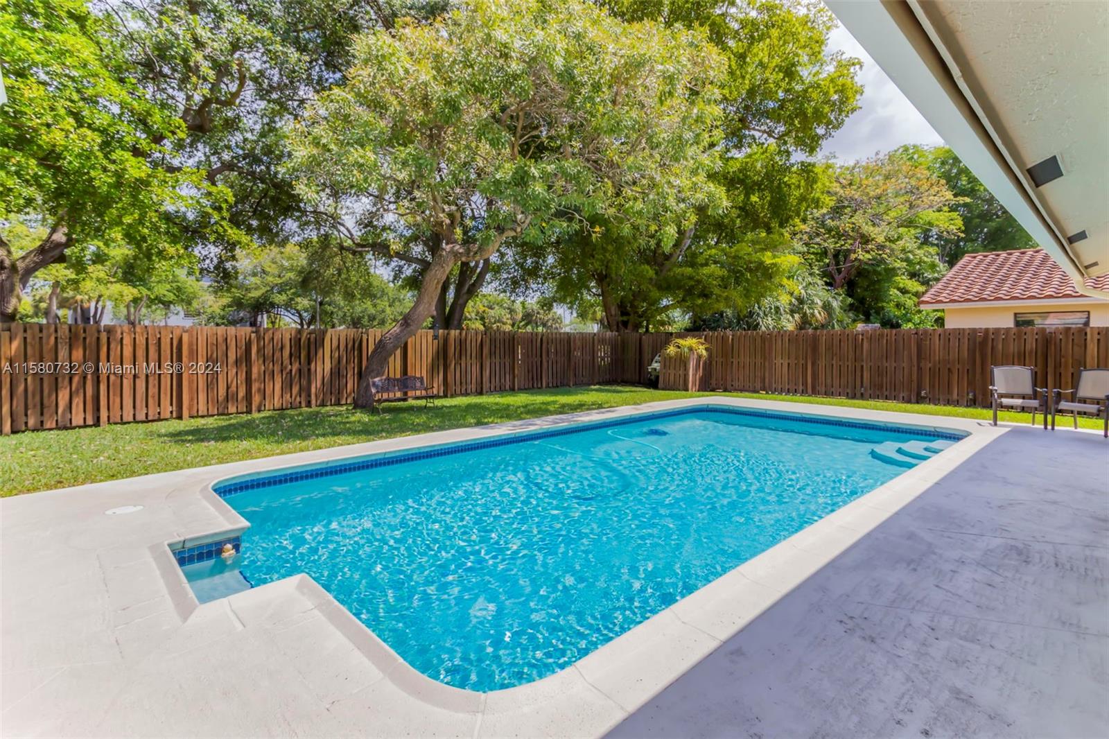 Impeccable one story 3 bedroom 2 bath ranch style home with a large pool located in the sought out community of Cypress Glen in Coral Springs! The kitchen is complete with wood cabinetry, stainless steel appliances, granite counter tops and breakfast area. The bathrooms were completely renovated with brand new vanities, bathtub, modern lighting and tile floors. This renovated home features porcelain tile floors throughout all living areas and luxury vinyl floors in bedrooms. The backyard has a huge grassy yard on both sides of the house. Beautifully maintained garden with large pool and covered sitting area. Backyard is completely fenced-in and very private. This home is protected by accordion shutters.