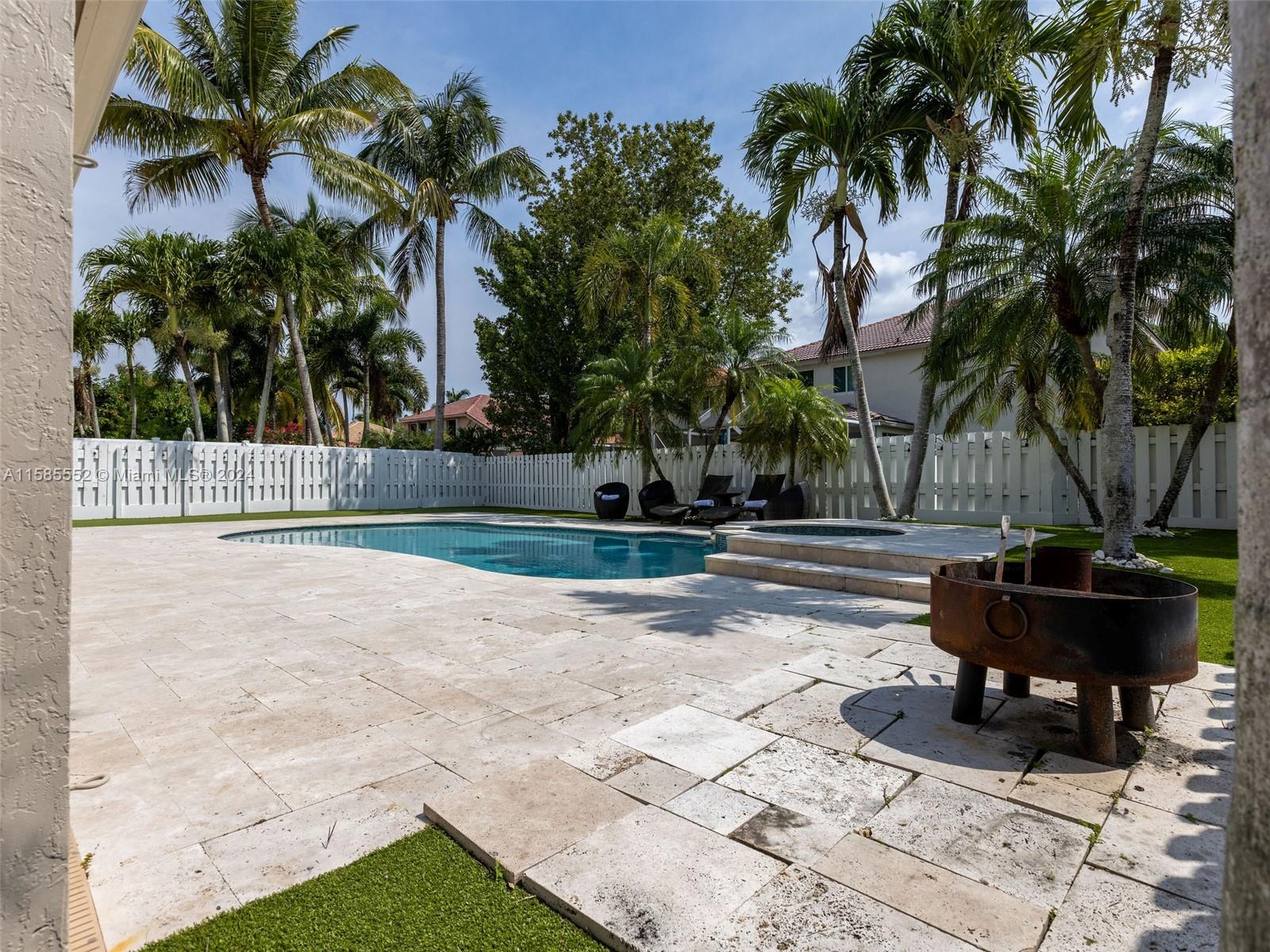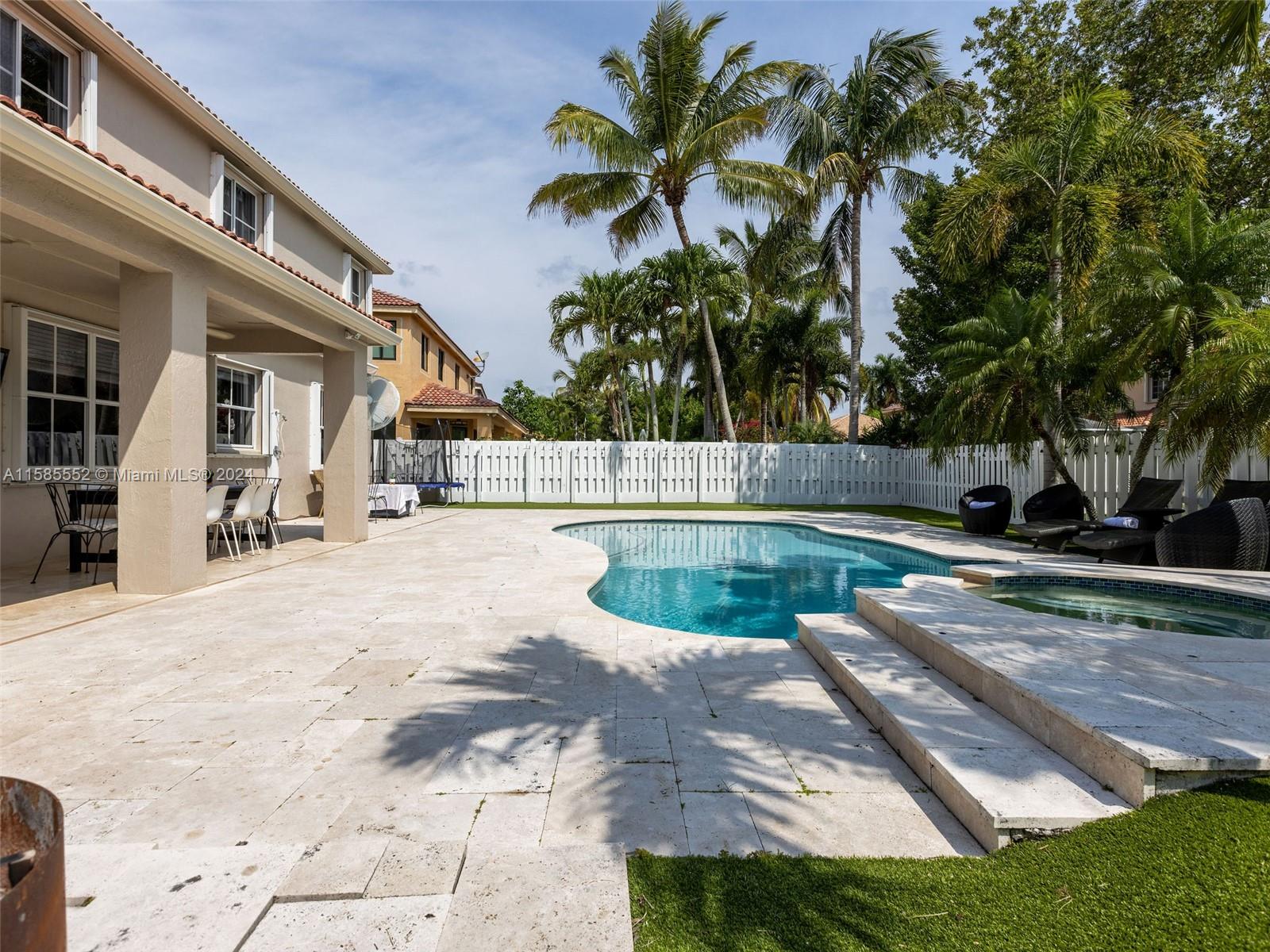 Amazing 5 BEDROOM PLUS OFFICE Home at The Meadows, one of Weston's gated communities! Double height ceilings in living room and family room, great floor plan, full of light, spacious kitchen with an island, perfect for entertaining! Family room with volume ceilings overlooking spacious backyard with amazing palm trees, renovated pool and spa, beautiful modern travertine pavers, covered patio plus awning, great for family events! 1 bedroom and 1 full bathroom on first floor, ideal for guests. 2nd floor primary bedroom with his and hers walk-in closets plus attached room perfect for office/gym/dream closet. Big 3 car garage and more parking space on driveway. Community offers pool, playground and sports court. A + Weston schools: Gator Run Elem., Falcon Cove Middle School, Cypress Bay High.