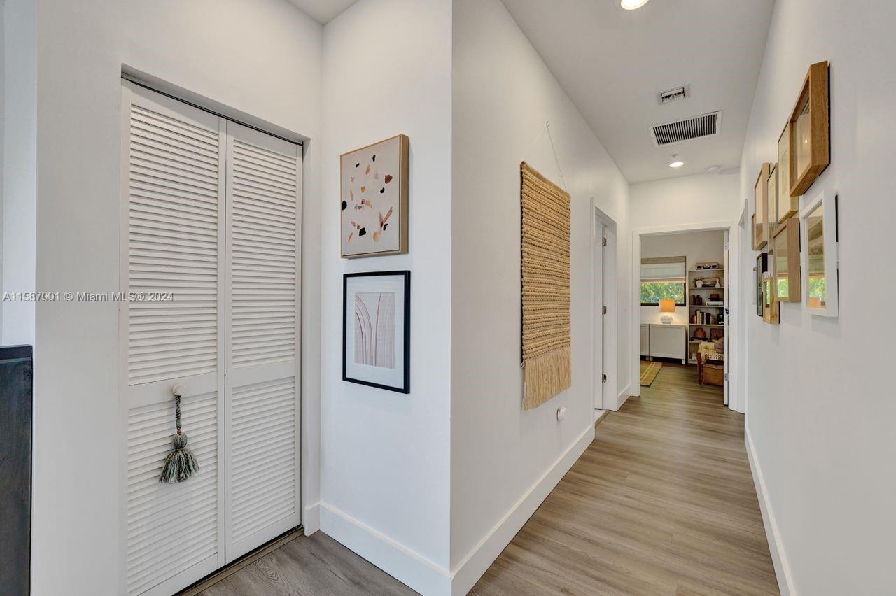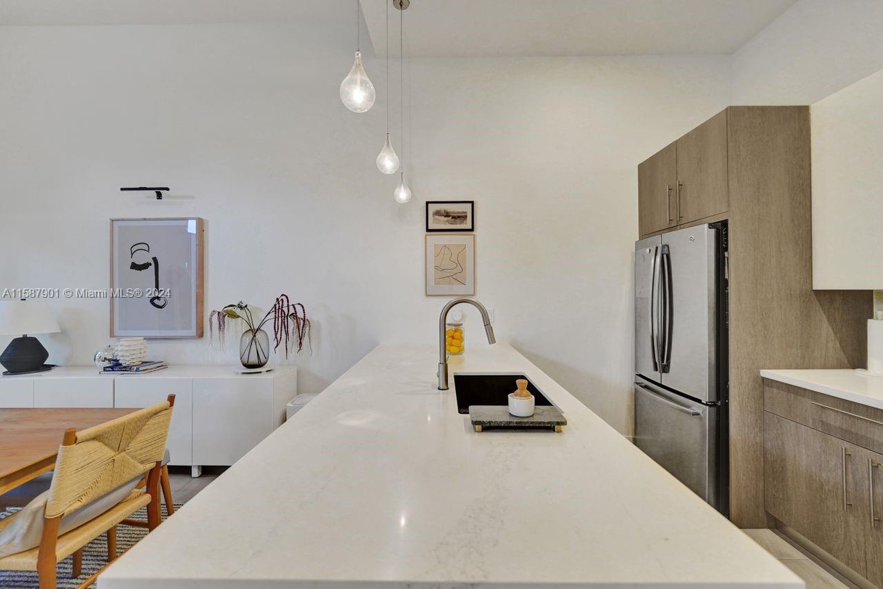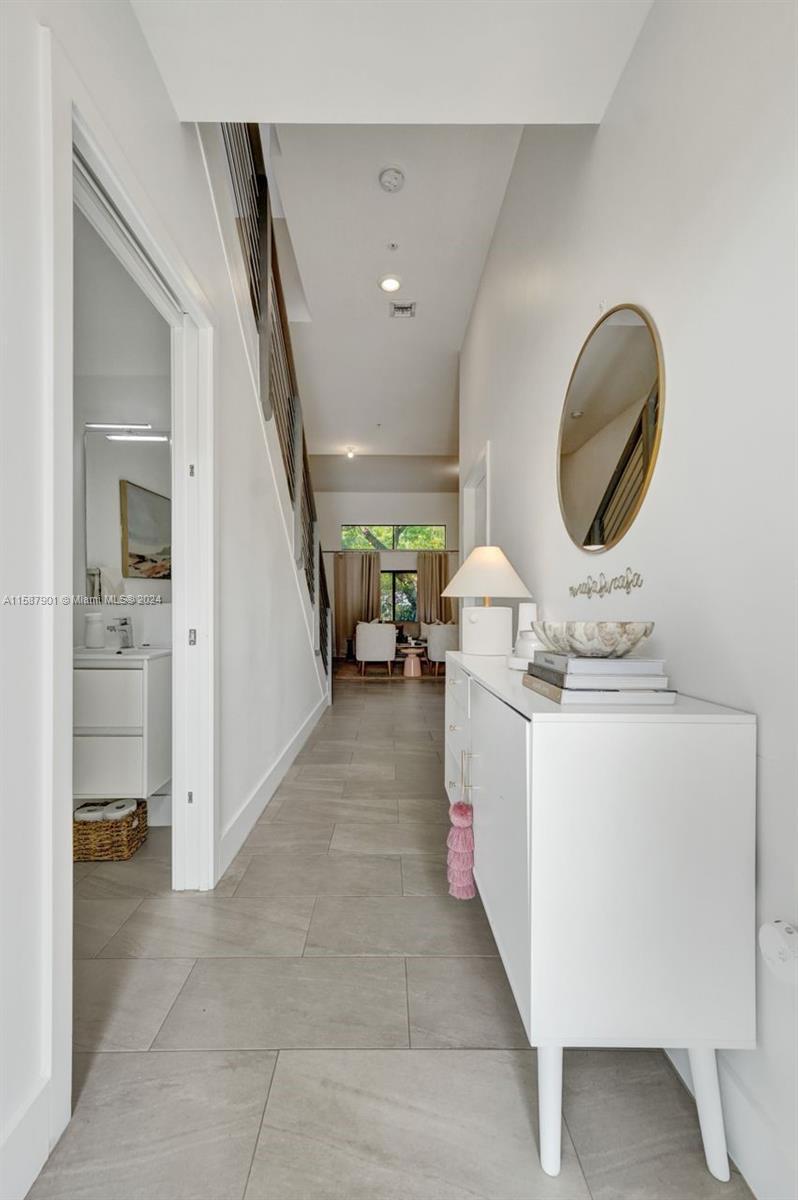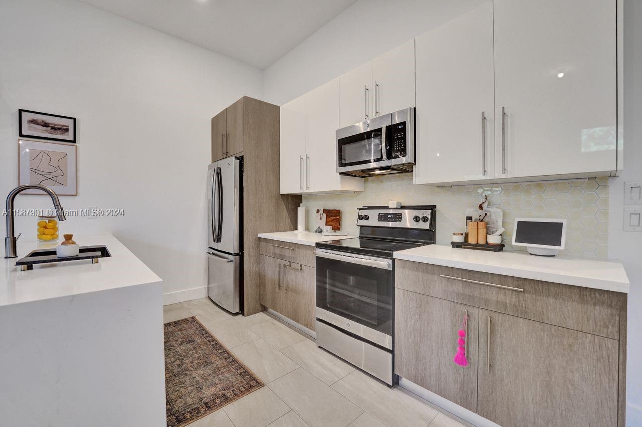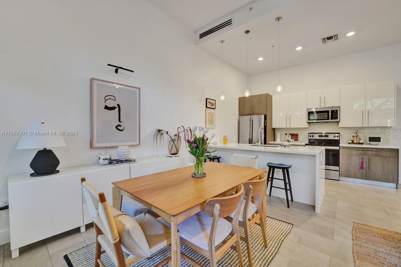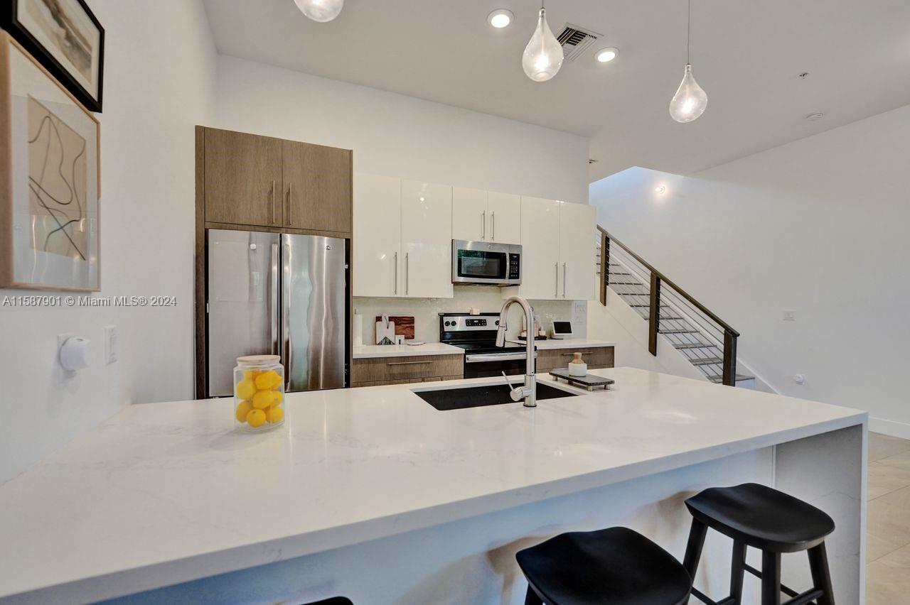 Modern townhouse in gated community of Strata Plantation. 1616SF, 2-story, 3BR/2.5BA/1-car. Foyer entry leads to 12’ ceilings & open floorplan-seamlessly connects living area. Redesigned kitchen boasts European cabinets & new waterfall quartz countertop island. LR/FR opens to private patio. Contemporary staircase w/sleek metal details to upper level & new LVP floors. Serene owner's suite: veranda for outdoor enjoyment, walk-in closet & a spa-like bath w/double vessel sinks, LED vanity lights & frameless shower w/pebble mosaic floor. Impact windows & low HOA. Amenities: clubroom, gym, lounge, play areas, dog park, trails+. Easy access to Turnpike/441/I-95 Don’t miss the opportunity to own this exquisite townhouse that perfectly blends modern design with functional living. No rental 1st year