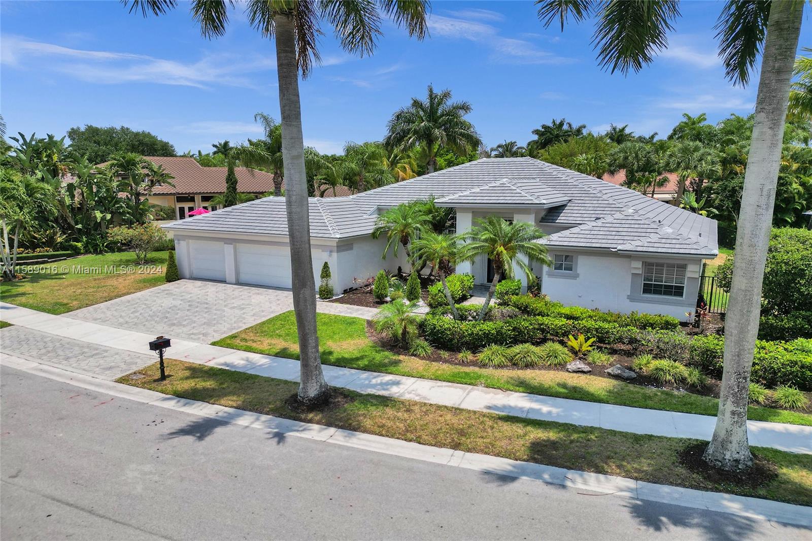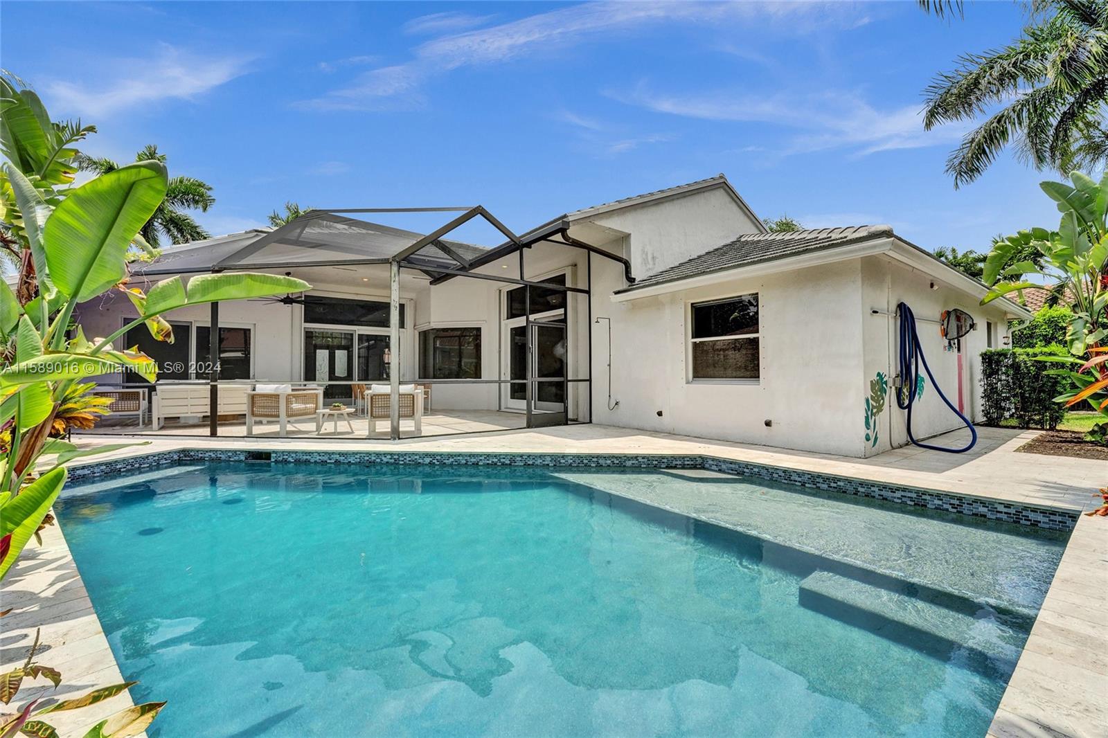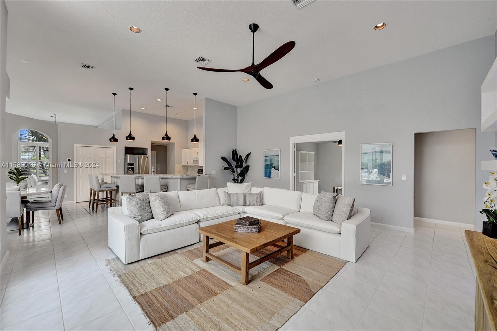 Welcome to this exquisite 5-bed, 3-bath residence in the prestigious Weston Hills CC. This beautifully designed home seamlessly blends elegance with modern convenience, featuring an open-concept layout, soaring volume ceilings, and stylish plantation shutters. The newly renovated primary bathroom, bright white kitchen showcases stunning marble countertops and stainless steel appliances. Bamboo wood flooring enhances the bedrooms, with tile floors throughout the main living areas. Recent updates include a 2022 roof, new A/C, impact sliding doors, accordion shutters, and a 3-car garage. Step outside to the screened patio and enjoy the serene saltwater pool with a sun shelf and fountains set against a travertine pool deck within a fully fenced yard. Optional furniture purchase is available.