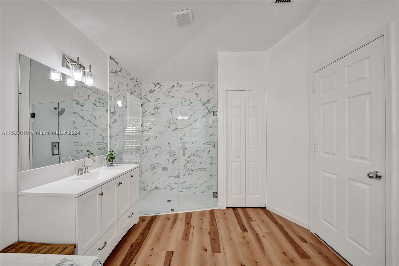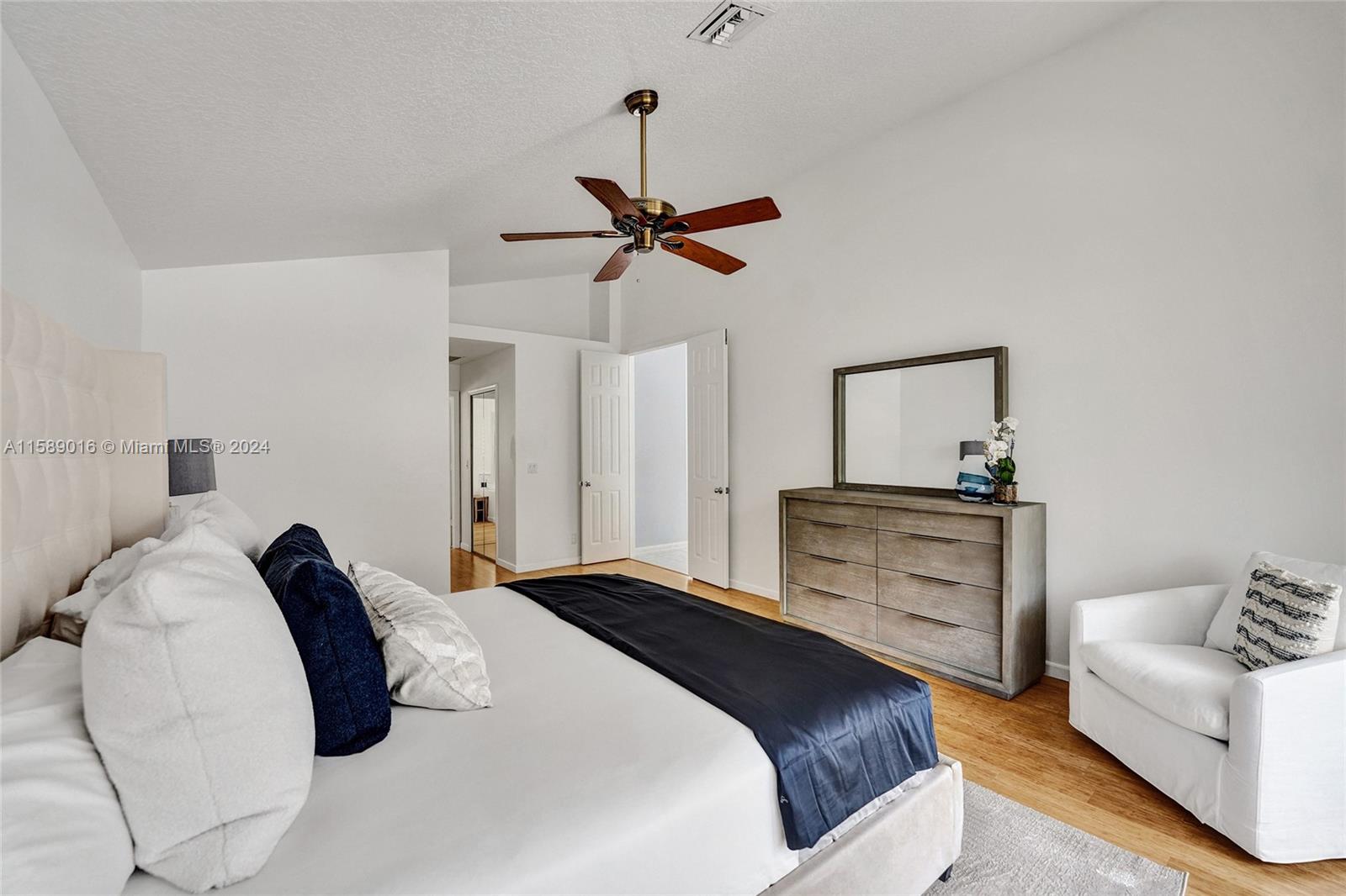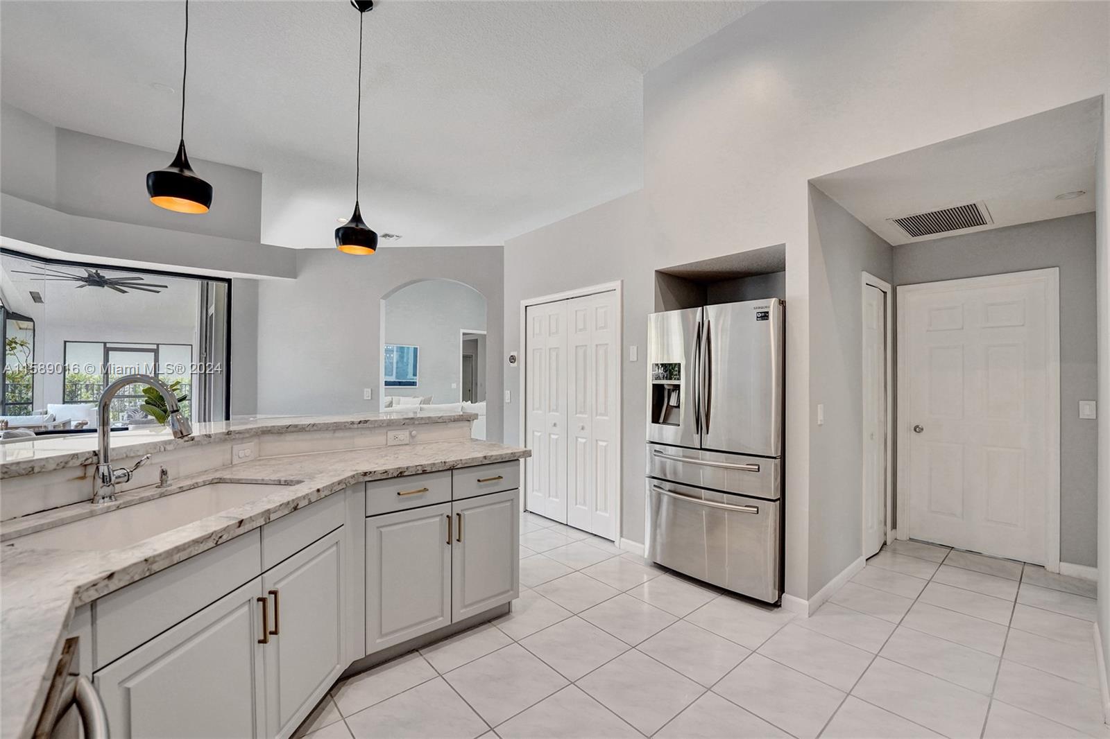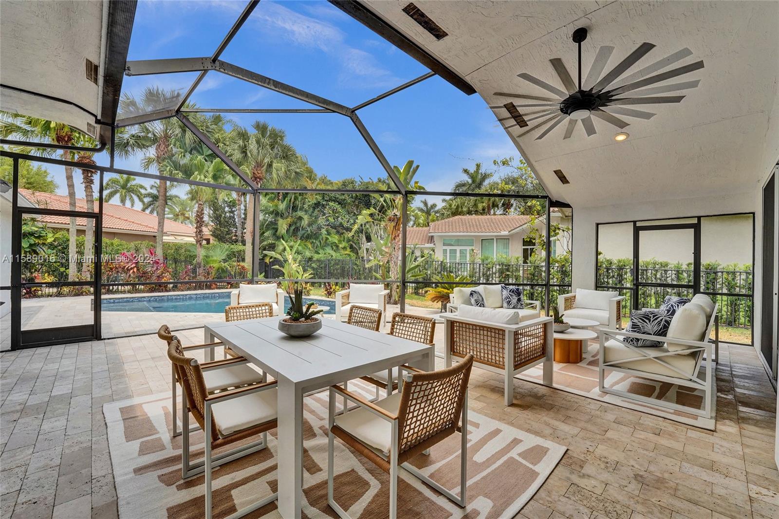 Welcome to this exquisite 5-bed, 3-bath residence in the prestigious Weston Hills CC. This beautifully designed home seamlessly blends elegance with modern convenience, featuring an open-concept layout, soaring volume ceilings, and stylish plantation shutters. The newly renovated primary bathroom, bright white kitchen showcases stunning marble countertops and stainless steel appliances. Bamboo wood flooring enhances the bedrooms, with tile floors throughout the main living areas. Recent updates include a 2022 roof, new A/C, impact sliding doors, accordion shutters, and a 3-car garage. Step outside to the screened patio and enjoy the serene saltwater pool with a sun shelf and fountains set against a travertine pool deck within a fully fenced yard. Optional furniture purchase is available.