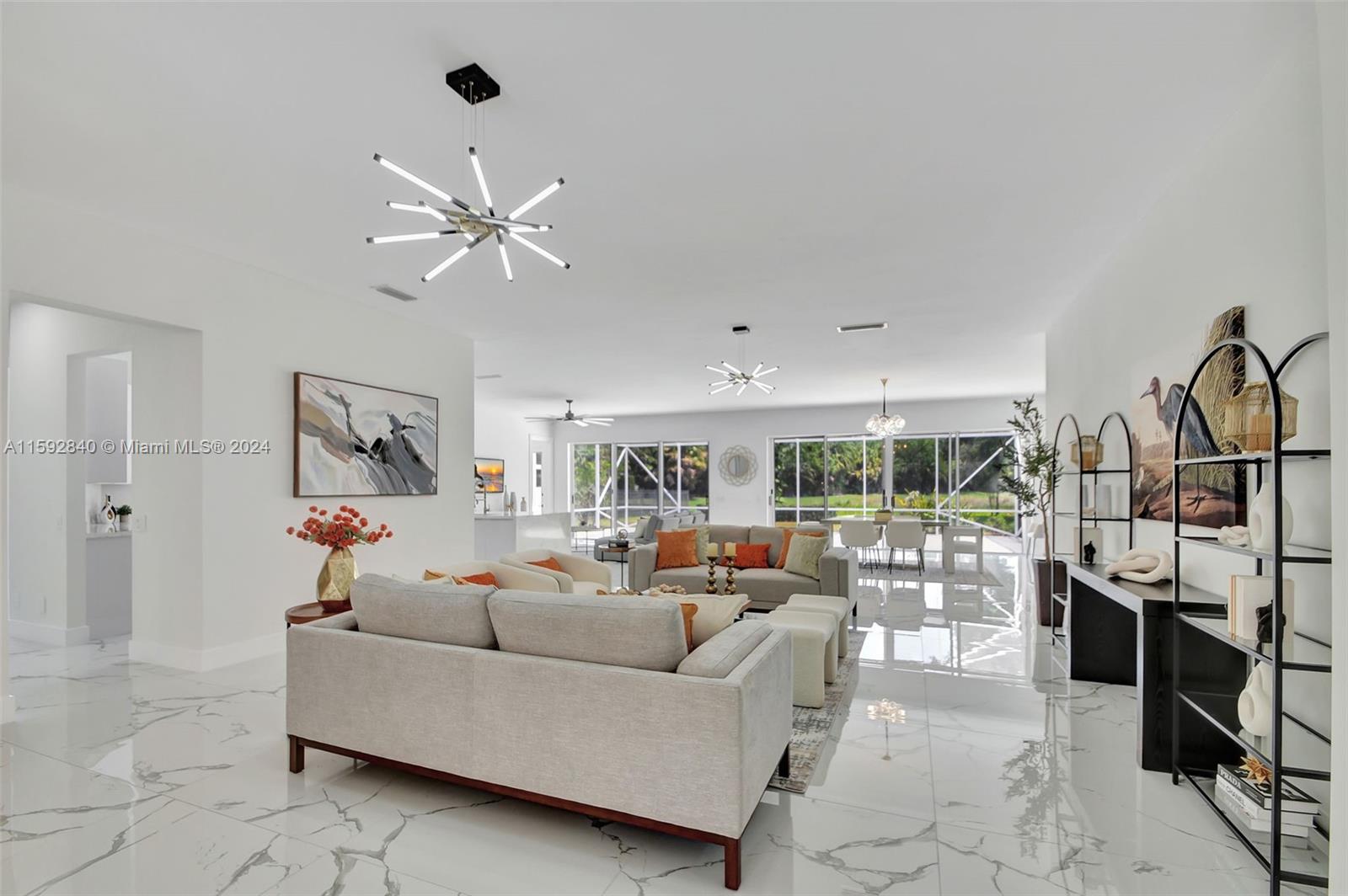 IT IS STUNNING.! OPEN FLOOR PLAN UPDATED IN 2024. This Home has 4 BEDS, 3.5 BATHS, 3-CAR GARAGE. Attention to the Details & Features, LED Mirrors, Freestanding Bath Tub, NEW Kitchen & Baths Custom soft-close Cabinetry, with EXOTIC QUARTZ Counter Tops, including a WATERFALL KITCHEN ISLAND, NEW High-end S.S Appliances Kitchen Aid, Full Laundry with New Machines, Beautiful & Neutral color 40in x 40in Porcelain Title throughout the entire House, the Main room has an incorporate room that you can set as a Seating Area, Reading, Den or Office. It's Screened Patio with LAKE VIEW, the perfect spot for alfresco DINNING or for enjoying the peace and quiet of nature in FL lifestyle , or if you prefer, there's plenty room to add your own pool/spa, or home Ice Baths according to your specifications.
