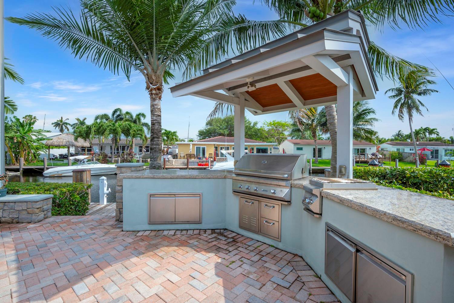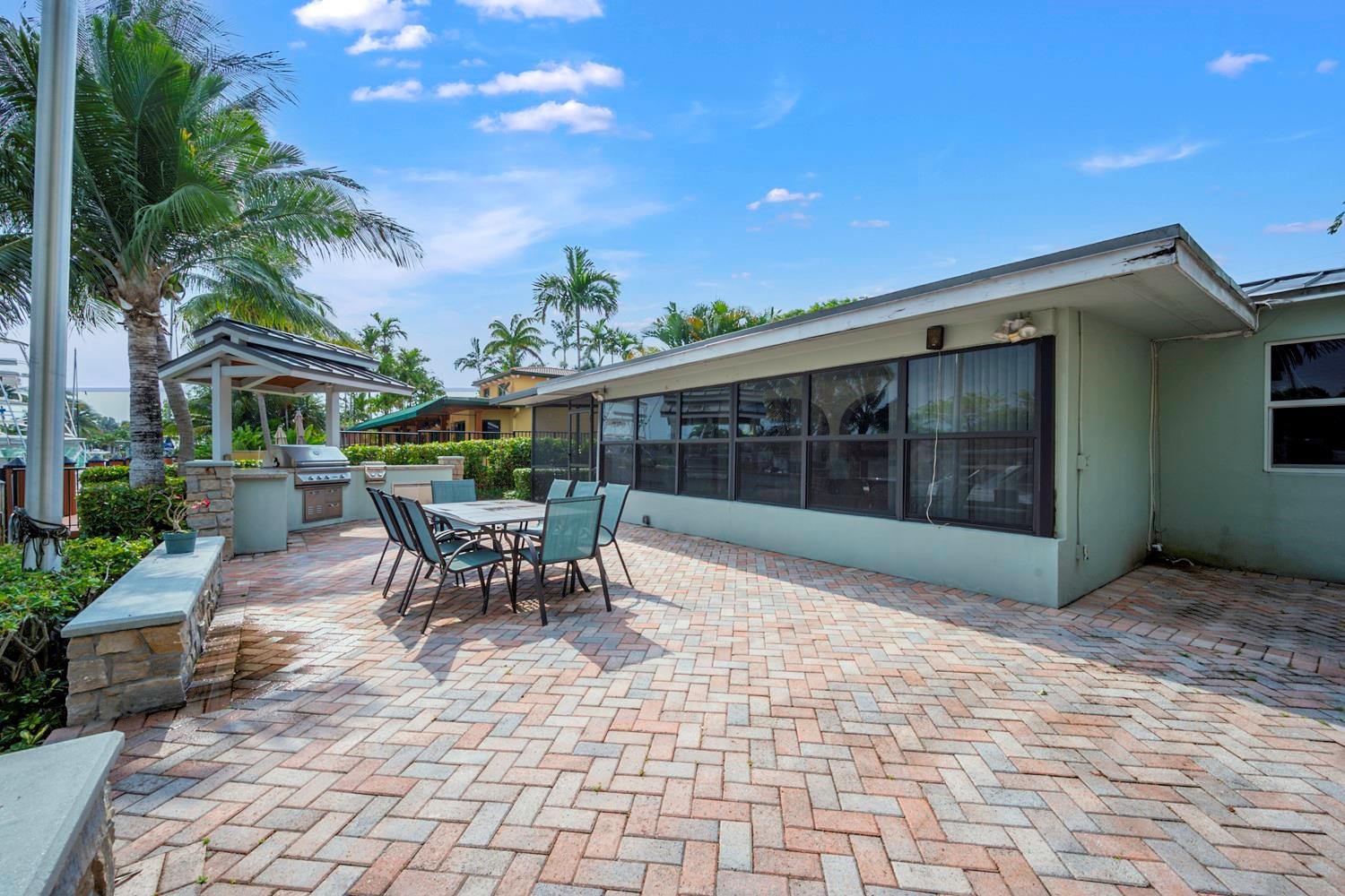 This home offers a peaceful waterfront view with 65 feet of deep-water unrestricted ocean access in the vibrant boating community of Citrus Isles. The property has an exceptional outdoor living space, complete with an outdoor kitchen, a brick paver deck with space for a pool, and a newer wood dock surrounded by palm trees. Perfect for enjoying sunsets and water views. Inside is a Florida room, 2 bedrooms, and 2 full bathrooms. The home is conveniently located just minutes from downtown, high-end shops and restaurants on Las Olas, I-95, I-595, hospitals, and award-winning beaches. Stunning new and recently renovated homes surround it—no HOA fees.