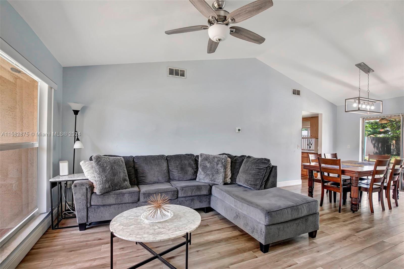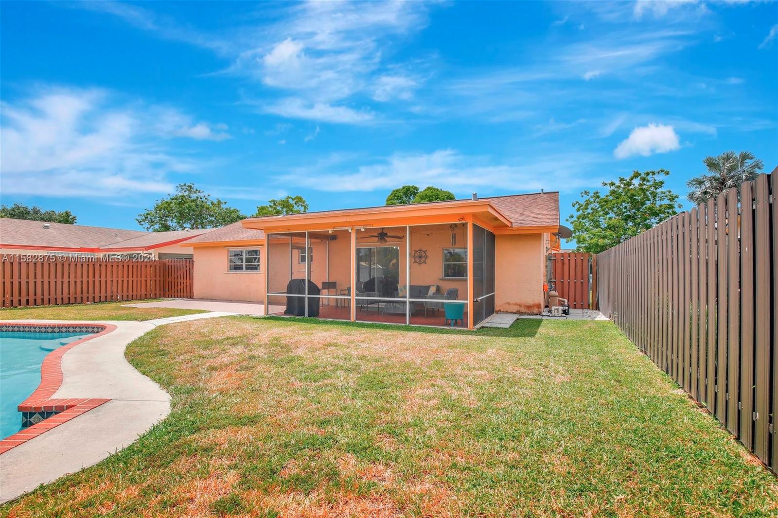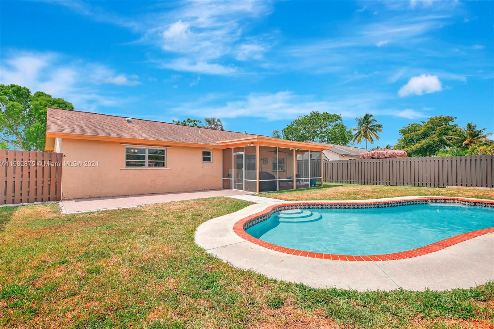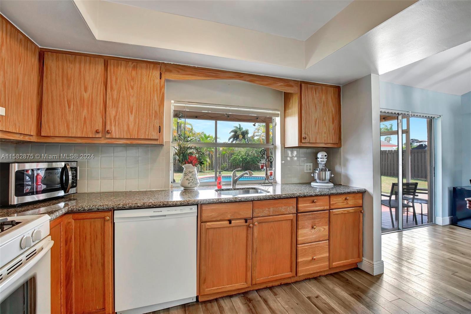 Fantastic 3 bed/2 bath pool home in Sunrise Golf Village! Open floorplan w/ vaulted ceilings & recessed lighting. Beautiful laminate flooring throughout living areas and bedrooms. Large kitchen features wood cabinetry & granite countertops. Circular driveway. Large yard completely fenced! AC (2019). Gas Water heater (2020). Washer/dryer (2020). Impact rated garage door & panel hurricane shutters. Primary bath vanity replaced in 2022. New dishwasher (2024). Screened in porch. No HOA!!!