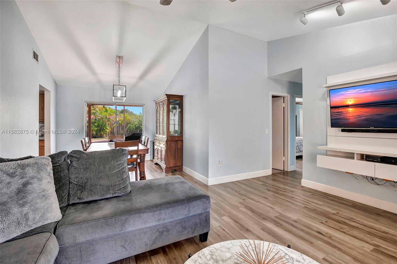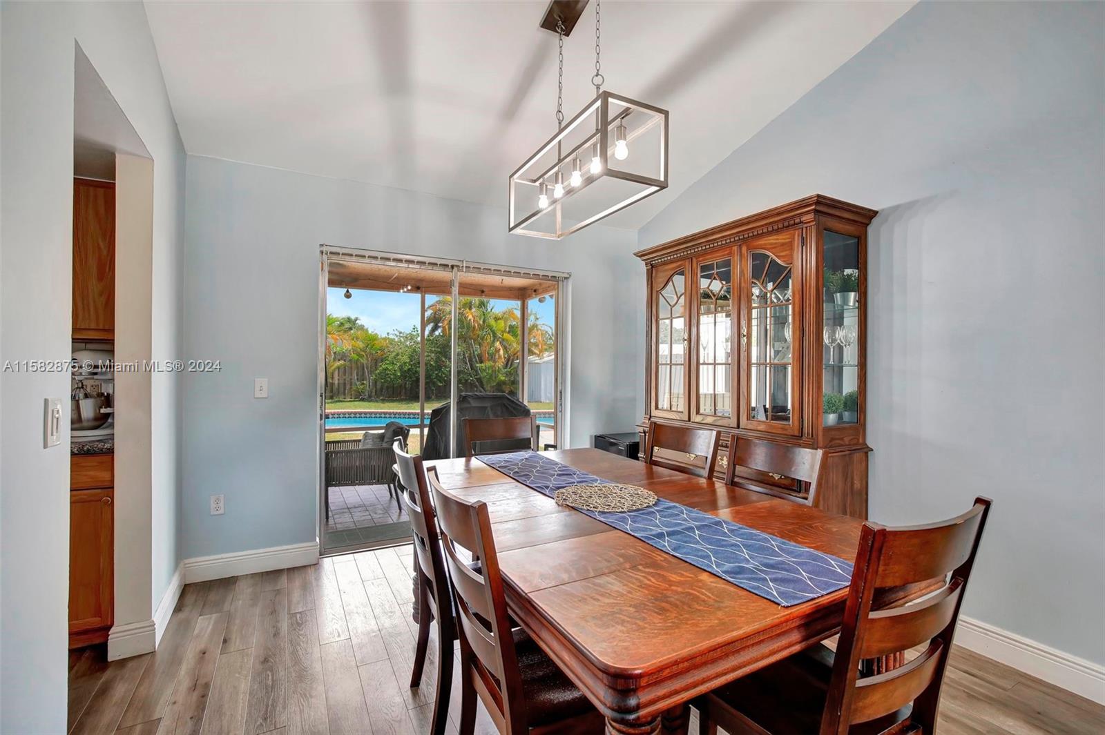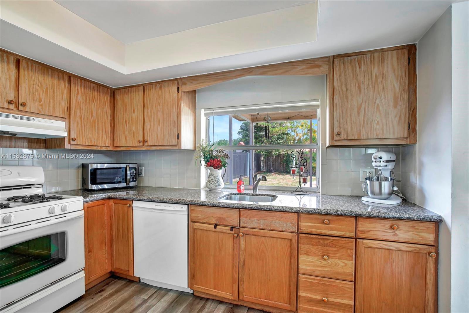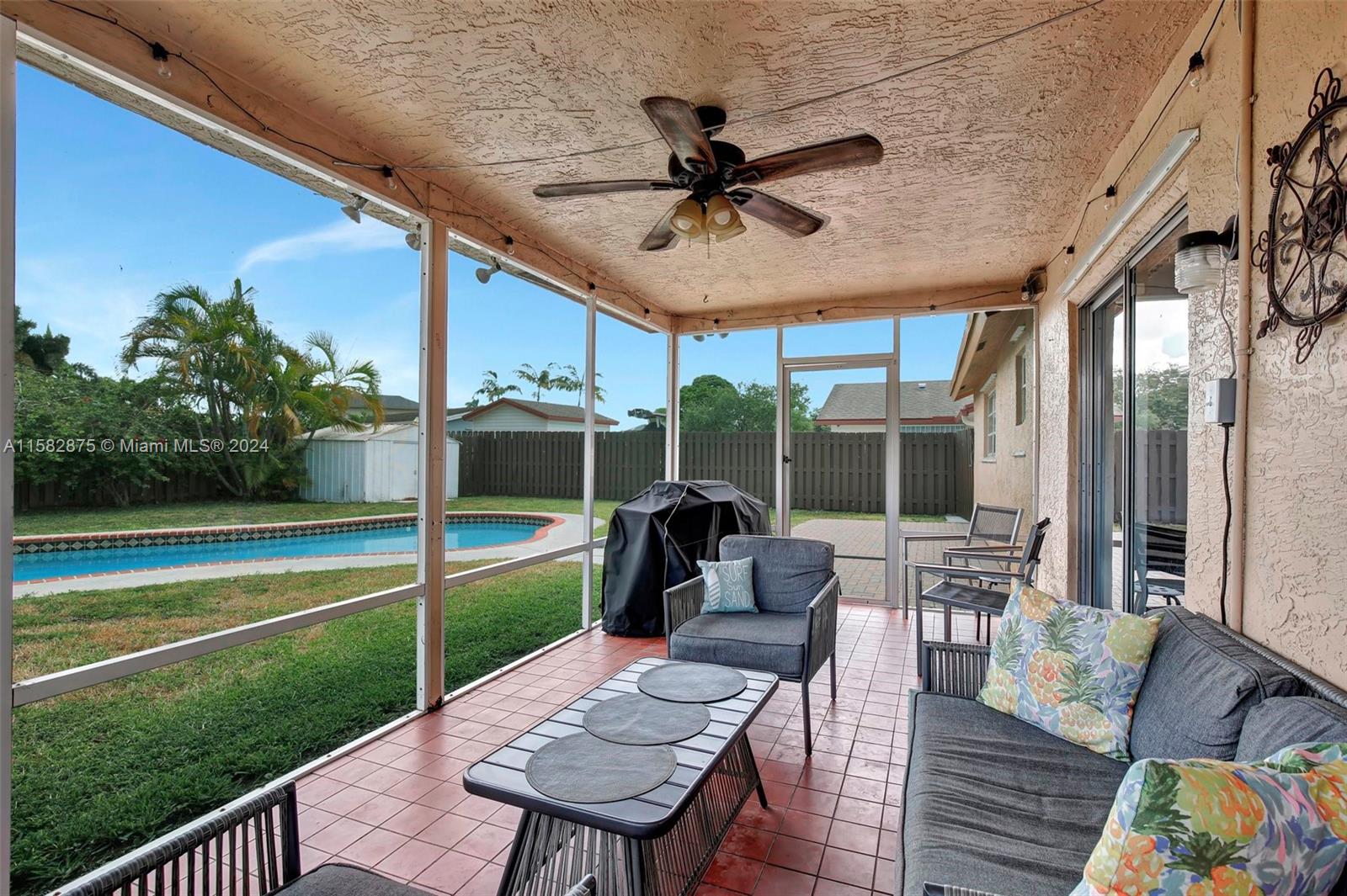 Fantastic 3 bed/2 bath pool home in Sunrise Golf Village! Open floorplan w/ vaulted ceilings & recessed lighting. Beautiful laminate flooring throughout living areas and bedrooms. Large kitchen features wood cabinetry & granite countertops. Circular driveway. Large yard completely fenced! AC (2019). Gas Water heater (2020). Washer/dryer (2020). Impact rated garage door & panel hurricane shutters. Primary bath vanity replaced in 2022. New dishwasher (2024). Screened in porch. No HOA!!!