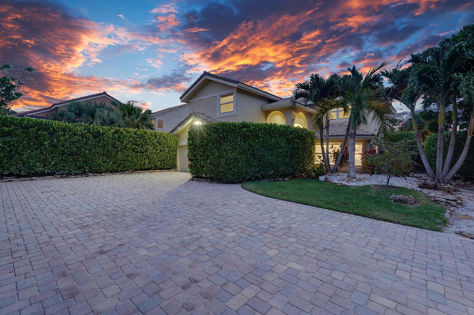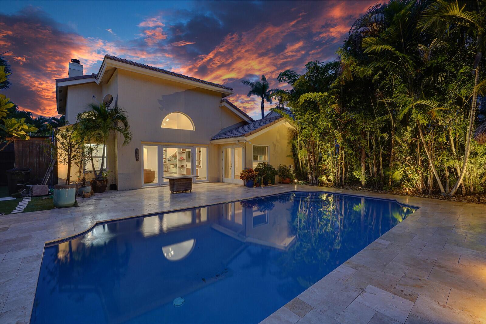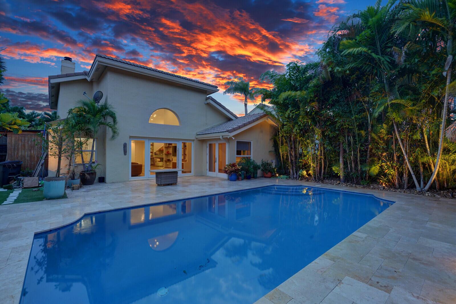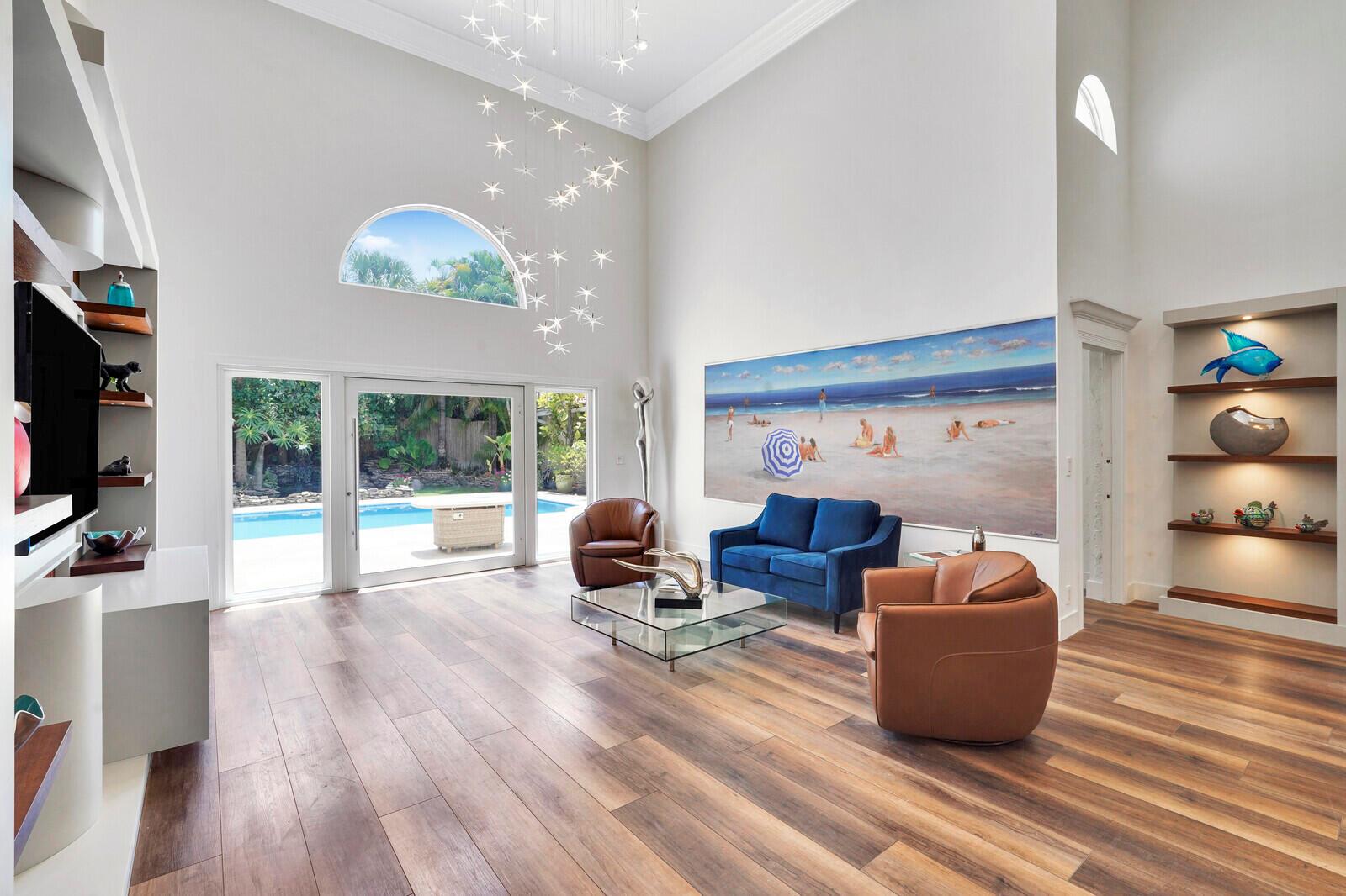 WATCH THE NARRATED VIDEO! Welcome home to the ideal blend of comfort and elegance! Nestled in a tranquil, private cul-de-sac in desirable West Boca Raton, this stunning 4-bedroom, 2.5-bathroom house offers 2573 square feet of beautifully renovated living space, designed to cater to refined tastes and practical needs. Step inside to be greeted by soaring 20-ft ceilings, an inviting dining room complete with a charming brick fireplace, a separate bar/lounge, and spacious living room. Primary suite is conveniently located on the main floor. The interior showcases custom lighting and unique artwork, setting a striking backdrop for everyday living. Luxuriate in the chef's kitchen, equipped with marble countertops, and explore the spacious bonus room perfect for a home office, wine room, study