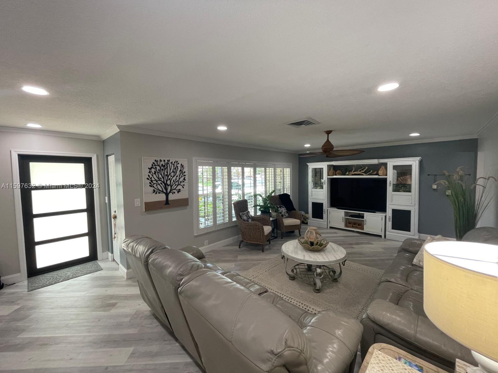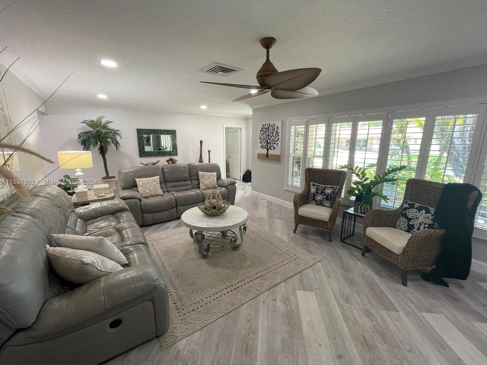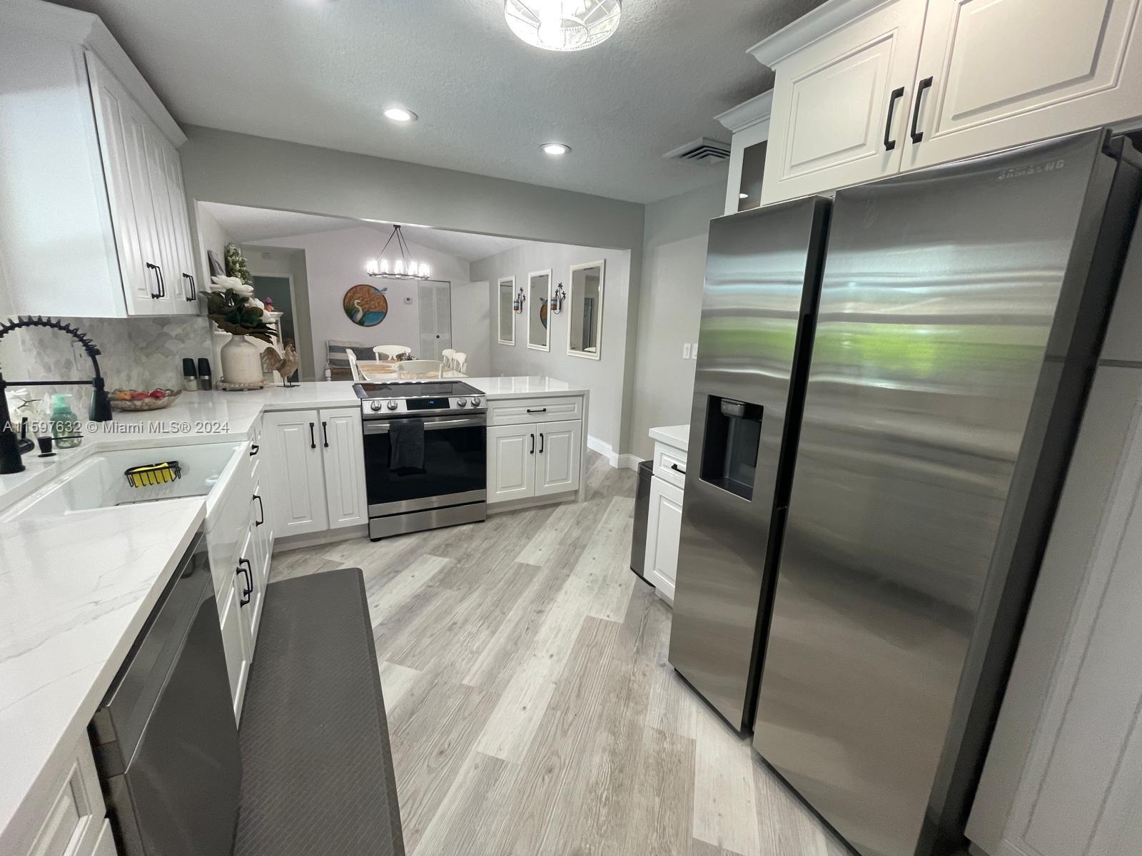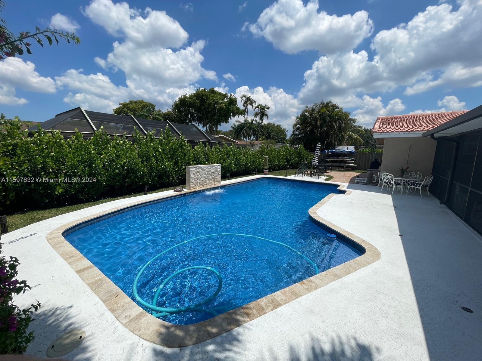 Indulge in luxury living with this stunning 4-bed, 2-bath home boasting a pristine pool & captivating waterfall feature. Meticulously renovated, the gourmet kitchen showcases quartz countertops & stainless steel appliances, ensuring every detail exudes opulence. Whether hosting lavish gatherings in the expansive living room or enjoying outdoor bliss on the lanai overlooking the 8-ft-deep crystal-clear marcite pool, complete with a convenient cabana bathroom, every moment is imbued in elegance. Retreat to the private master en-suite with walk-in closet, while the split bedroom layout offers both comfort & privacy. 2-car garage featuring laundry facilities & extra refrig, everyday living is effortlessly elevated. Near shopping, fine dining. NO HOA. Welcome home to unparalleled luxury.