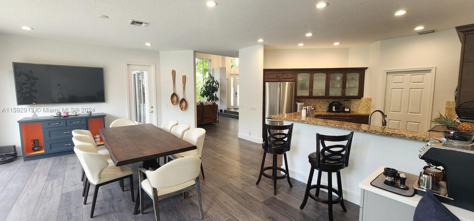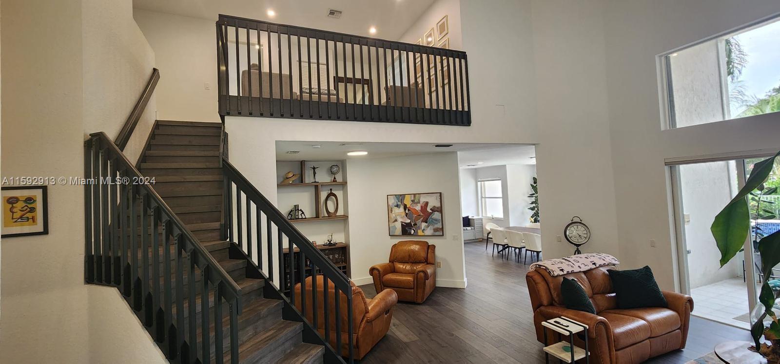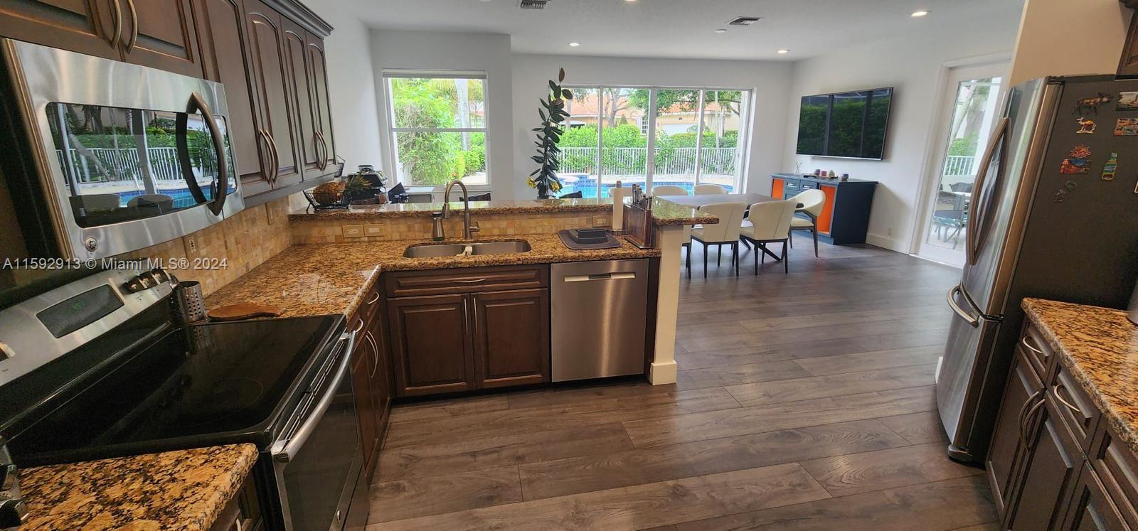 Beautifully, renovated 4 bed/ 3 bath Pool Home on an oversized corner lot in the prestigious gated golf community of Eagle Trace. Featuring an open layout w/hight ceilings plenty of natural light. Spacious living and dining room. Large Kitchen w/adjoining family room overlooking the pool and backyard, features granite countertops, S/S appliances, wood cabinets, pantry and breakfast bar. Offers a convenient bedroom & a full bath downstairs. The stairwell opens to spacious loft & a huge master suite w/open balcony overlooking the pool; walking-in closets and ensuite bath w/his and her vanities, roman tub, and separate shower. Large fenced pool and screened patio. Accordion shutters. Hurricane resistant garage door. Close to shops, restaurants and A-rated schools. Low HOA! No approval needed.