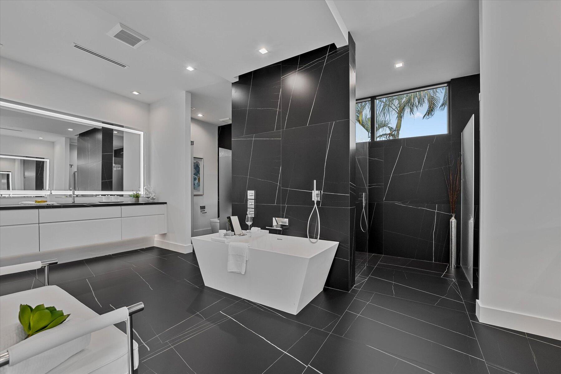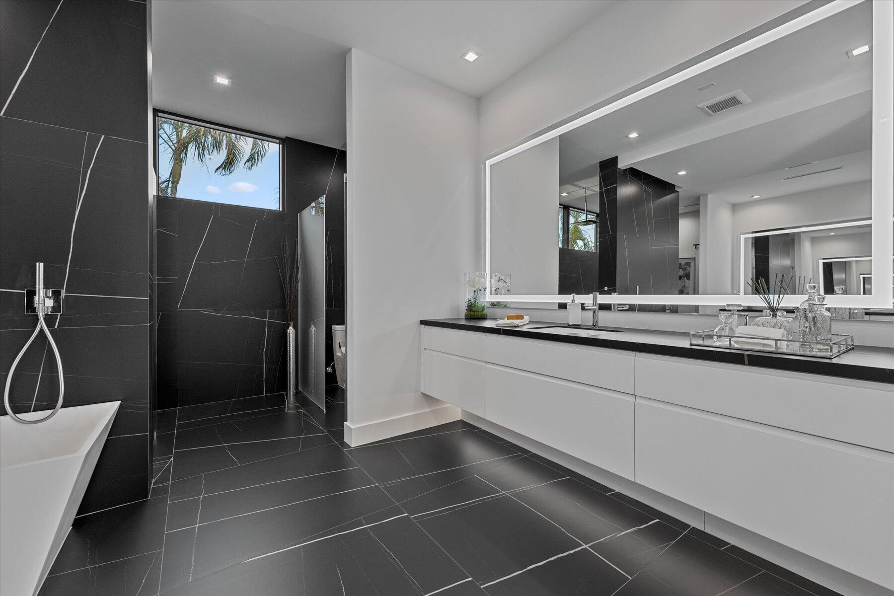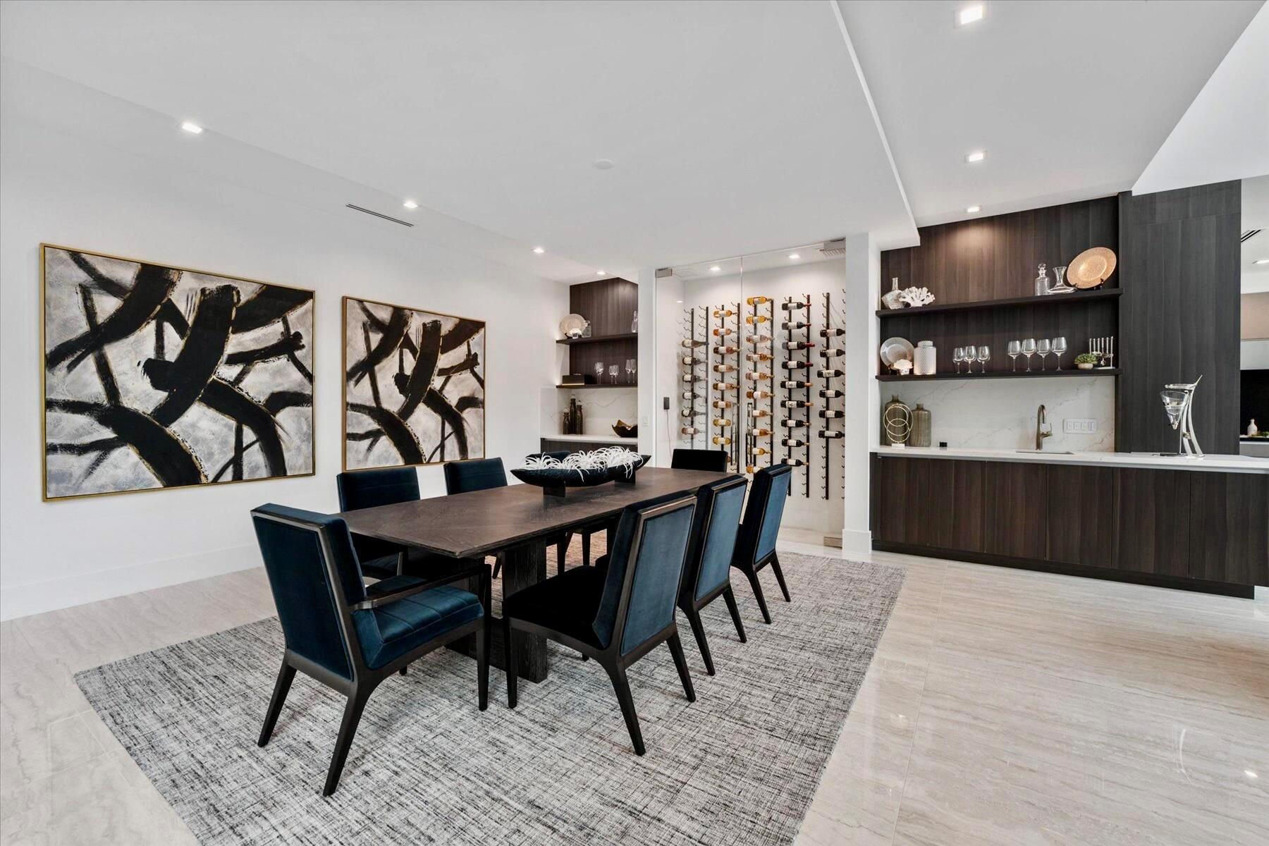 Welcome to a haven of luxury living, where every detail has been meticulously crafted to create a residence of unparalleled elegance. Situated on an oversized 15,000 sq ft lot, this magnificent home boasts a total of 9699 sq ft, with 6,557 sq ft under air. As you step through the 24 ft entryway, the grandeur of the home unfolds with a glass stairway railing that adds a touch of contemporary sophistication. The impact windows and doors throughout not only enhance the aesthetic appeal but also provide a sense of security and tranquility. This residence features 5 bedrooms and 5 full baths, along with 2 half baths, including an outside cabana bath for added convenience. The custom-designed kitchen is a culinary masterpiece, showcasing Quartz counters and top-of-the-line