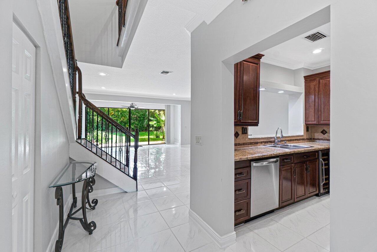 Welcome to 6366 Longboat Ln 105 Boca Raton. This spacious townhome consists of 3 bedrooms and 2 full bathrooms and 1 half bathroom. Tile floor throughout ground floor. Eat in kitchen with granite countertops and newer Refrigerator, dishwasher and wine fridge. New high hat lighting. Fresh interior paint. New thermostat. Half bath located on ground floor. Carpet on stairway and in 1 guest bedroom and master bedroom. Vinyl floor in 2nd guest bedroom. Sizable master bedroom with huge walk in closet along with a roomy ensuite bathroom. Master bath consists of walk in shower, soaking tub and dual vanity. This home has a 1 car garage and a nice backyard patio. Community has pool, tennis court and clubhouse. A+ school district.