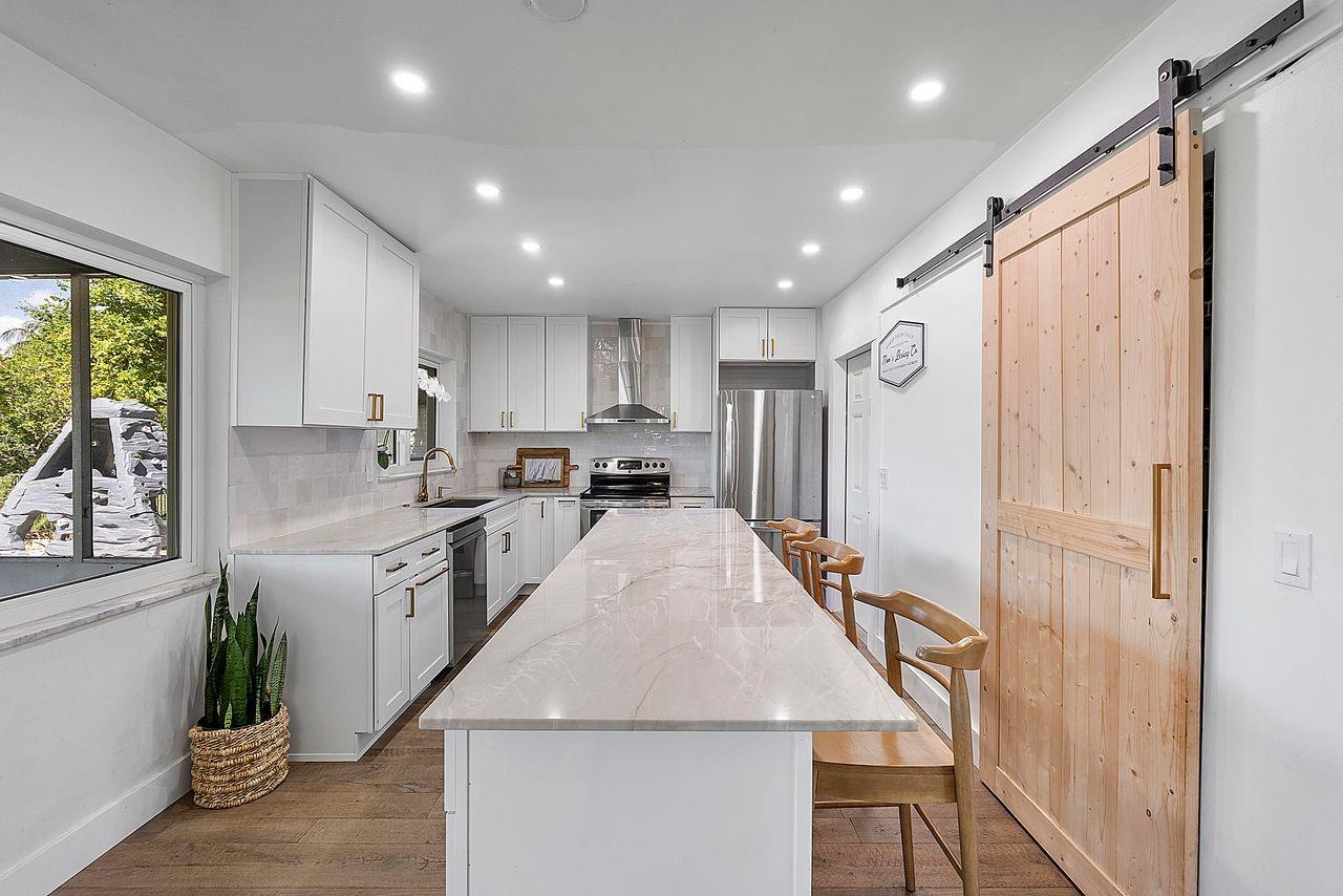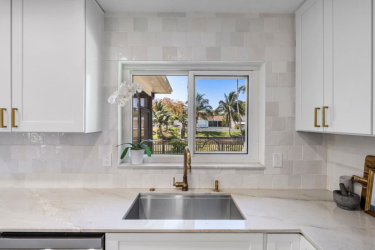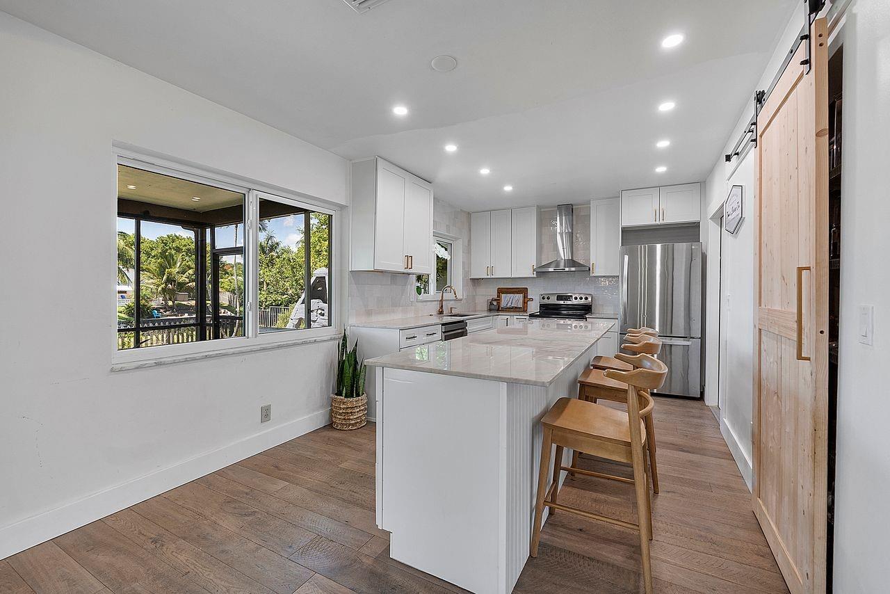 Fully remodeled 2-bedroom, 2-bathroom home in Golfview Harbour boasts a new kitchen with Quartzite countertops and an island, perfect for entertaining. The home features new organic hardwood floors from Italy throughout. Renovated bathrooms with new plumbing. Enjoy complete hurricane protection with high-impact windows throughout. A new RainSoft water filtration system serves the entire house, and the automatic sprinkler system draws water from the lake. Outdoor space is ideal for entertaining, with a open patio and a spacious backyard enclosed by a new wooden fence. The property sits on 80 feet of waterfront, connecting to Lake Ida/Eden/Osborne, perfect for boating, fishing, and paddleboarding. Golf carts, RVs, boats, and water toys are welcome in this close-knit, no-HOA community.