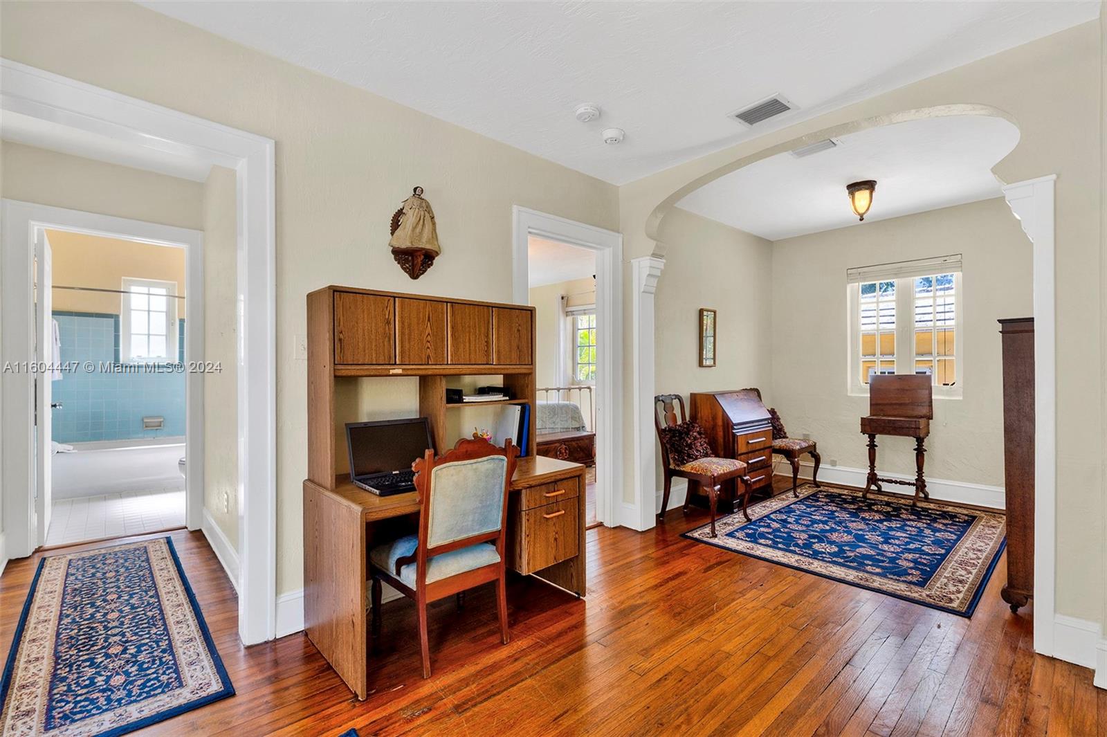 This classic Old Spanish is a true must see starting from roofed front porch entry! Gracious 36x15 ft living area with original fireplace opens to 20x13 ft dining room ideal for entertaining plus chef’s kitchen completely remodeled in 2009 with new expanded kitchen cabinets and island with granite counters. First floor includes 15x12 family room and 14x13 primary suite. Original oak floors. Second floor includes open area ideal for office/crafts/playroom, 2 large bedrooms and bath. Corner property has side street entry to 2 car garage building with upstairs 1/1 guest/in-law quarters. Just 3 blocks to Biltmore Hotel, golf and tennis, Youth Center and Venetian Pool. Short distance to Miracle Mile, Merrick Park and airport.