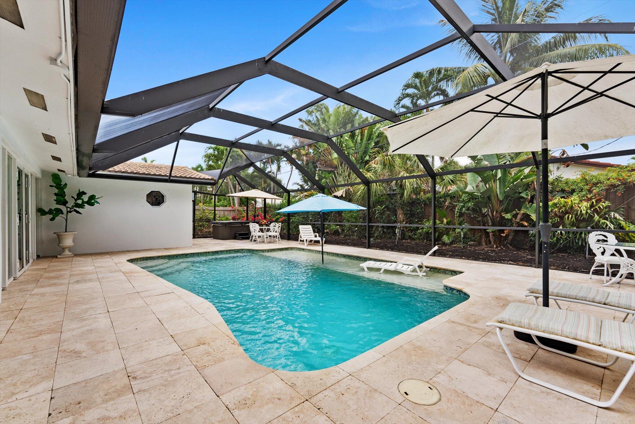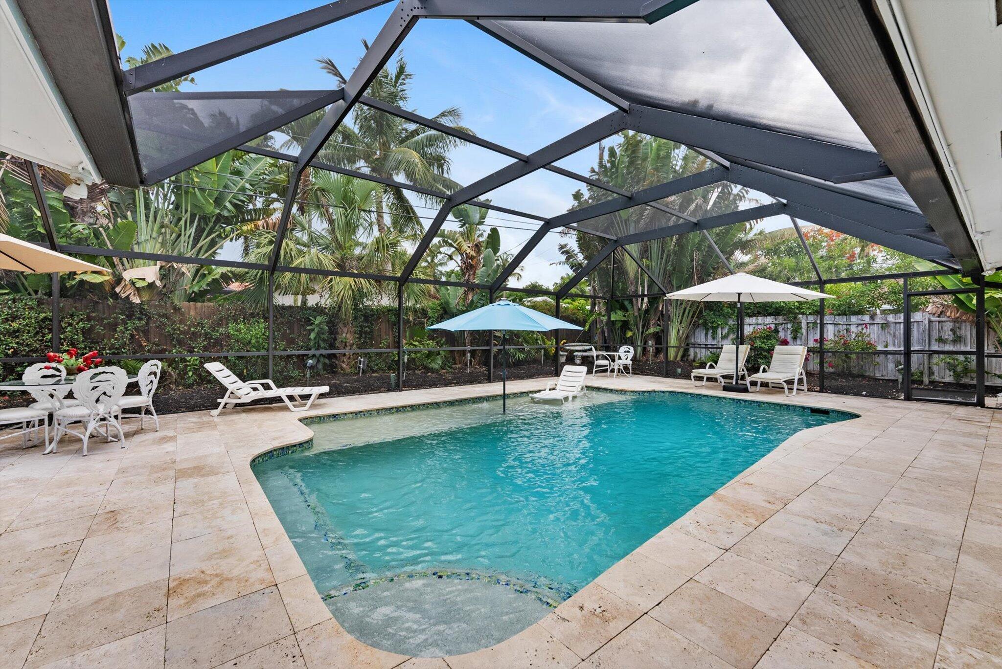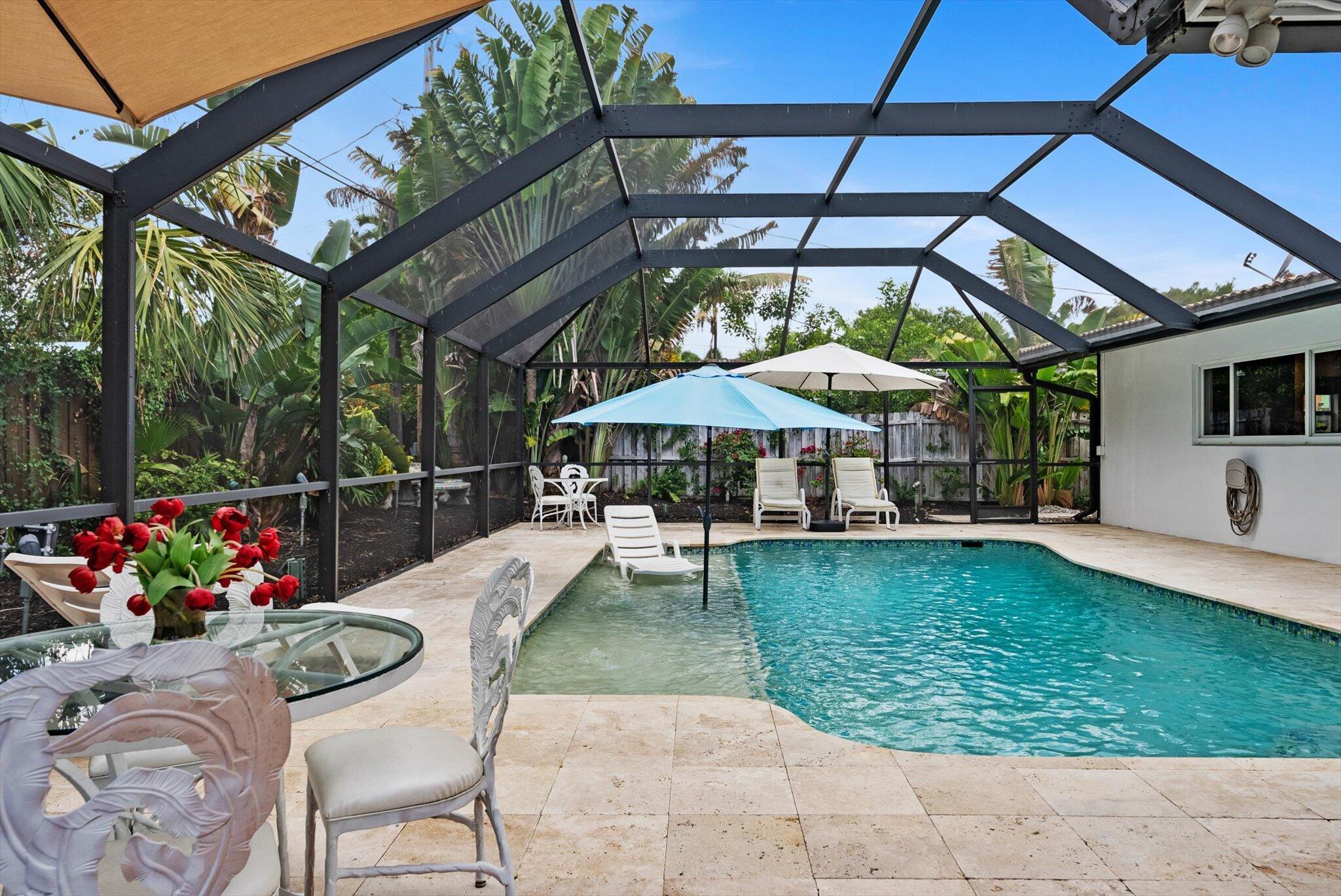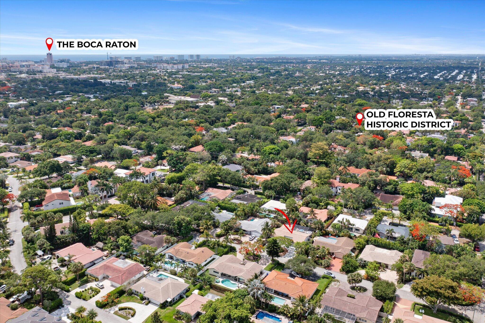 This charming 3/2 home is located in the highly desirable East Boca Raton community of Tunison Palms, a stones throw away from the magnificent Historic ''Old Floresta'' district, on a beautiful private, quiet street adorned with lush landscaping. The main living area is open and bright with a magnificent updated chef's kitchen featuring a caesarstone waterfall island, stainless steel appliances, custom Italian cabinetry, and brushed glass. The backyard is nothing short of an oasis, offering a custom salt-water pool with sun shelves and bubblers set on a travertine deck with an outdoor shower and hot tub, amidst numerous fruit and flower trees. The elegant Primary Bedroom, offers both an updated en-suite bathroom with steam shower, and a custom walk-in closet.Location! Location! Location!