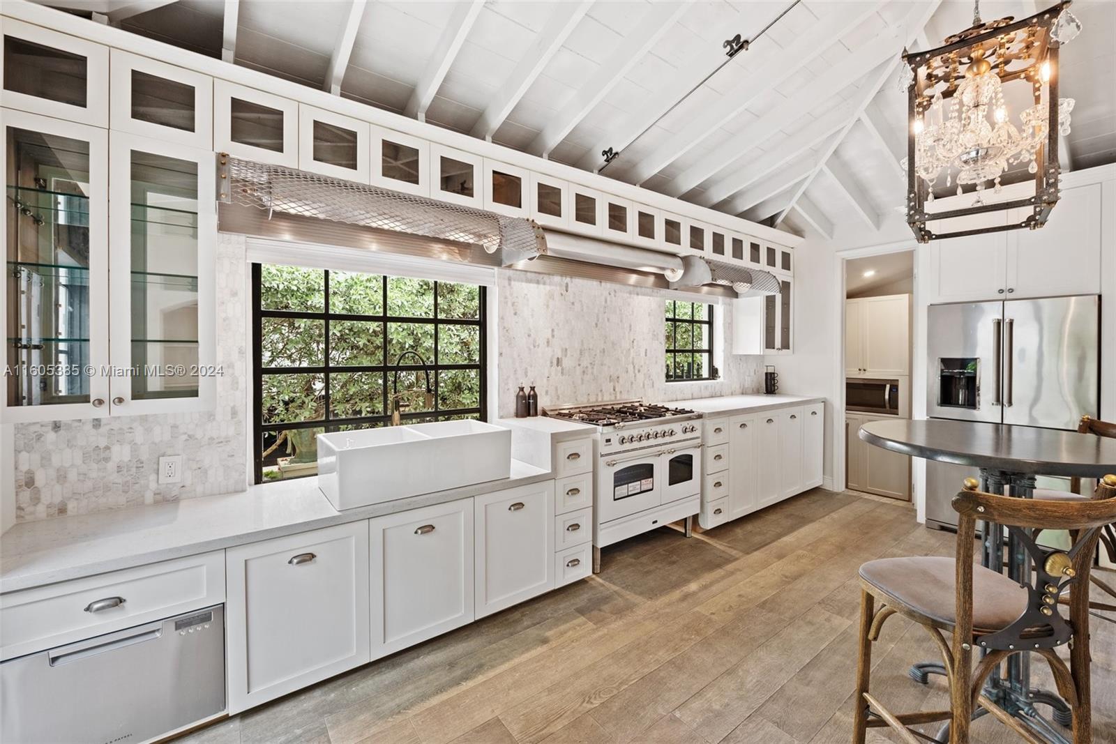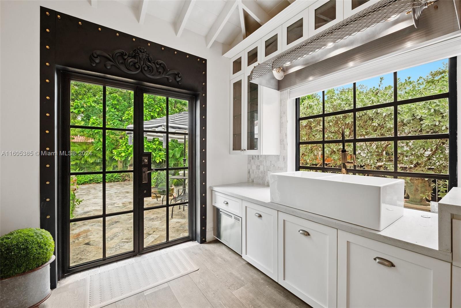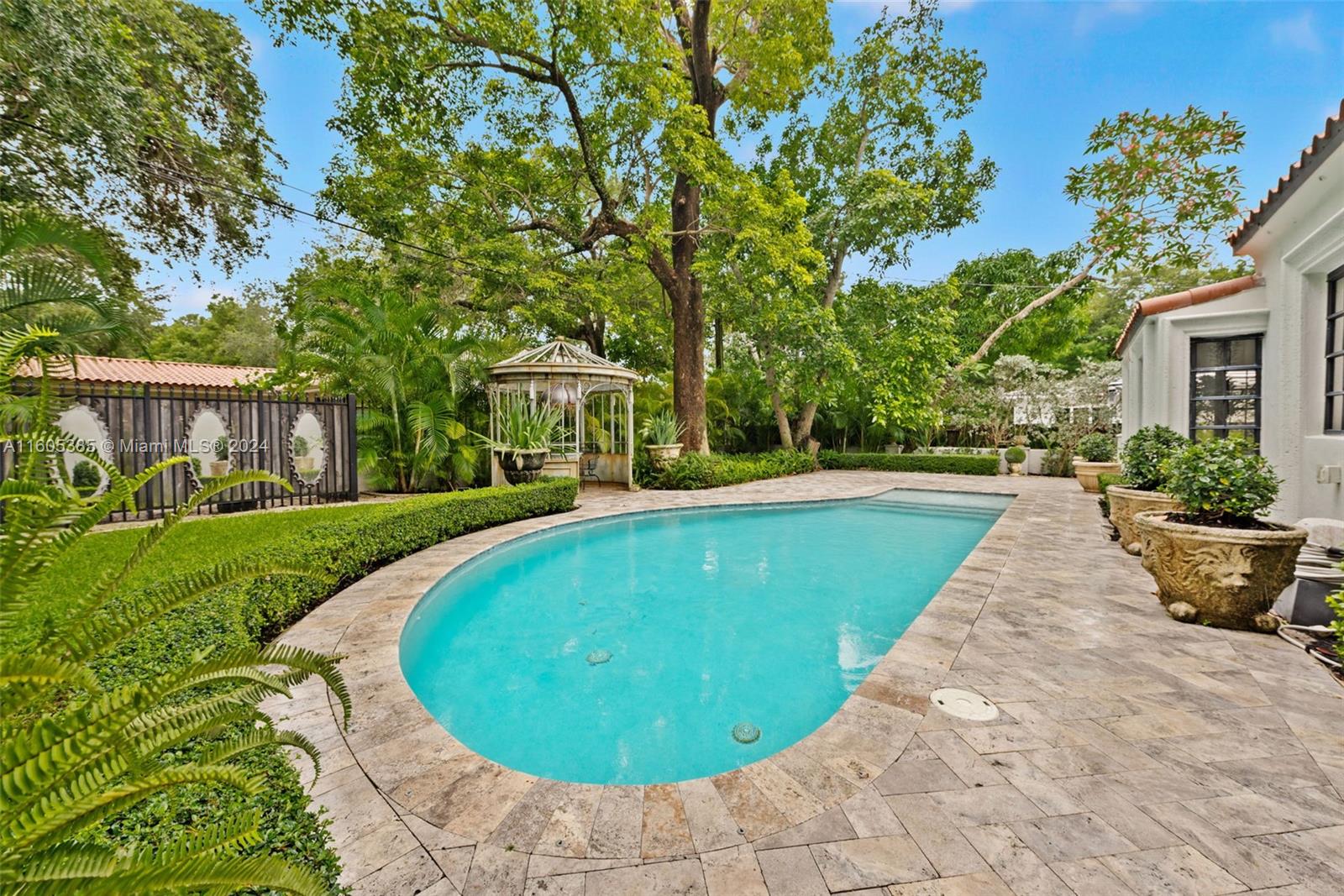 Feel like you transported into an elegant European Villa w this 3bed 2bath Miami Shores pool Home of Acclaimed Designer Nick Alain. Arrive to manicured landscape, step in & let your eyes admire the vaulted wood ceilings & design details. Veer left to the 3 bedrooms, the master suite uses a 2nd room as the master closet but can be converted back, bathrooms are tastefully designed w rain showers, top of the line tiles & hardware. To the right you find a beautiful kitchen equipped w a gas stove, farm sink & KitchenAid Fridge. Go out the french doors to the outdoor living oasis, enjoy the salt water pool, outdoor kitchen & lounge tables under the umbrella or gazebo. Garage under a/c & used as tv room. Approved plans for 500 sf family room addition.