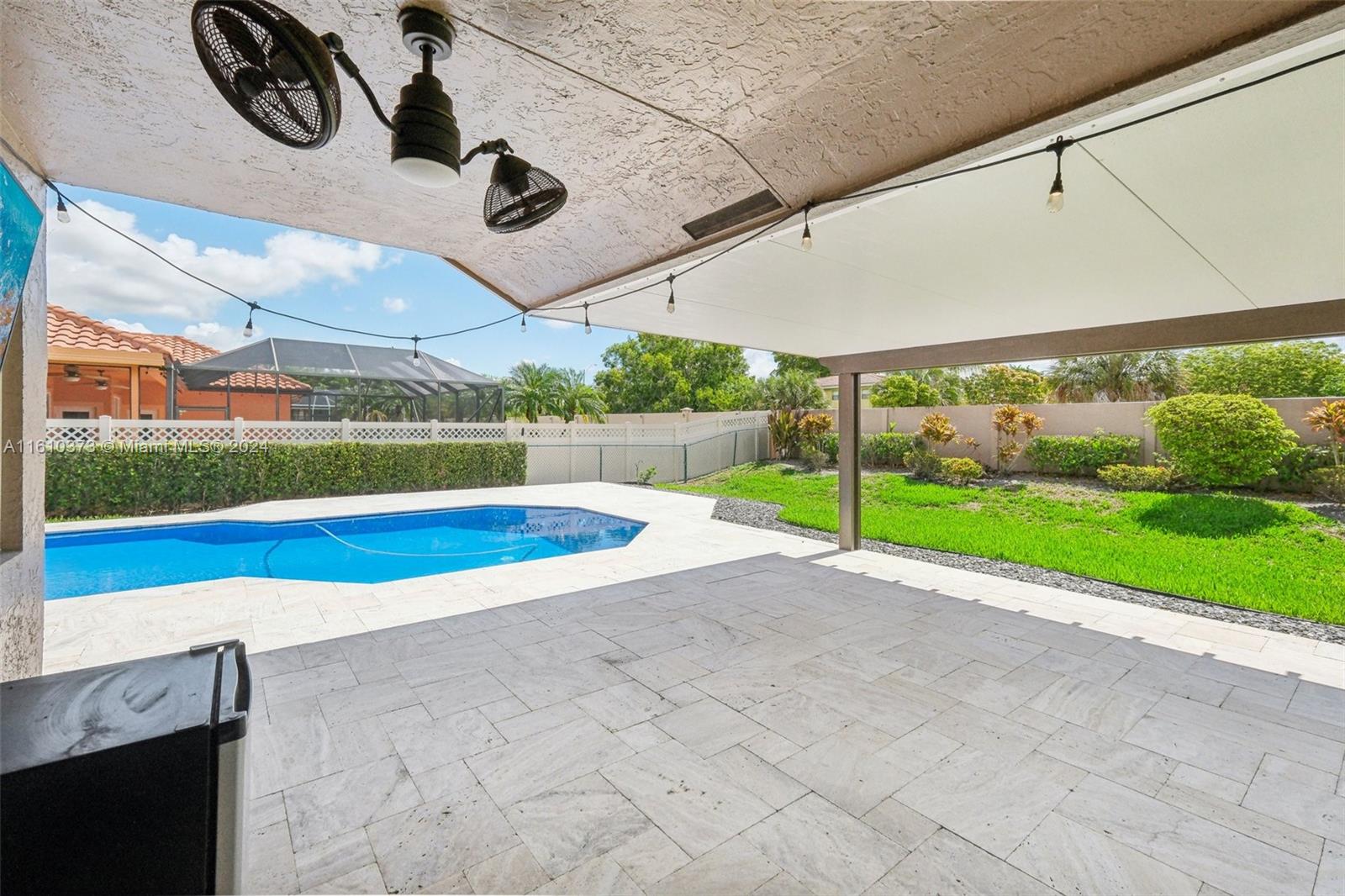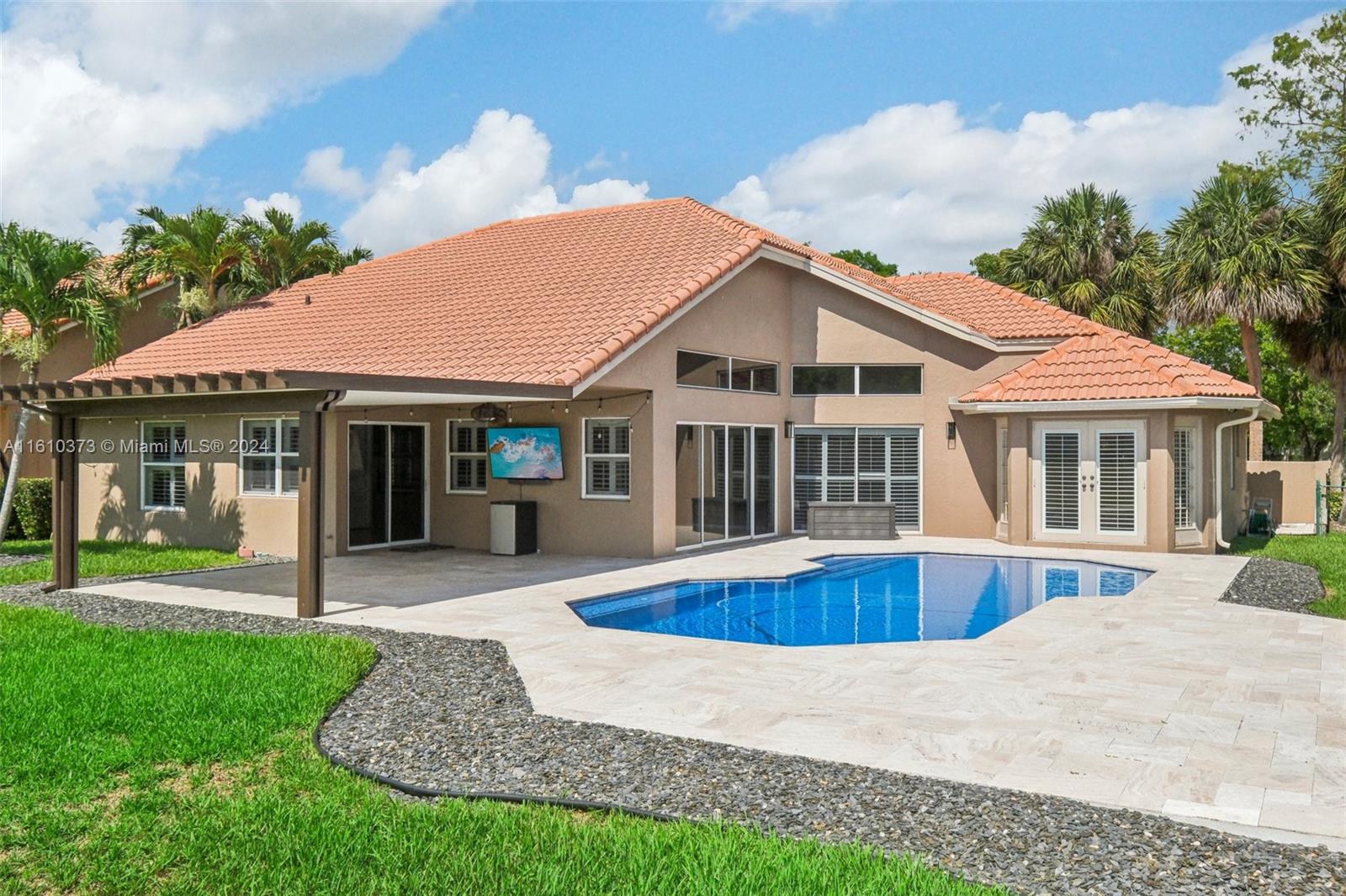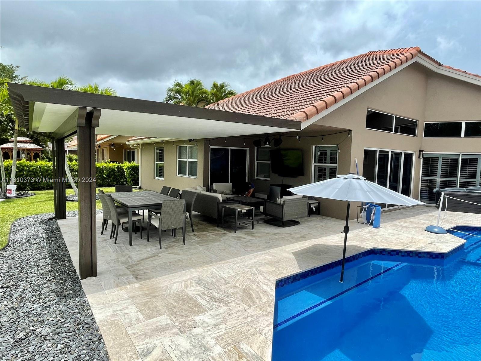 Welcome home to this beautiful 4/3 home in sought after Carriage Point Estates. Home features split floor plan, large laundry room, plantation shutters, and eat in kitchen just to name a few. Master has new flooring throughout and freshly painted walls. The outdoor space is newly renovated with gorgeous travertine, resurfaced pool, and covered pergola for shaded dining and entertainment. Community is guarded by 24 hour manned security gate.