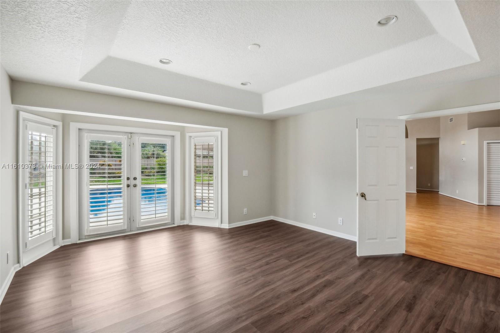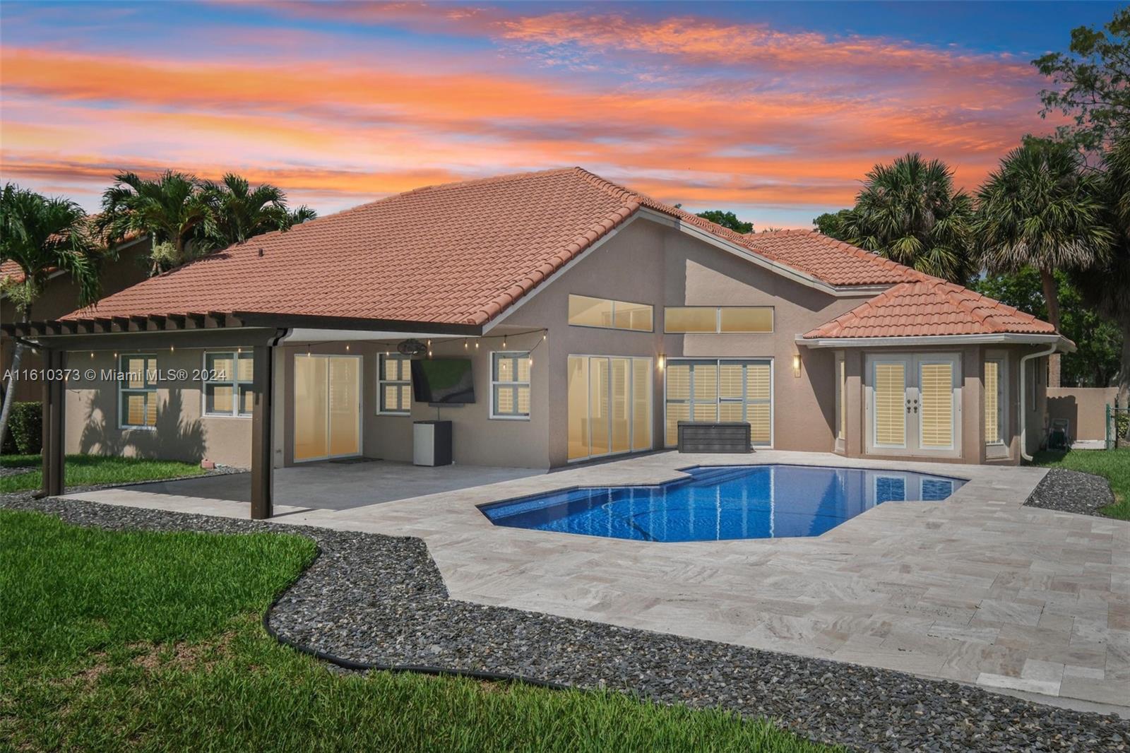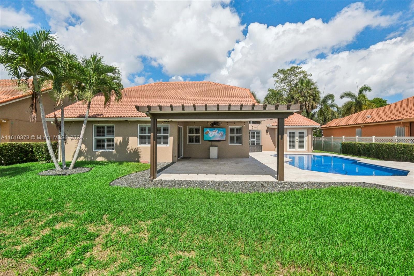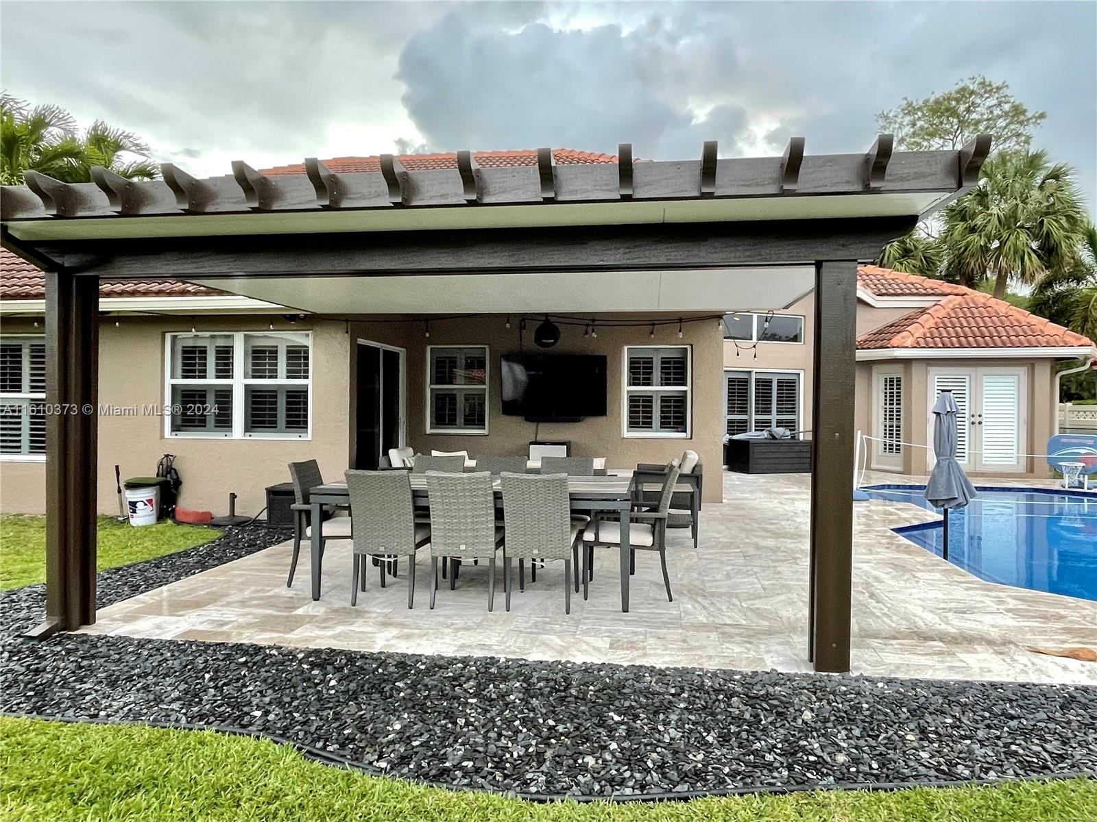 Welcome home to this beautiful 4/3 home in sought after Carriage Point Estates. Home features split floor plan, large laundry room, plantation shutters, and eat in kitchen just to name a few. Master has new flooring throughout and freshly painted walls. The outdoor space is newly renovated with gorgeous travertine, resurfaced pool, and covered pergola for shaded dining and entertainment. Community is guarded by 24 hour manned security gate.