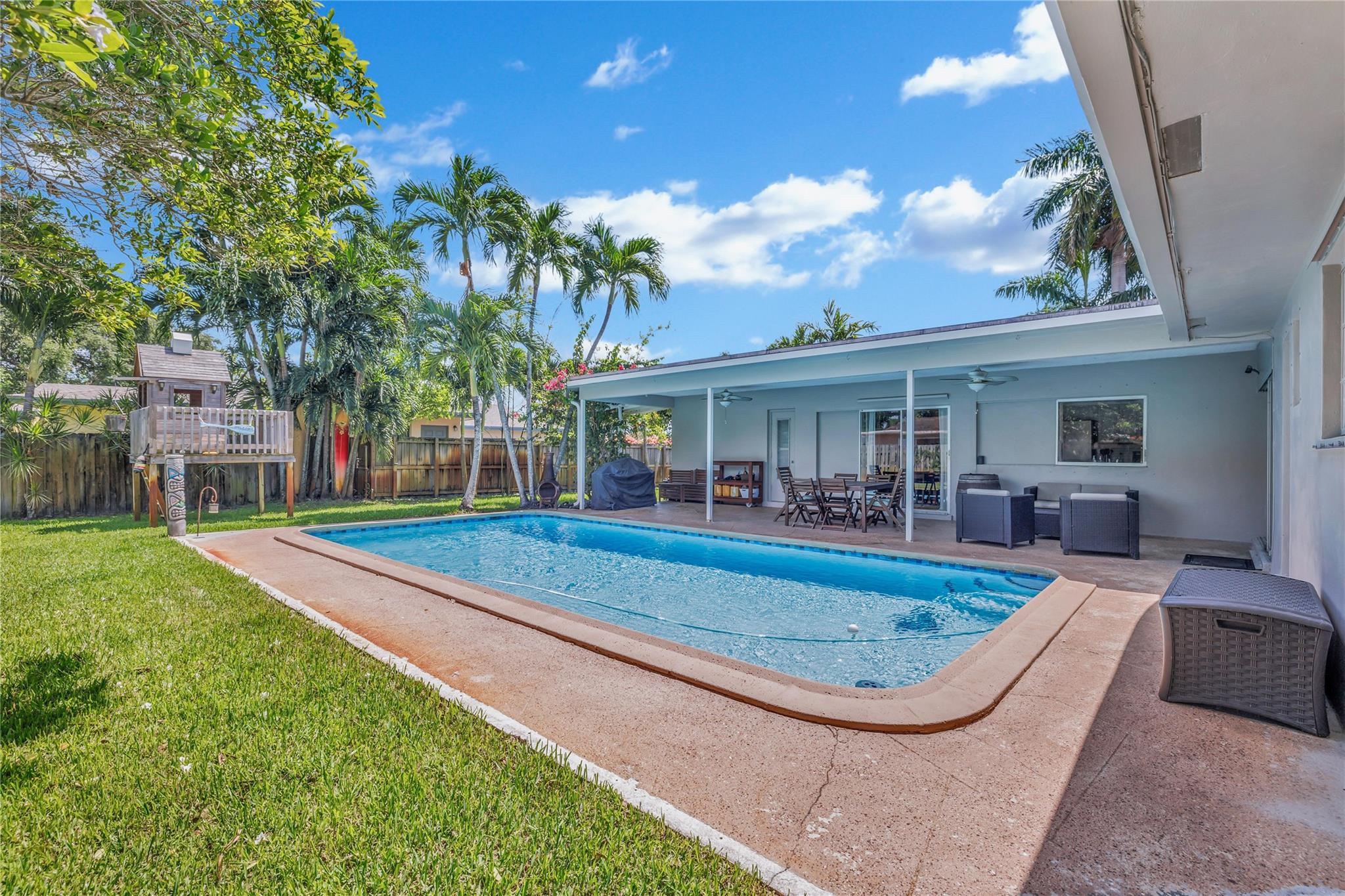 Located in a vibrant town full of opportunities, this beautiful home is just minutes from the Broward Mall and Sawgrass Mills Mall, with easy access to major highways. This sought-after Capri floor plan 4/2 in a true split layout, with the primary bedroom on the right and secondary bedrooms on the left. The kitchen features contrasting cabinets, stainless steel appliances, & a wonderful view, perfect for keeping an eye on the kids while cooking. Adjacent to the kitchen are spacious living, family, & dining rooms, providing ample space for family & guests. The covered patio and large saltwater pool—recently updated with new marcite, tiles, light, pool pump, pipes, and jets—are ideal for entertaining. A wrap-around fence ensures privacy and safety for kids and pets. Stay Friendly!