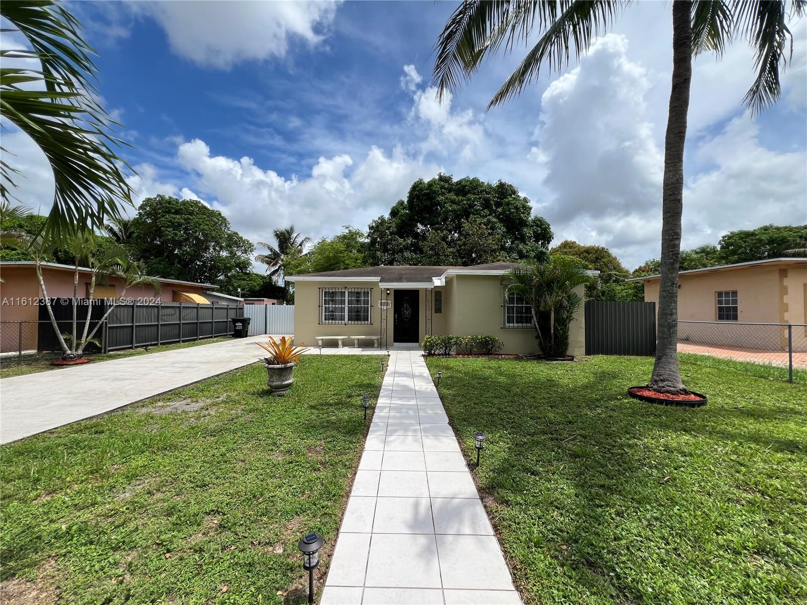 Discover your new home in this charming single-family residence located in North Miami. Featuring 2 bedrooms and 1 bath, this cozy abode boasts 805 sq ft of living space under A/C. The property sits on an expansive 8000 sq ft lot, fully fenced for privacy with a new aluminum fence in the back. Enjoy the lush outdoors with mature mango and avocado trees, and entertain guests under the pergola, perfect for BBQs and gatherings. The bathroom has been tastefully remodeled, and painted inside and out, adding modern touches to this delightful home.