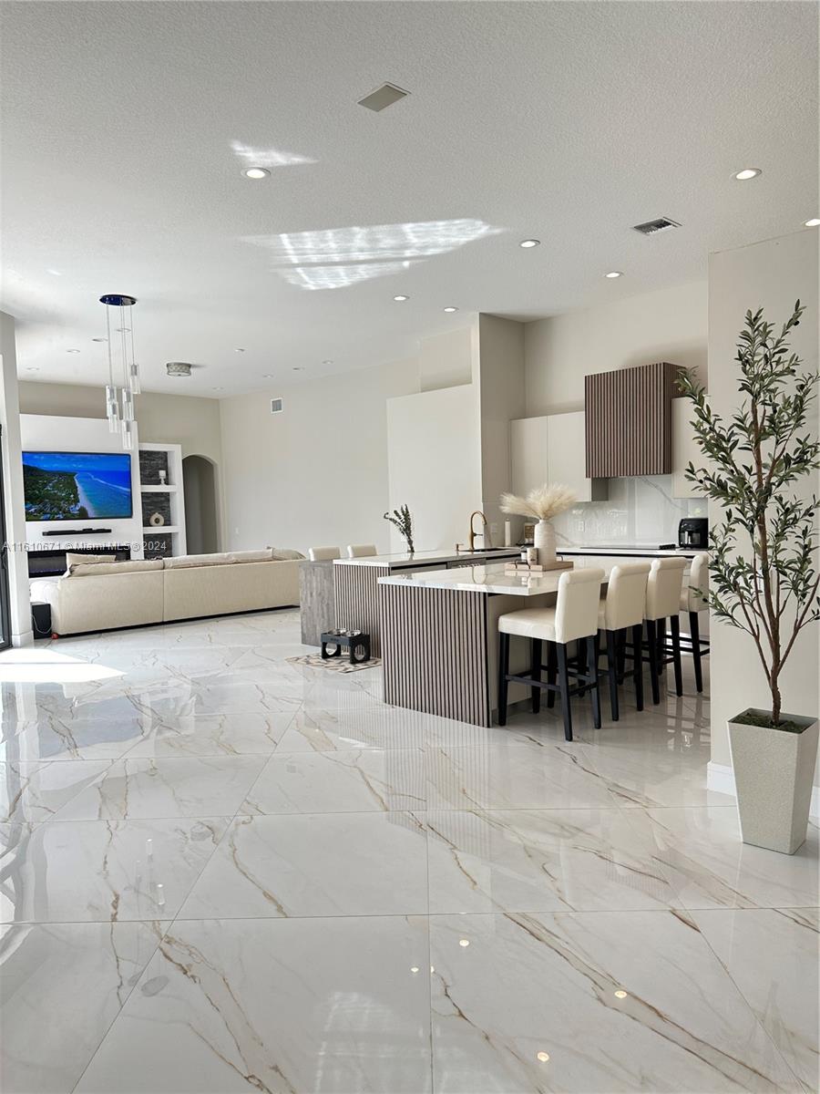 Experience luxury 5 bedroom, 3 1/2-bathroom modern masterpiece. Nestled in the sought-after Weston Hills Club. New porcelain floors that flow throughout the house. Every bathroom has been remodeled, offering a spa-like experience. A new 2024 roof ensures worry-free living, while new 2024 impact windows and doors provide peace of mind and energy efficiency. Freshly interior and exterior paint and custom built-ins. Gourmet kitchen, which features high-end designer appliances, huge center island, contemporary custom cabinetry, pantry, and a custom built in wine and coffee bar. Enjoy views of the lake from landscaped backyard, newly resurfaced heated pool. Additional updates include new washer and dryer and a spacious double garage with electric car charging station.