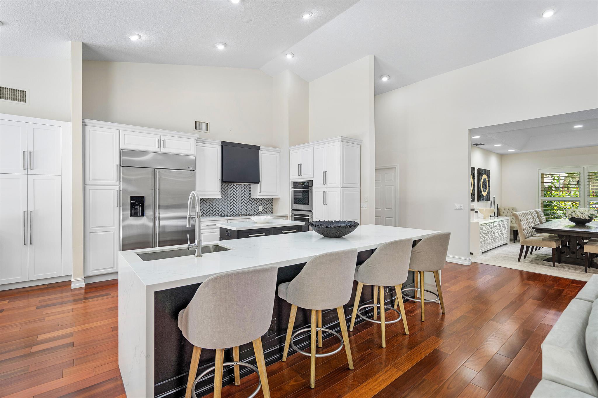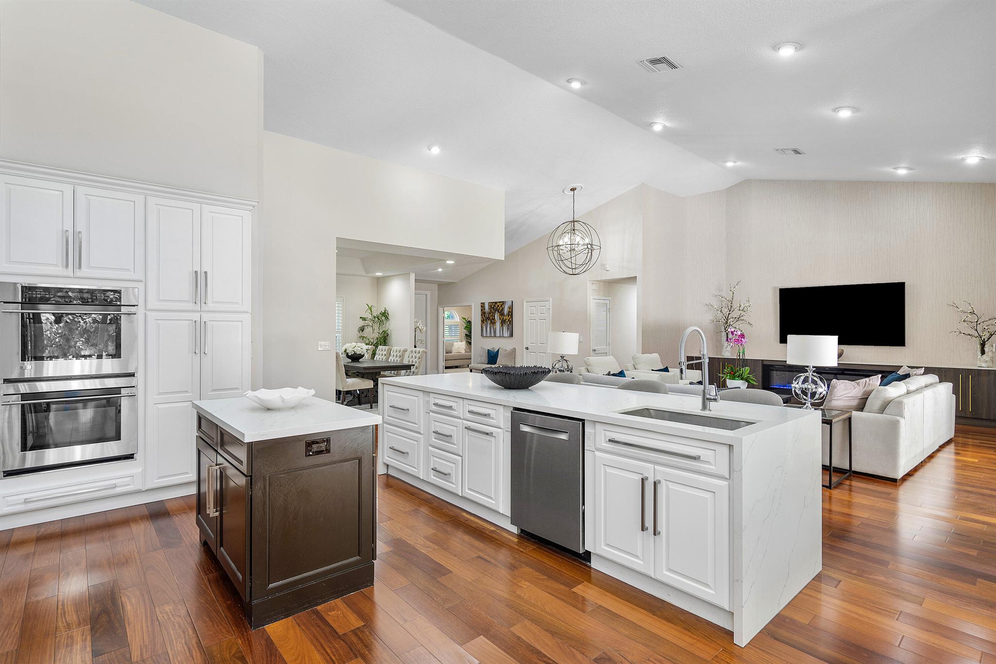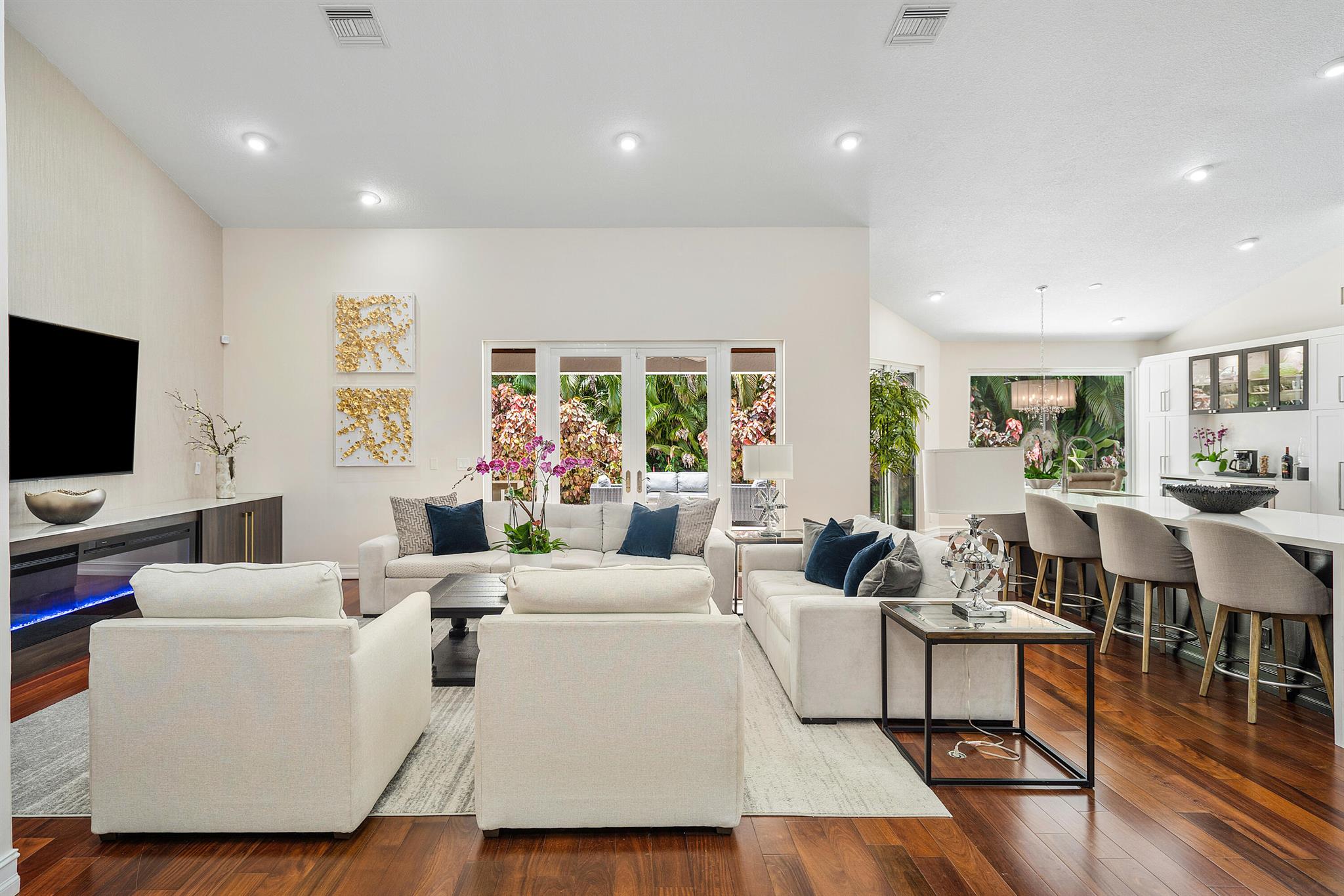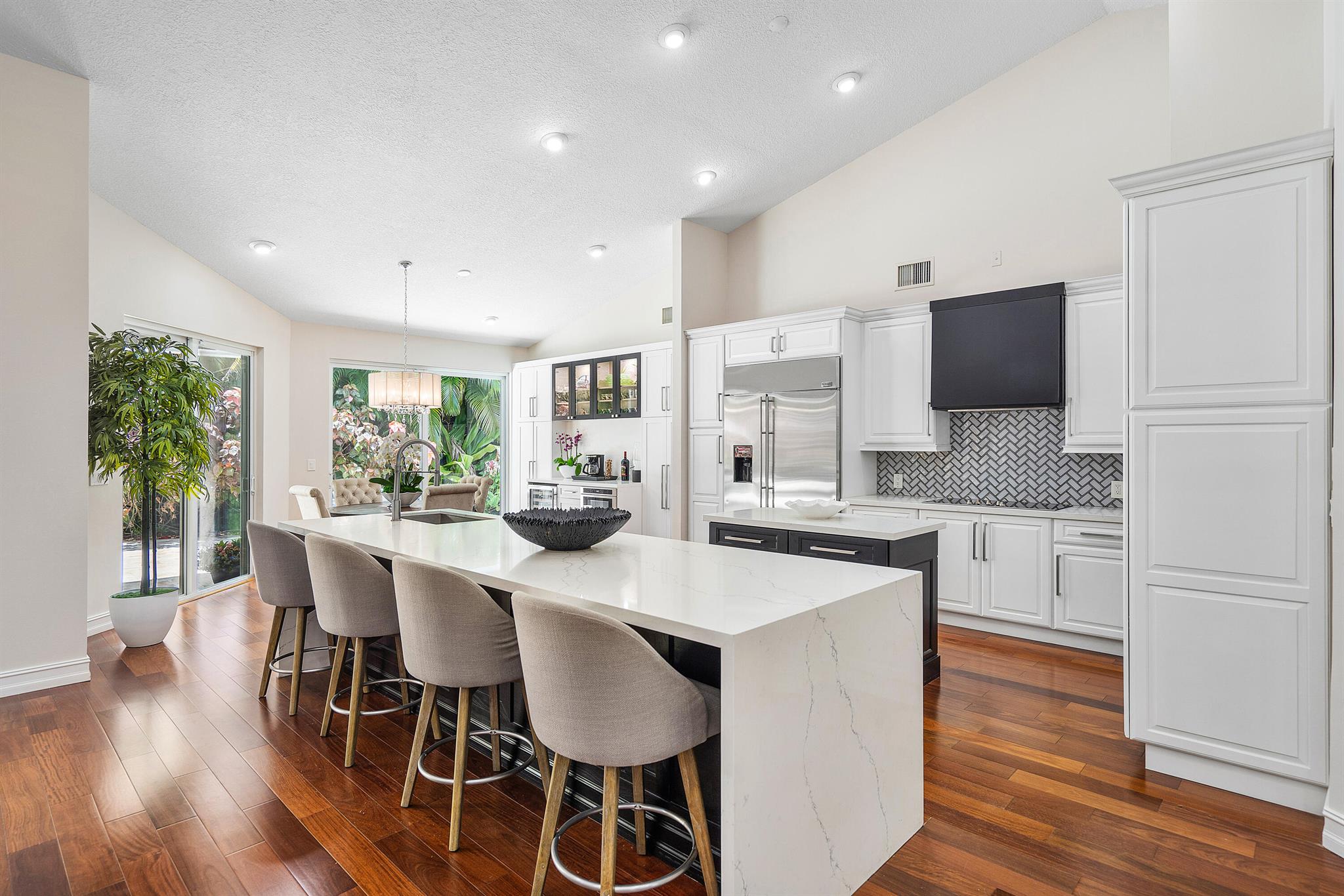 Dictionary's definition of ''Stunner:'' a person or thing of striking excellence, beauty, achievement, etc... You will get just that HERE at 4125 NW 24th Ter .. The best-priced estate in one of Boca Raton's most sought-after guard gated communities, Les Jardins. Step inside this totally remodeled 4-bed/3-bath home sprawling across a triple-split floor plan with high-vaulted ceilings and open concept across nearly 3,000 living SF. An unbelievable kitchen equipped with an oversized island with a quartz waterfall countertops, an abundance of cabinet and counterspace, GE Monogram Appliances, Designer herringbone subway tile backsplash, coffee and breakfast bar/dual ovens .. all opening into your beautiful family room. Professionally designed entertainment center and gorgeous dining room