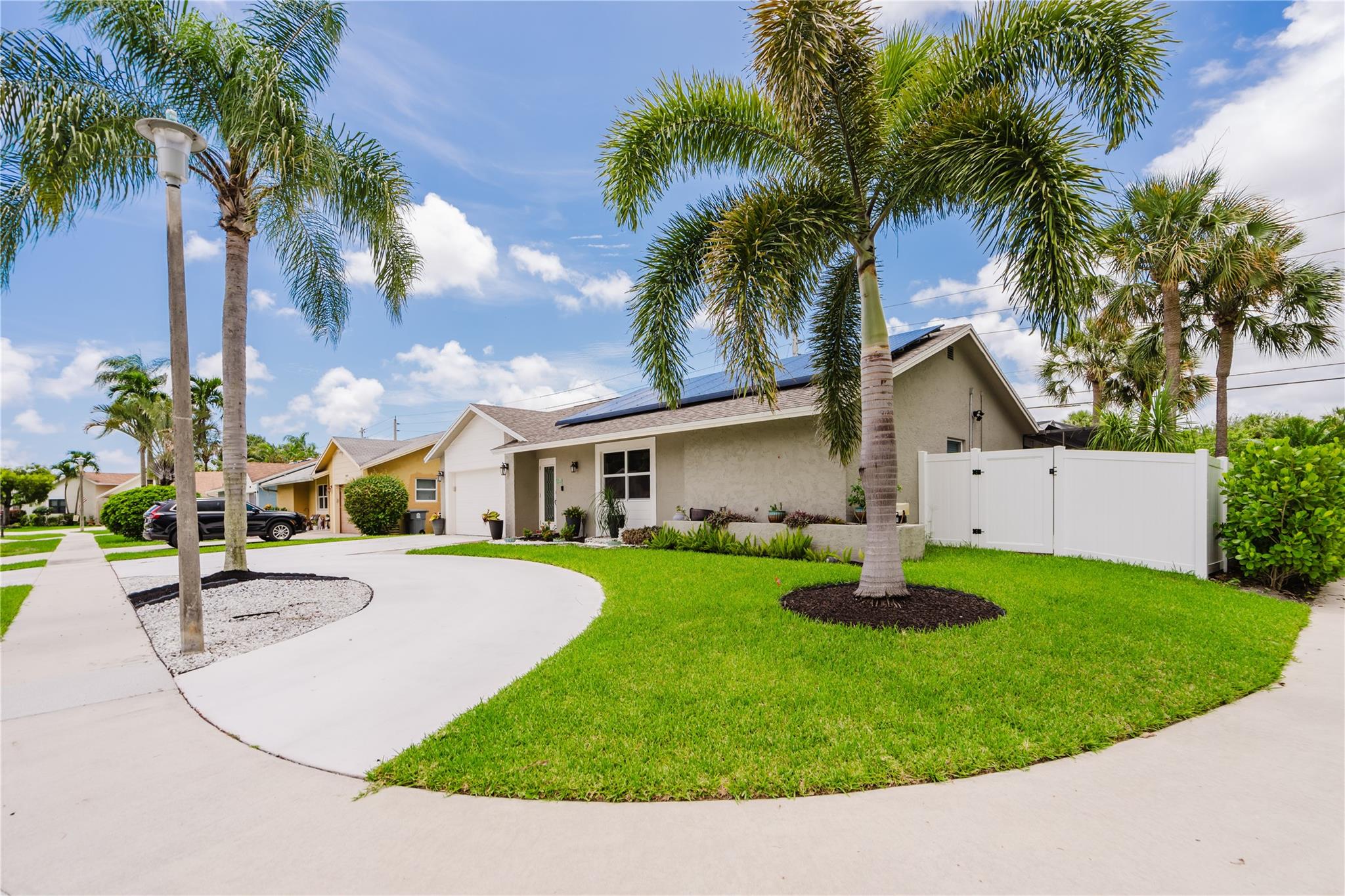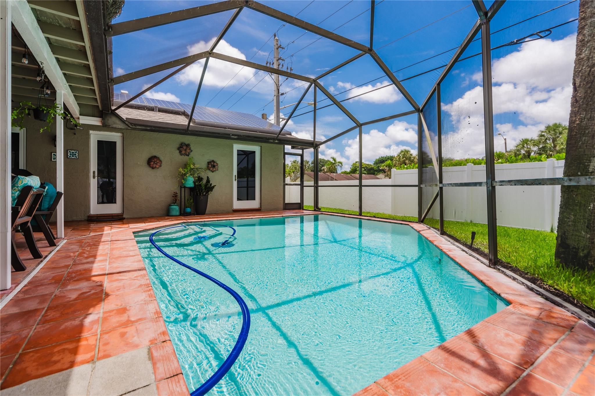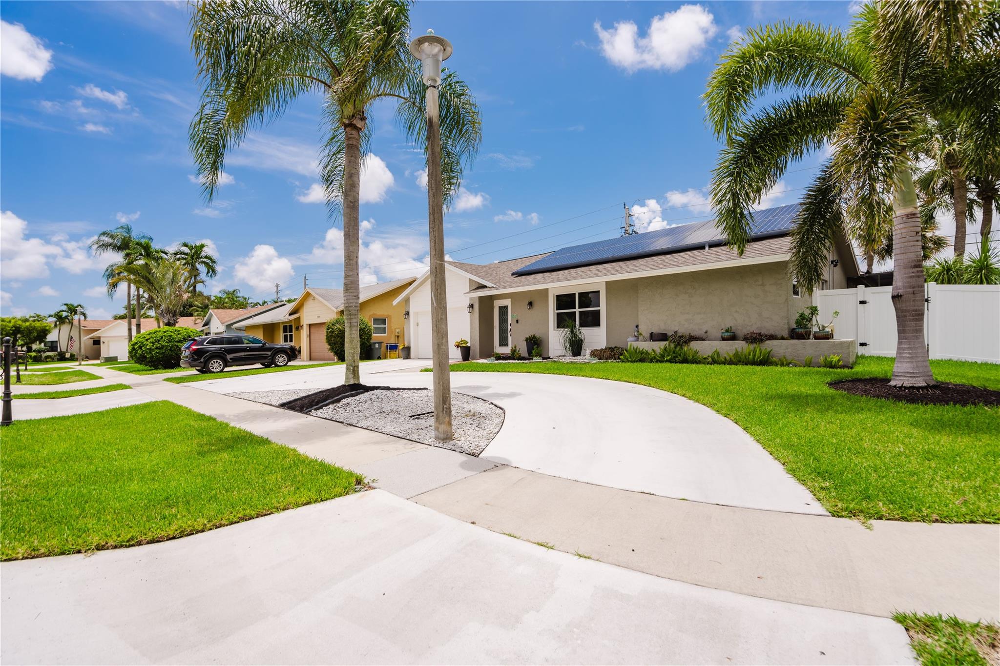Four bedroom 2 bath home with oversized 1 car garage in Sandalfoot Cove! Conveniently located in Boca Raton with a sought after school zone. The house is upgraded with impact glass, a new roof, solar panels that allow for virtually no electric bill, updated bathrooms, and a screened in heated/salt water pool. Split bedroom plan with the primary separated from the other three bedrooms. Cabana bath opening to the pool area. Corner lot with new vinyl fencing and a circular drive.