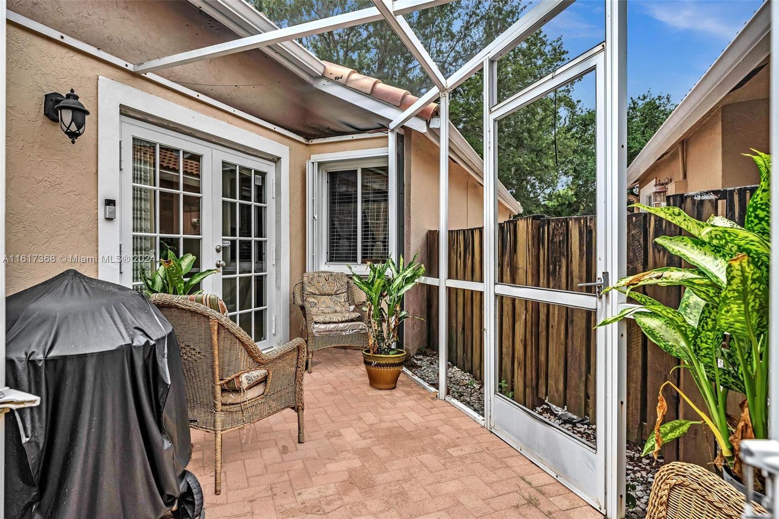 Lovely 3 bedroom 2 bath home in 24hr Guard Gated community – “Sunset Cove”. This quaint, well maintained home has a newer roof and A/C. Complete Accordion hurricane shutters and monitored Security Alarm. French doors lead out to a screened in patio to relax. Fenced in yard. Perfect for pets and entertaining family & friends. Two car garage. CHANDELIER IN DINING ROOM AND LIGHT FIXTURE IN ENTRYWAY NOT INCLUDED IN SALE. LOW HOA covers all lawncare, tree trimming twice a year, Security and recreation facilities/Community pool. Excellent location!!! Next to all major highways, great shopping & restaurants.