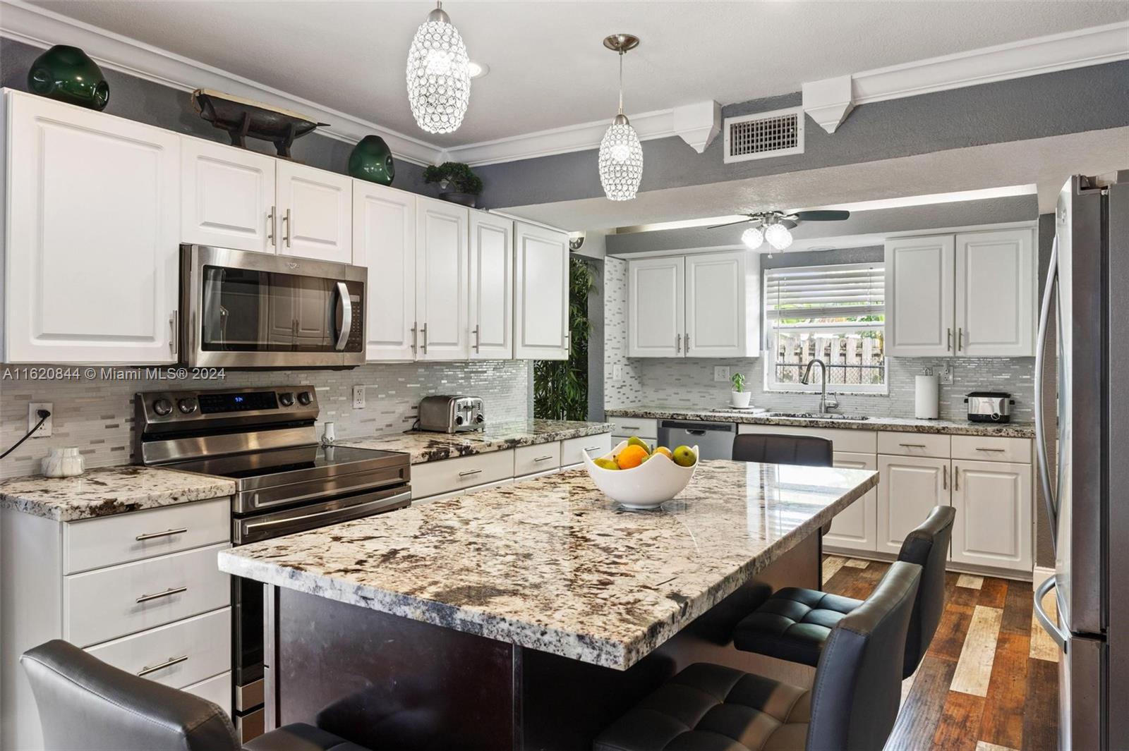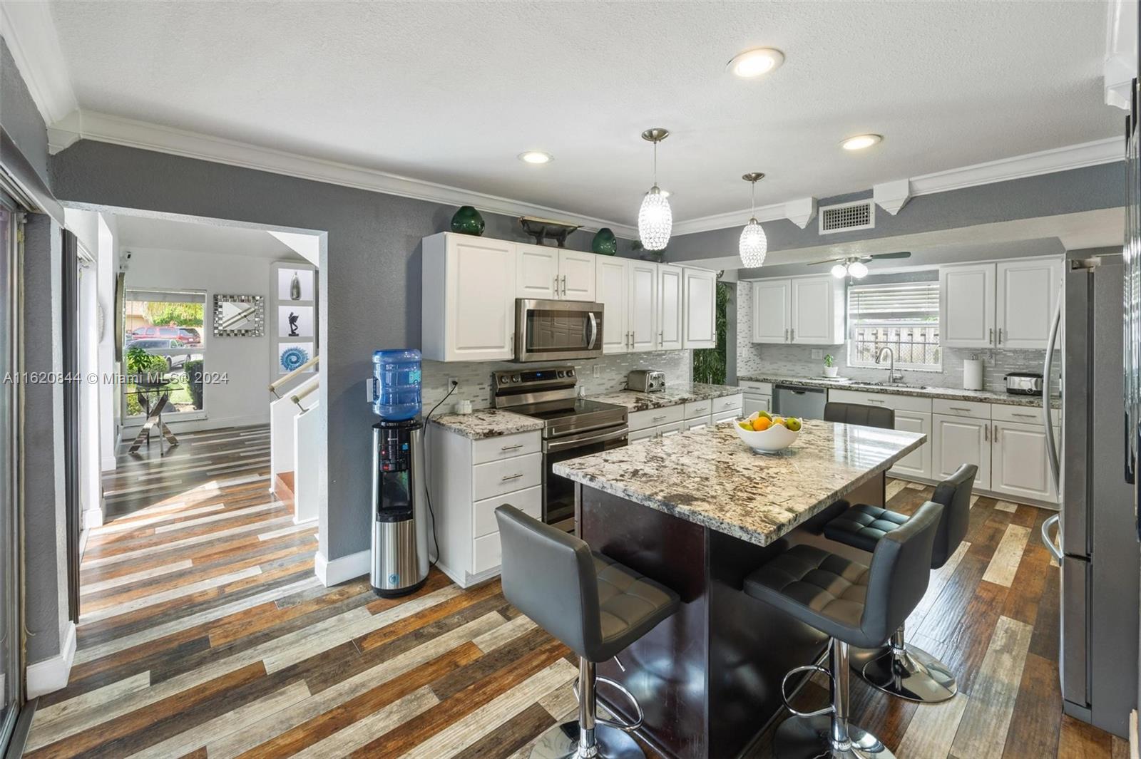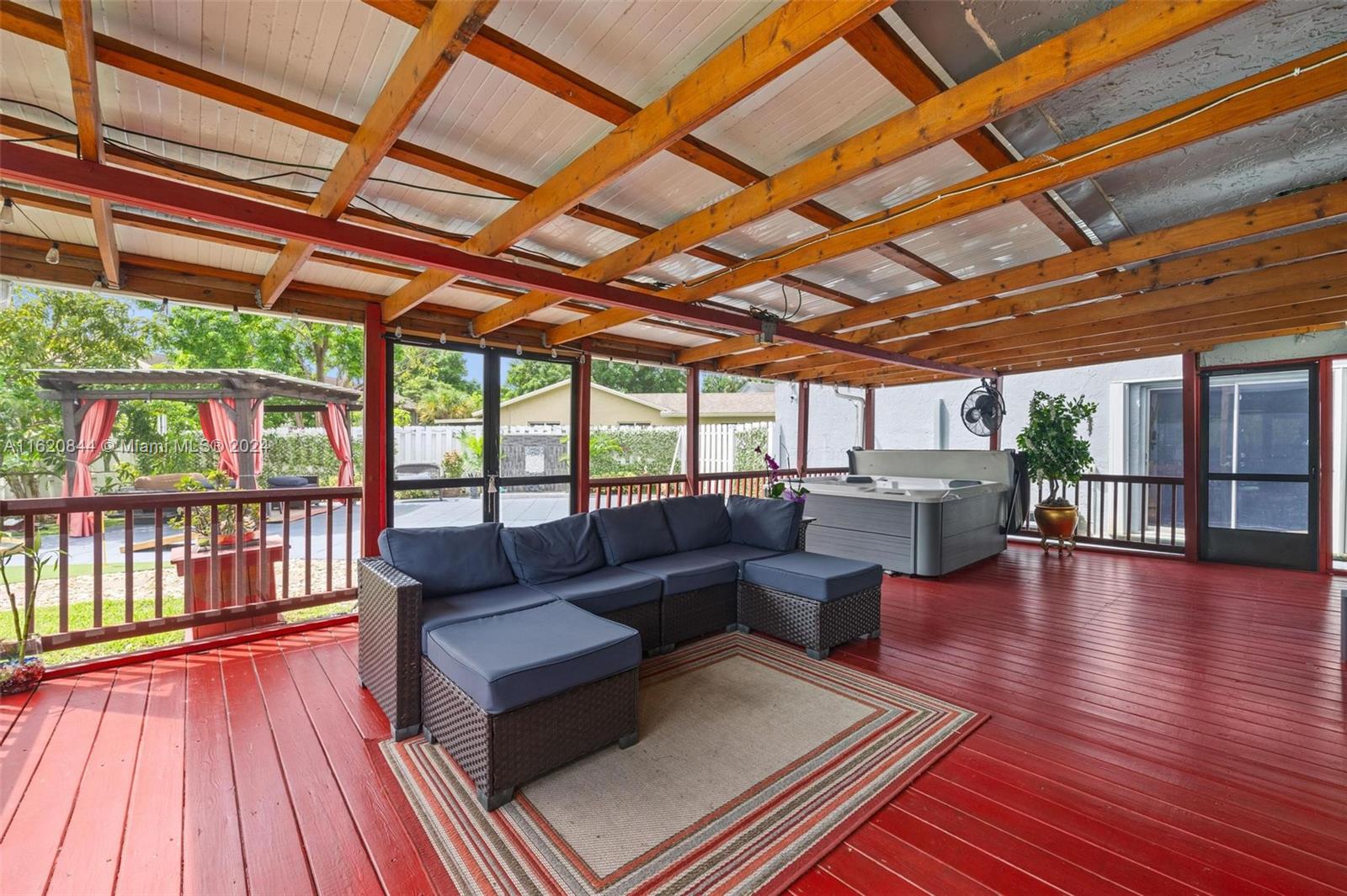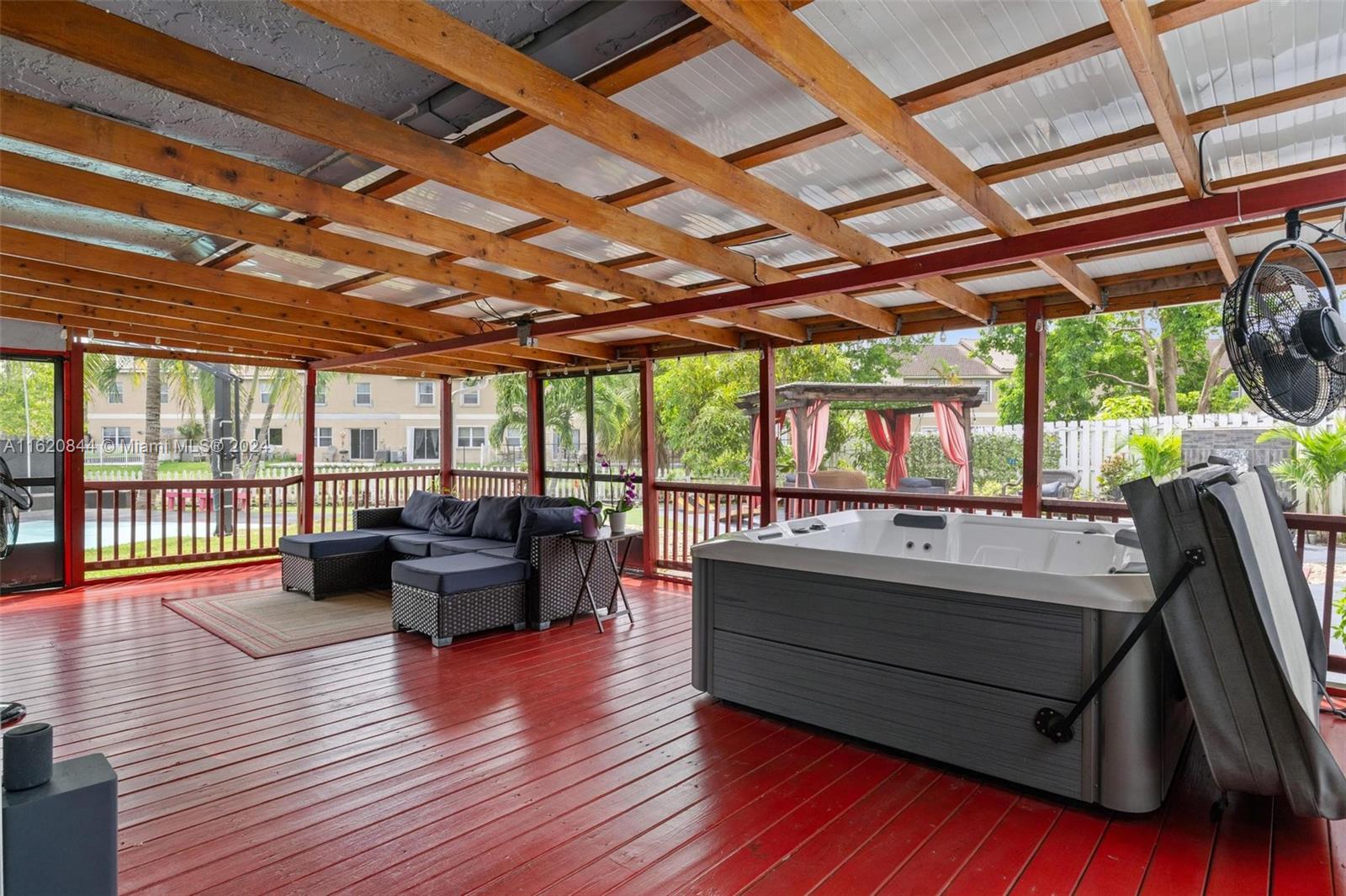 MOTIVATED SELLER! This spacious 4 bed/3 bath home in Welleby features vaulted ceilings, a bonus room that can be used as an office or extra bedroom, and a recently insulated garage with AC, ready for potential conversion. The first floor has been upgraded with water-resistant laminate flooring, and the kitchen boasts granite countertops and stainless-steel appliances. Bathrooms have been updated with new fixtures and lighting and master bedroom includes a Bluetooth shower and a newly designed walk-in closet. Enjoy the fully screened deck with a hot tub, overlooking a landscaped yard with fruit trees, a gazebo, and a custom waterscape. Home also boasts a Miami Heat-inspired basketball court. The home also received a brand-new roof and insulation in July 2023.