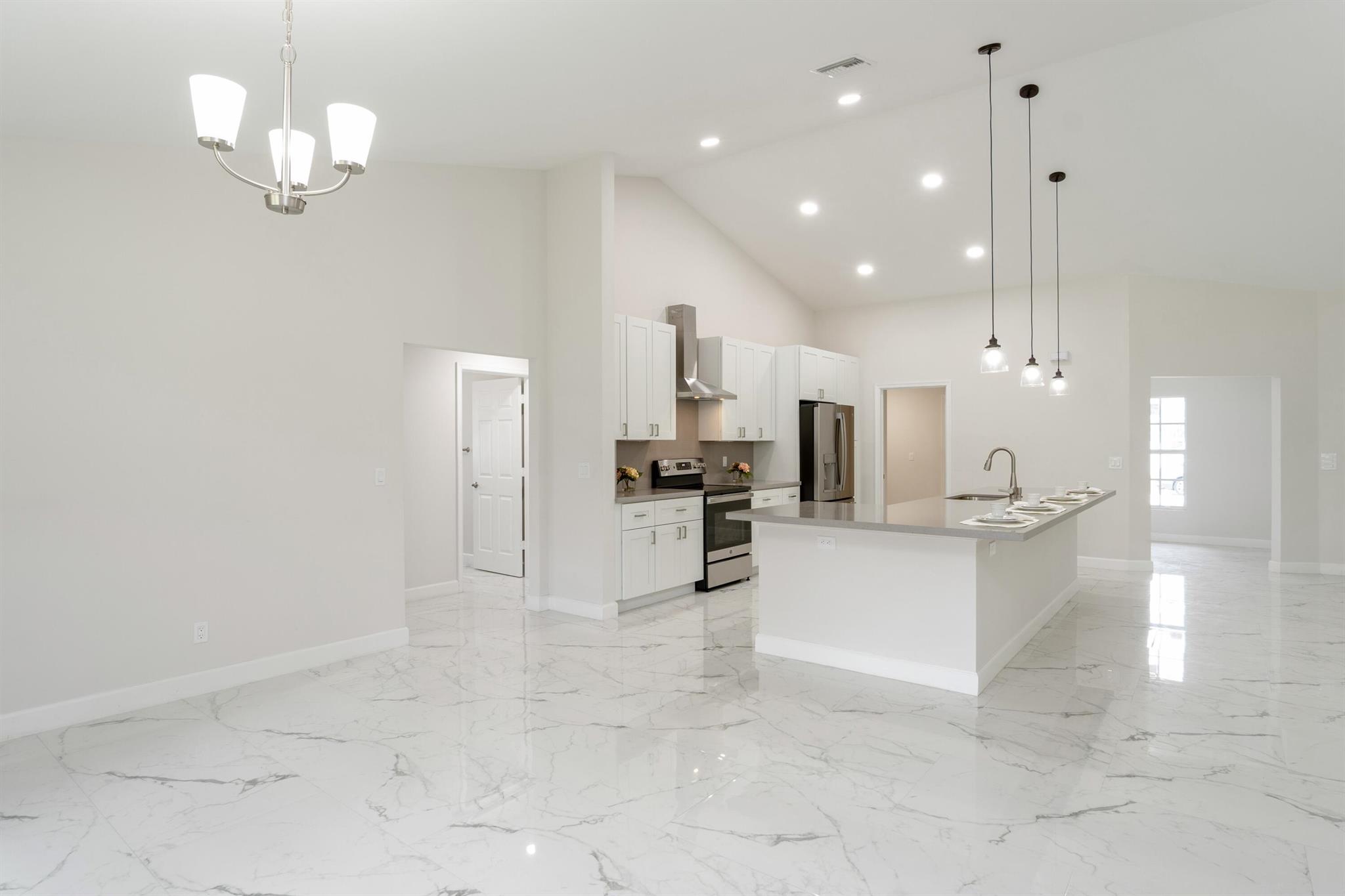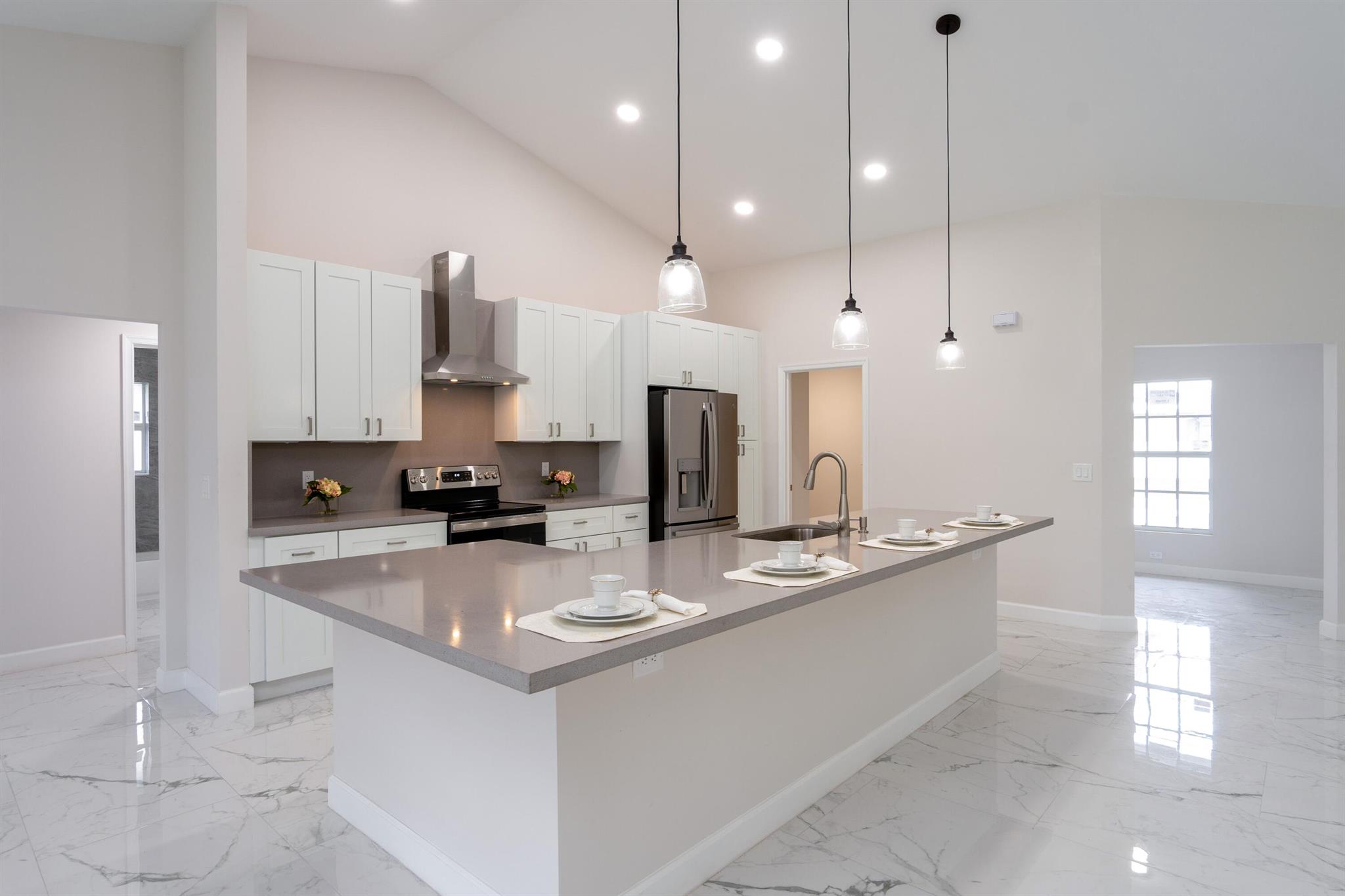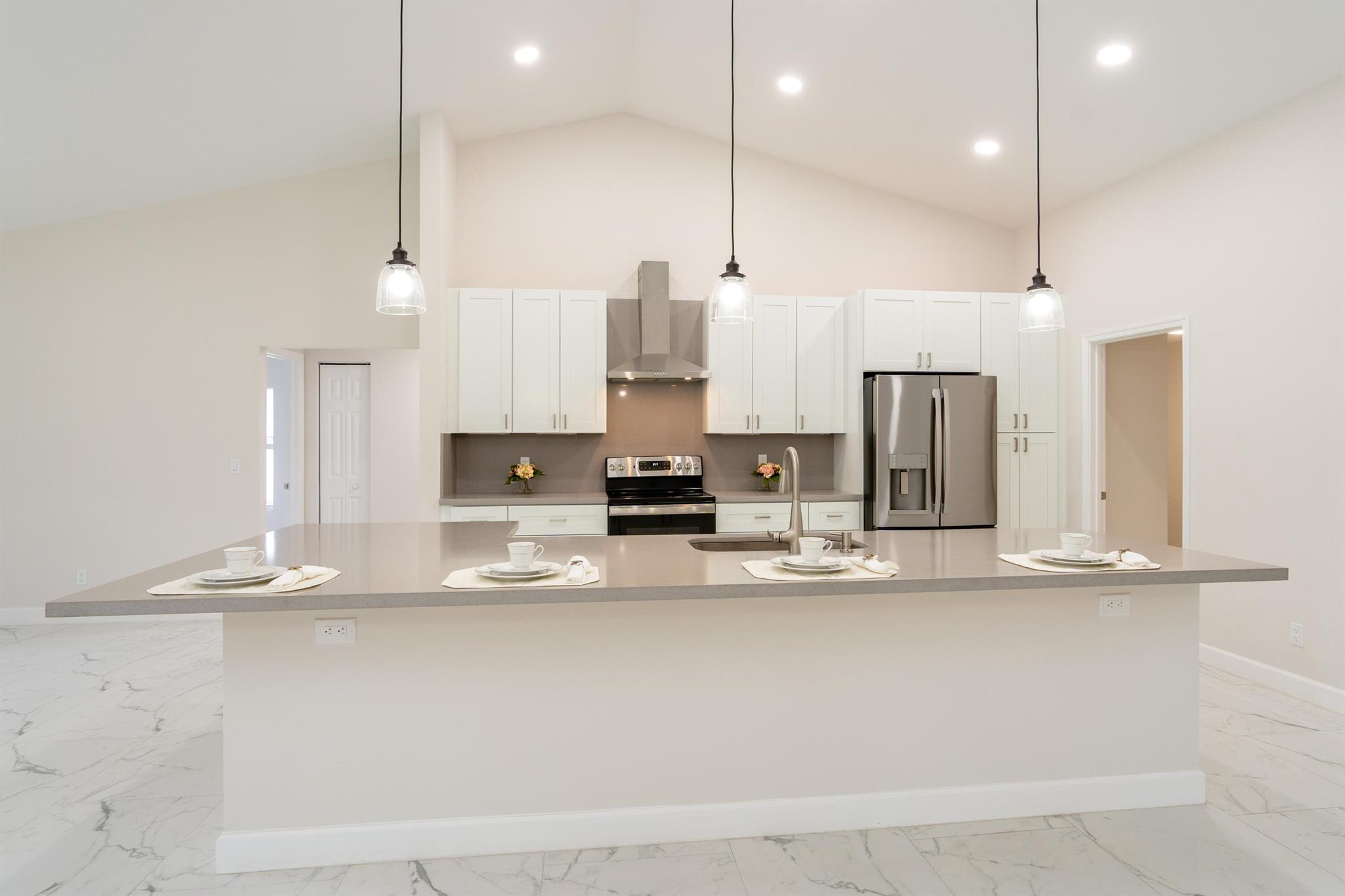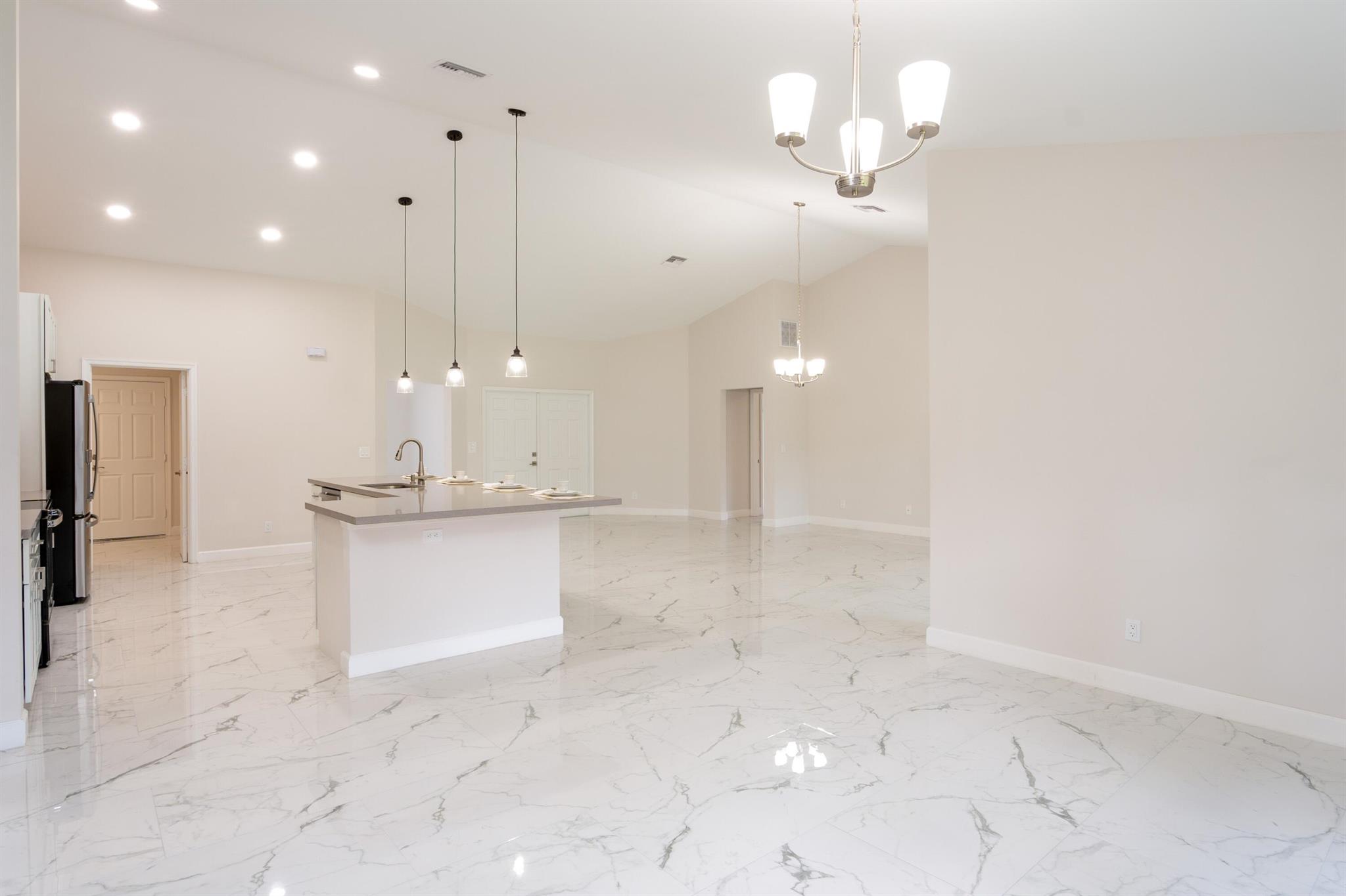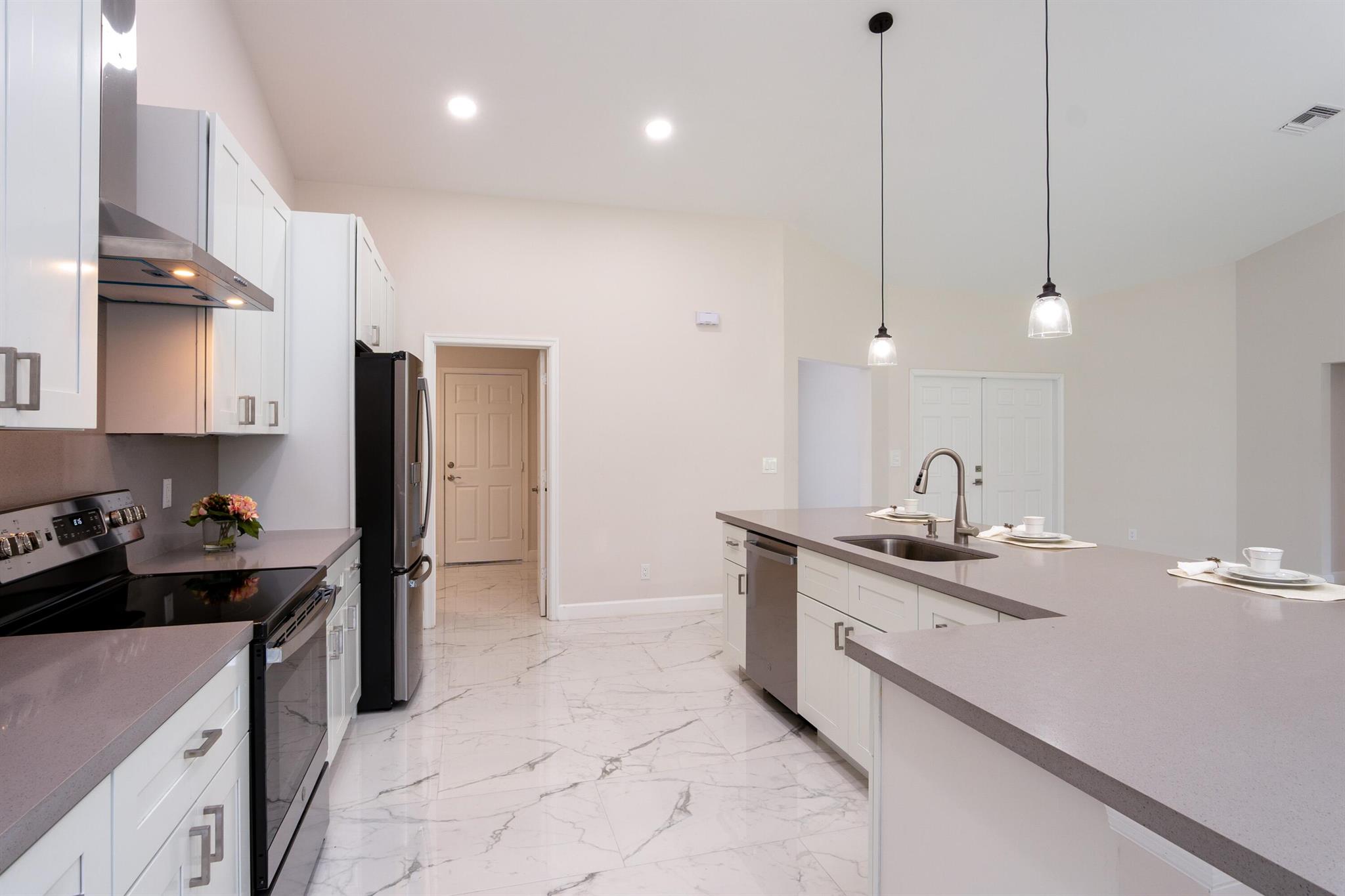 Welcome to your new luxurious 3-bedroom, 2-bathroom home with a den. This fully custom 2,212 sqft house is contemporary with vaulted ceilings, quartz countertops, pendant lights, and marble-like porcelain tiles throughout. The open floor plan is perfect for entertaining guests and the chef's kitchen is equipped with stainless steel appliances and soft-close cabinets.The primary bedroom is spacious and includes an extra oversized walk-in closet, a primary bath with dual sinks, a freestanding tub, and a separate rain shower. The laundry room is sizable and includes a new washer and dryer with a sink. The 2-car garage has an epoxy floor. This home offers you peace of mind with impact windows and doors.