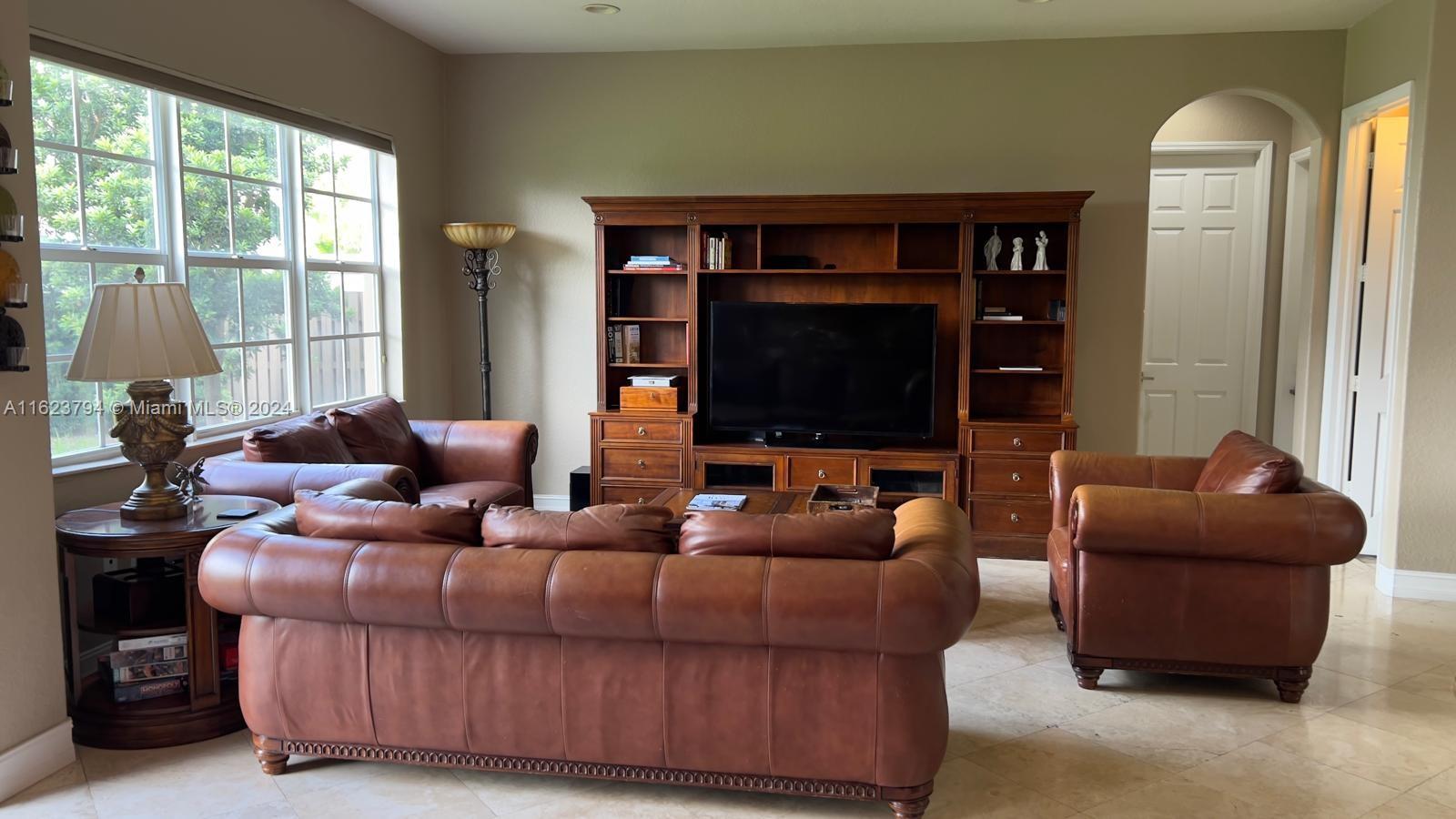 Doral Isles nestled in the dynamic new City of Doral. This home boasts 5 beautiful spacious bedrooms, 4 ½ baths, and multiple multi-use rooms. 3,695 Sq Ft on an oversized 11,643 Sq Ft Lot. A suite is located downstairs adjacent to the large kitchen, dinette nook and family area which spreads out into an open concept design. Also located on the first floor is a separate formal living room with an adjacent private outdoor patio.This home also enjoys a separate dining room. A staircase in decorative antique ironwork and cherry wood stained stair steps, winds itself upward through the center of the home opening up to the second level. Here you find a centralized loft area plus a unique octagon shaped office, 4 additional bedrooms, 3 full bathrooms and a separate laundry room.