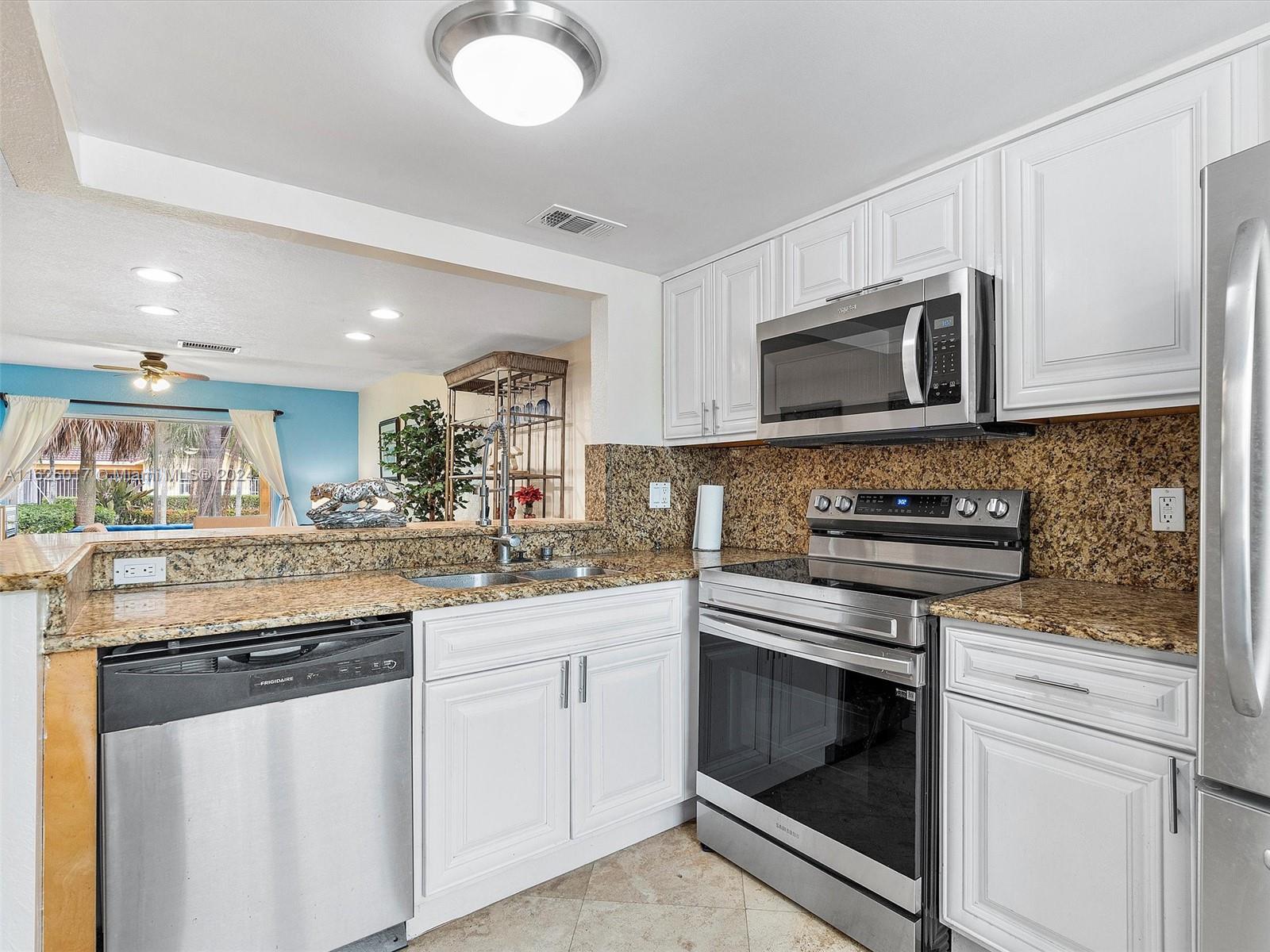 Fannie Mae approved! Only 5% down required!! This 2-bedroom, 2.5-bathroom townhome is perfect for roommates, featuring en-suite bathrooms for both bedrooms. One bedroom boasts a balcony with tranquil pond and garden views. Enjoy cooking in the updated kitchen with new appliances and granite countertops. The first floor features travertine marble flooring, while the staircase and second floor are adorned with laminate flooring. A newer washer and dryer are conveniently located on the second floor between both bedrooms. Two assigned parking spaces and plenty of guest parking add convenience. Plus, shopping is minutes away.