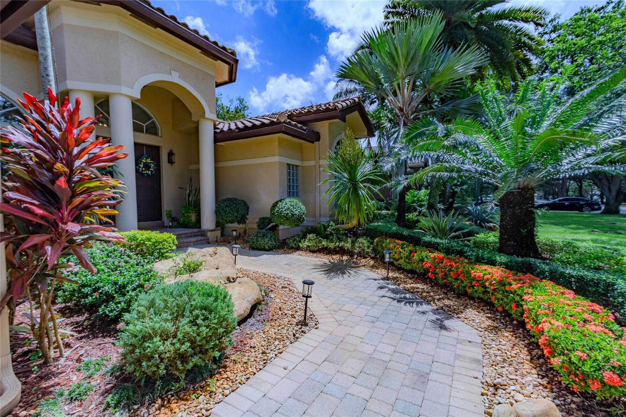 Your private backyard oasis, featuring a free-form screened pool with spa. The beautiful oversized paver patio. Enjoy peace of mind with a brand-new roof installed in 2019. Step inside to luxury with skim-coated walls and ceilings and stunning 48x48 porcelain tile throughout. Located in the prestigious gated community , this spacious home offers a triple split plan with five large bedrooms The recently renovated kitchen boasts all new white quartz countertops, stainless steel appliances, including a double oven, and a walk-in pantry. Neutral tones throughout wood floors in all bedrooms Tucked away on a scenic, tree-lined street, plus enjoy the convenience to the park and tennis courts. Minutes away from American Heritage, 595, airport and Ft Lauderdale. Garage ready for Tesla charging.