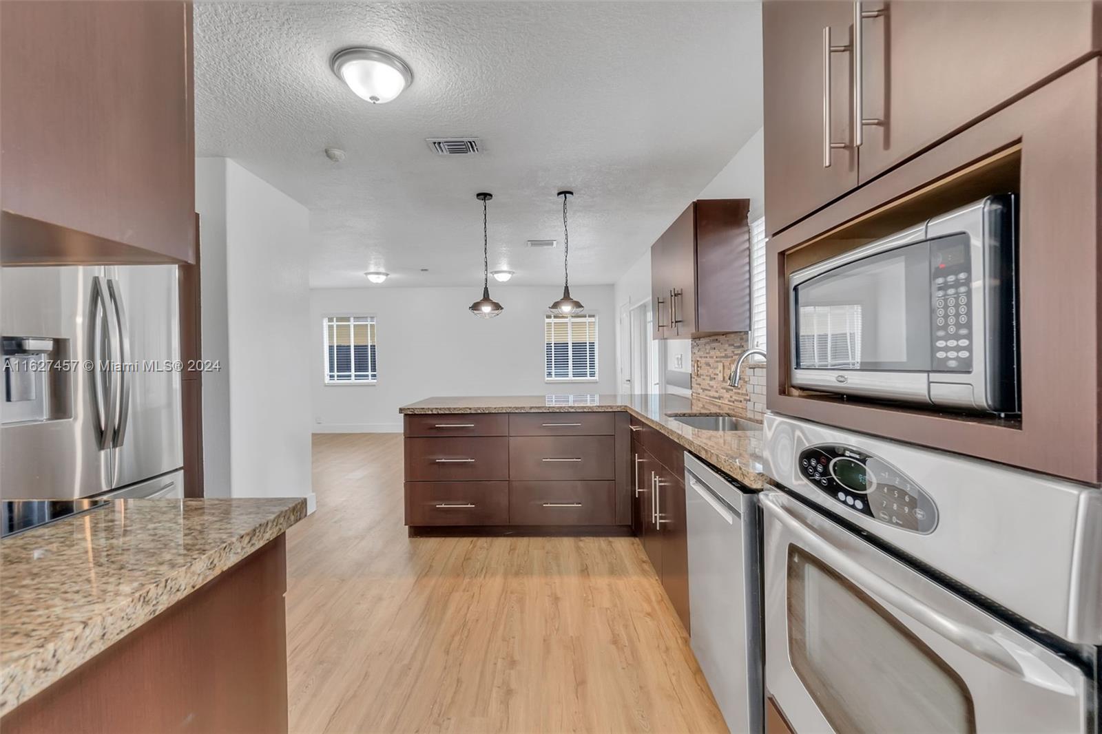 Come see this spacious 4-bedroom, 2.5-bathroom home with a 2-car garage and pool, conveniently located in Miami Lakes/Palm Springs North area. This residence features a bright, open floor plan with modern laminate wood flooring throughout & impressive high ceilings. The ample peninsula kitchen, adjacent to the family room, features wood cabinetry, granite countertops & stainless steel appliances. Upstairs, the split floor plan offers a primary bedroom with a large walk-in closet, a remodeled bathroom & a spacious balcony overlooking the beautiful pool area. The roof is approximately 3 years old. Outside, enjoy a private terrace, patio & pool, complete with an outdoor entertainment bar. The home is conveniently located near major highways, lots of shopping & dining options. No HOA!