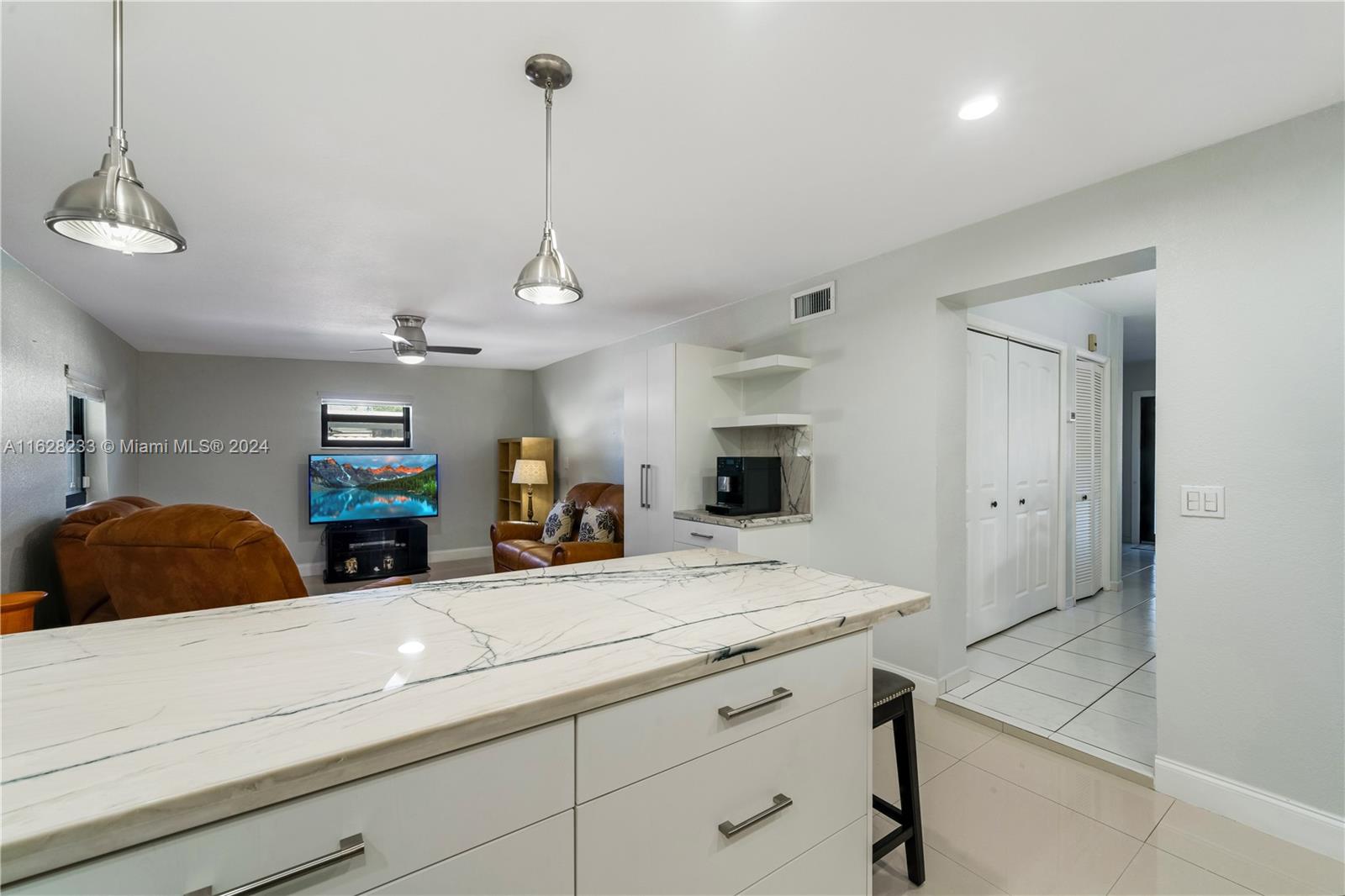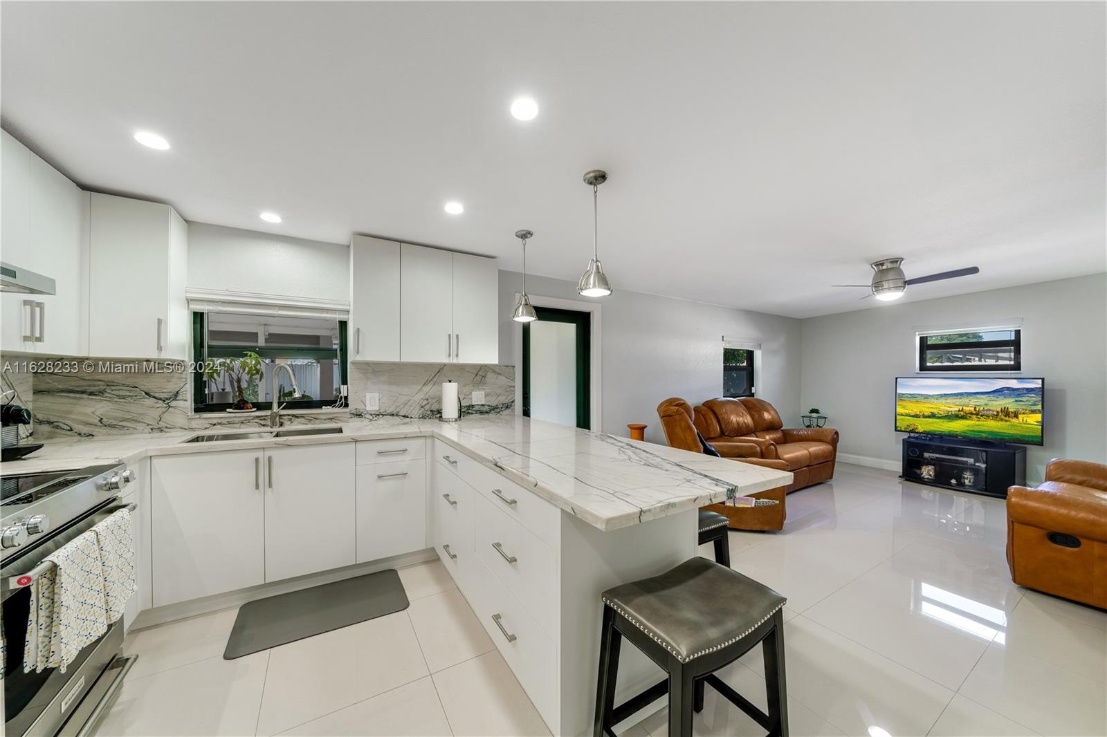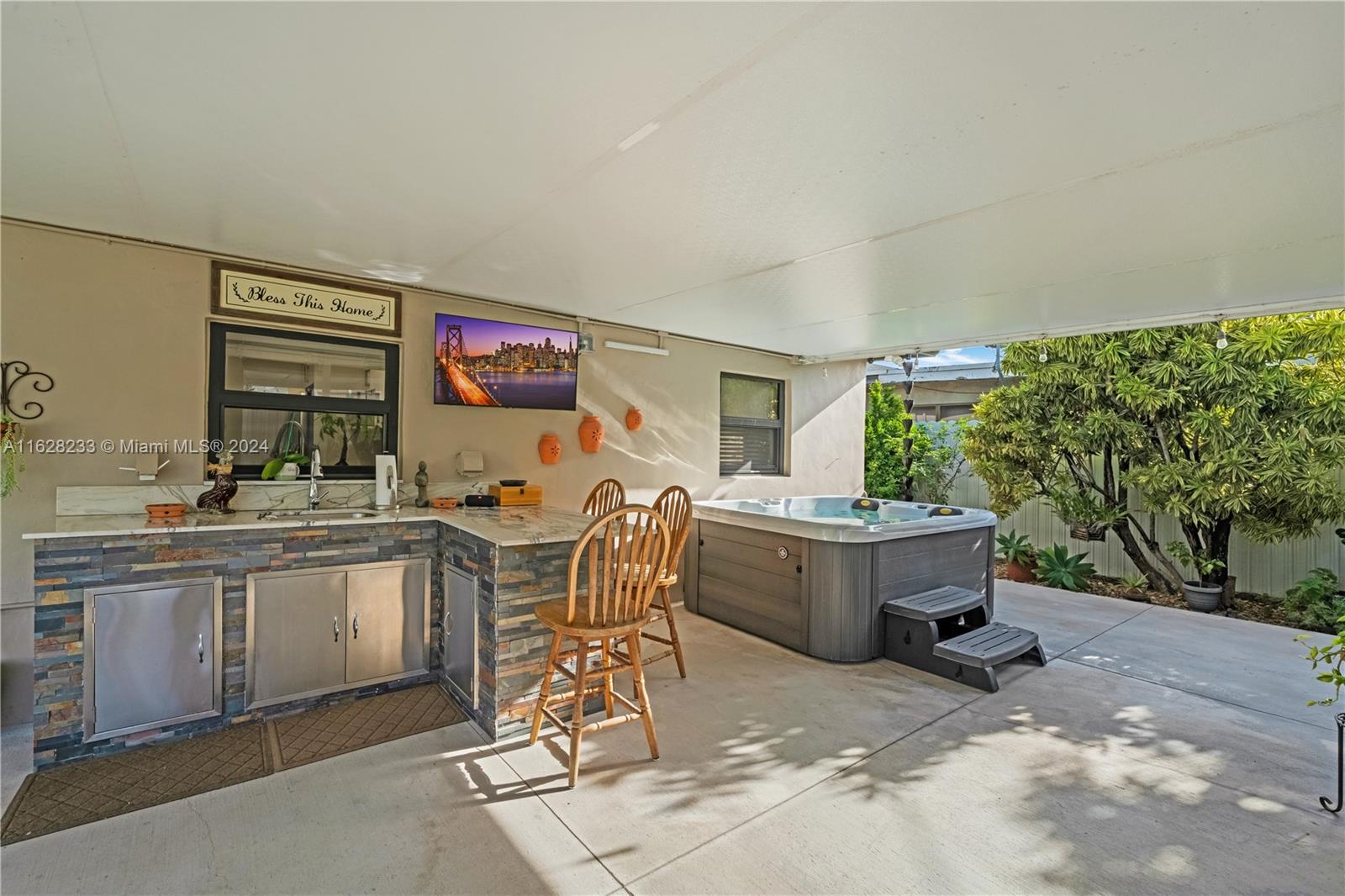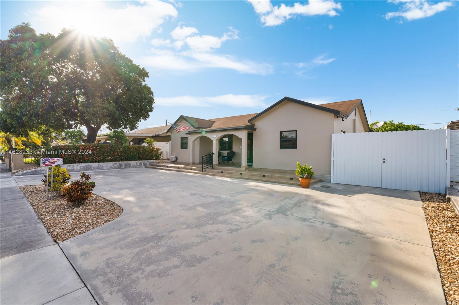 Stunning 4-bedroom, 2-bathroom home featuring a remarkable remodeled kitchen w/quartz countertops, backsplashes, and large peninsula. The spotless floors and freshly remodeled bathrooms add a touch of modern elegance. Split-level bedrooms provide privacy, w/bathrooms conveniently located on each side of the home. Enjoy cooking with KitchenAid appliances and wood cabinets, and appreciate the natural light streaming through impact doors and windows. The outdoor area is perfect for entertaining, with a covered patio that includes an outdoor counter, sink, and icemaker, plus a 4-person saltwater spa. Additionally included a 10x11 concrete covered permanent shed, gated side parking for boat/trailer, & a circular driveway w/ample space for 5 vehicles. Located close to highways & airports.
