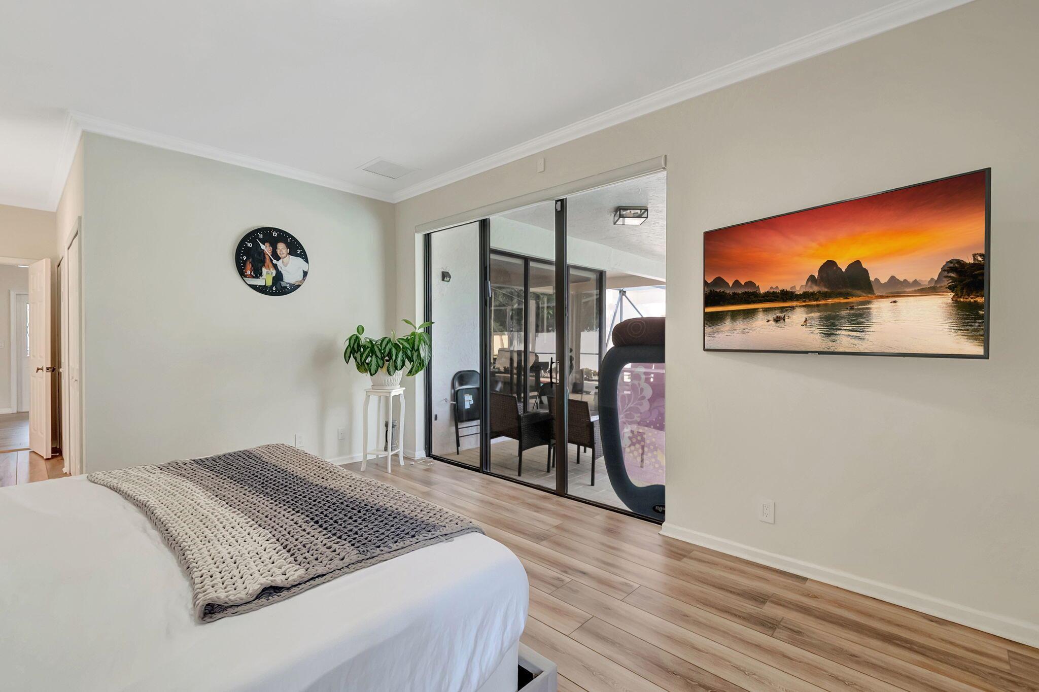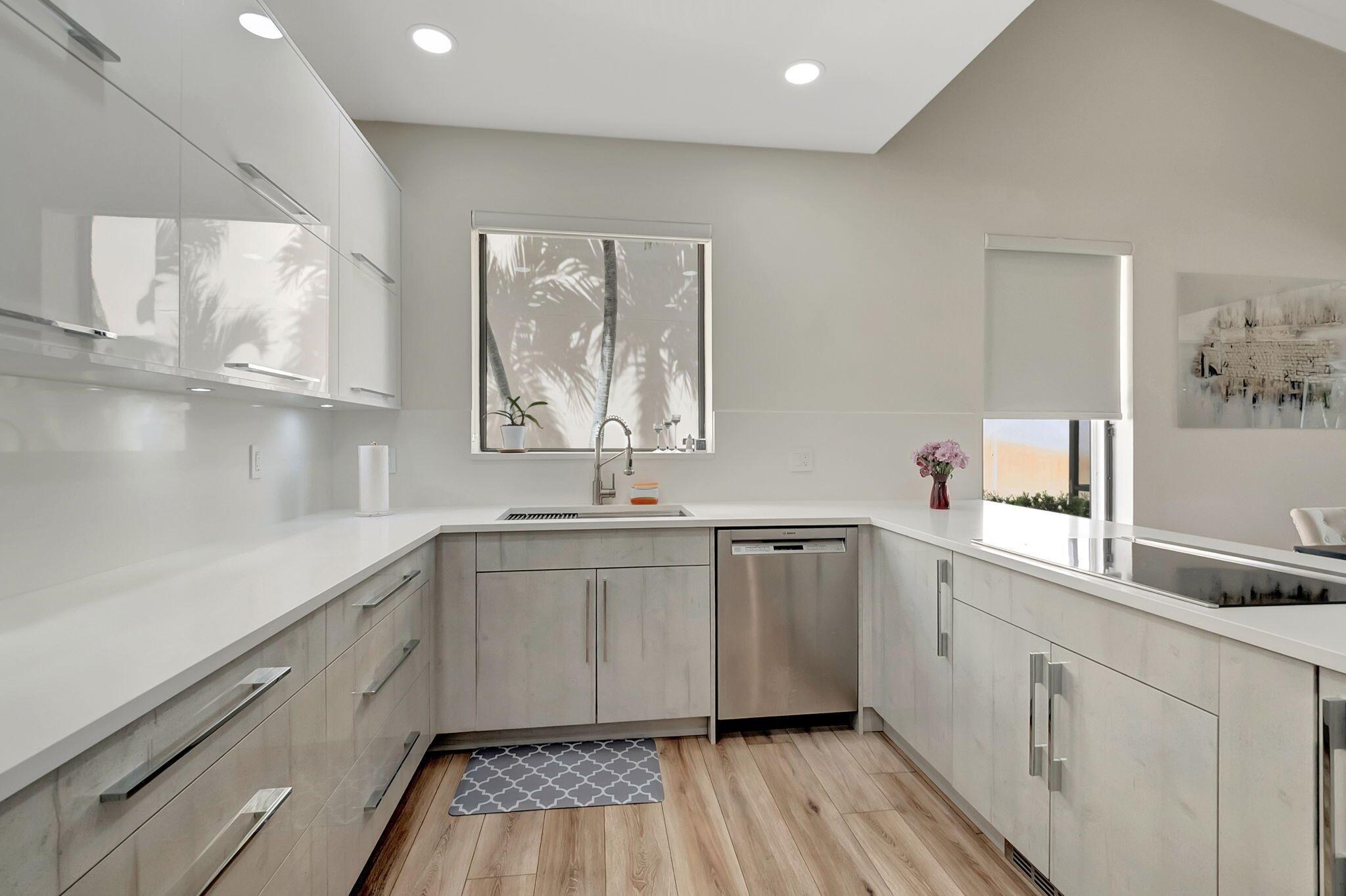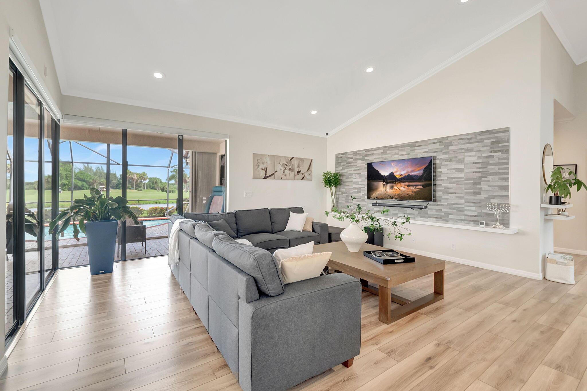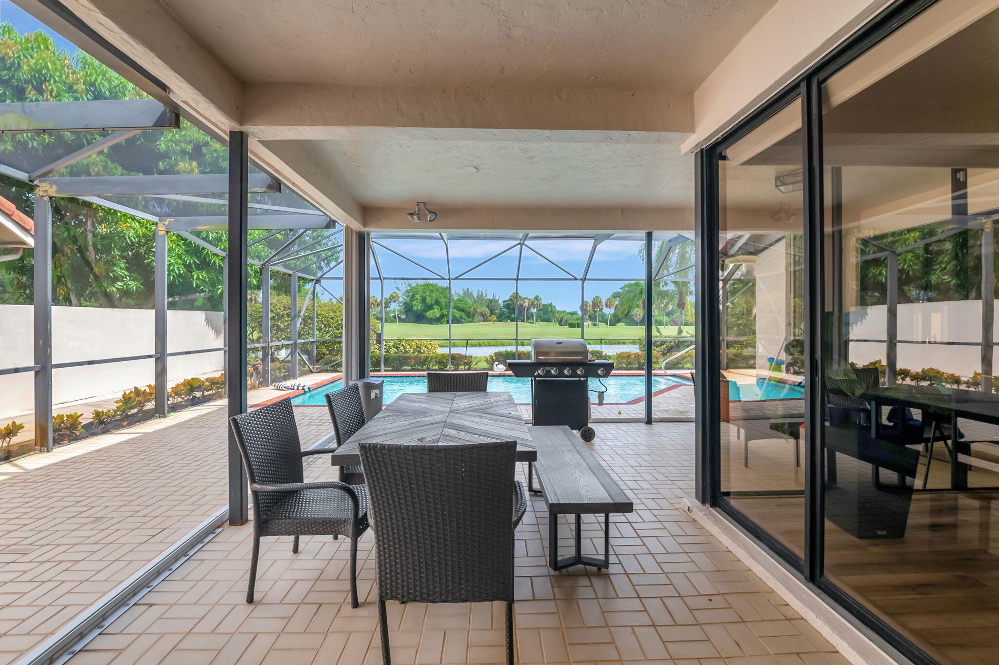 Exquisite newly renovated centrally located home with incredible water views. Brand new kitchen and bathrooms with top of the line appliances and fixtures. Fabulous kitchen includes contemporary high gloss white custom cabinetry, quartz countertops, stainless steel appliances, wine cooler and breakfast bar open to the family room. This home overlooks a triple fairway view and is separated by beautiful water and golf views. The private fenced courtyard has been renovated with travertine marble and is perfect for pets or children. The screened heated pool is immaculately maintained. Boca Greens is the most affordable guard gated community in the area and has no mandatory membership. A real must see, this home boasts high end quality, very low HOA fees, fast fiber optic internet and cable..