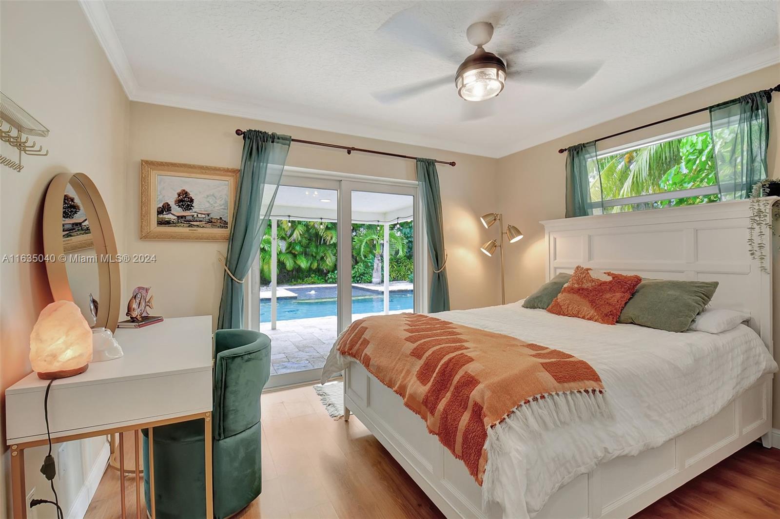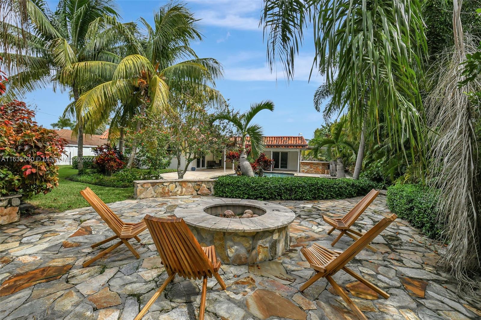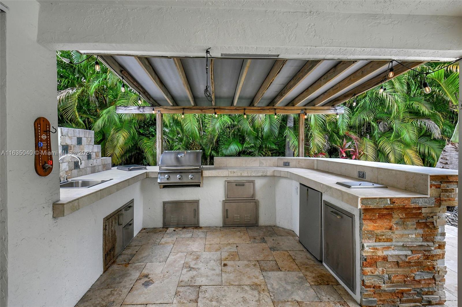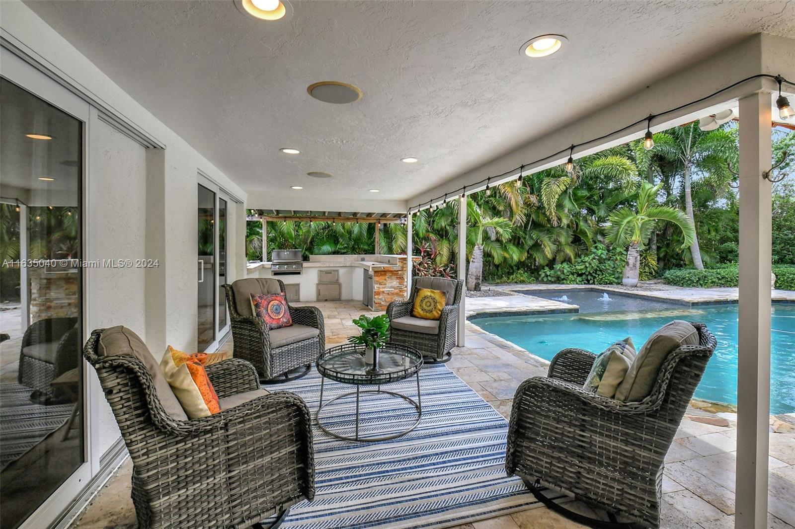 Enjoy a tropically landscaped garden, pool views, & natural light w/northern & southern exposures. Your private oasis features a custom oversized solar-heated salt chlorinated pool w/swim jet, water features, &glass-tiled swim shelf. Travertine patio includes a flagstone fire pit, built-in BBQ grill, fridge, sink, & fenced backyard w/RV space. Bright interior w/impact windows/doors, split floor plan, updated baths, LED lights, built-in speakers, & smart home features. Open kitchen w/energy-star stainless appliances & pantry. Primary bed w/ walk-in closet; guest bath w/ dual vanity. PVC pipes, relined copper sewer lines, large garage w/'24 washer/dryer, '22 AC, shop vac, & generator switch. Minutes to top schools, FAU, beach, & shops. Cameras on site.