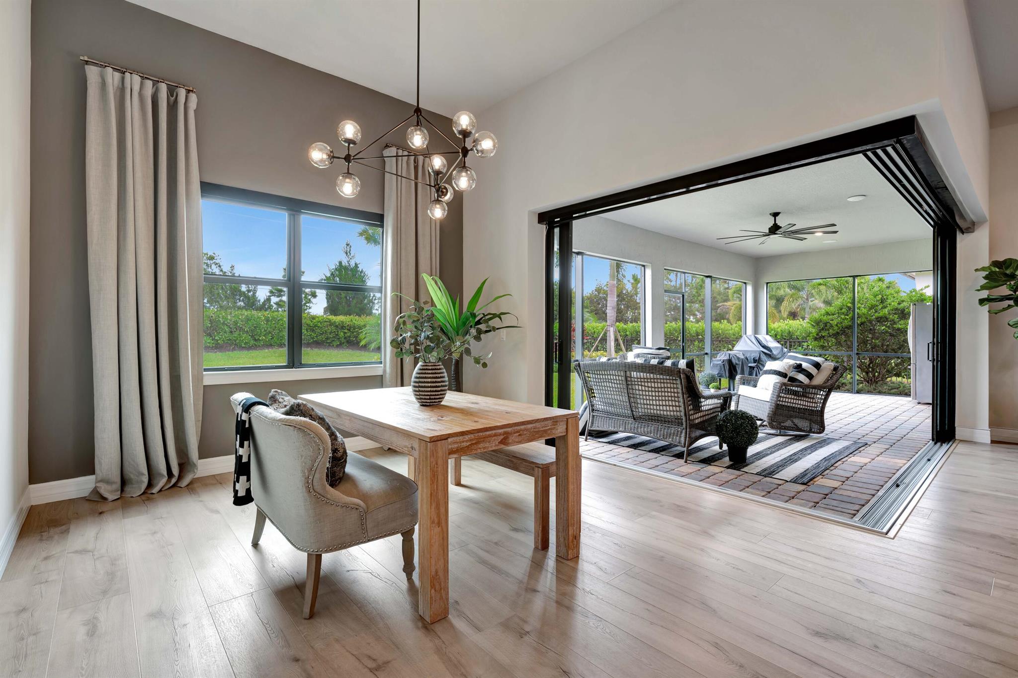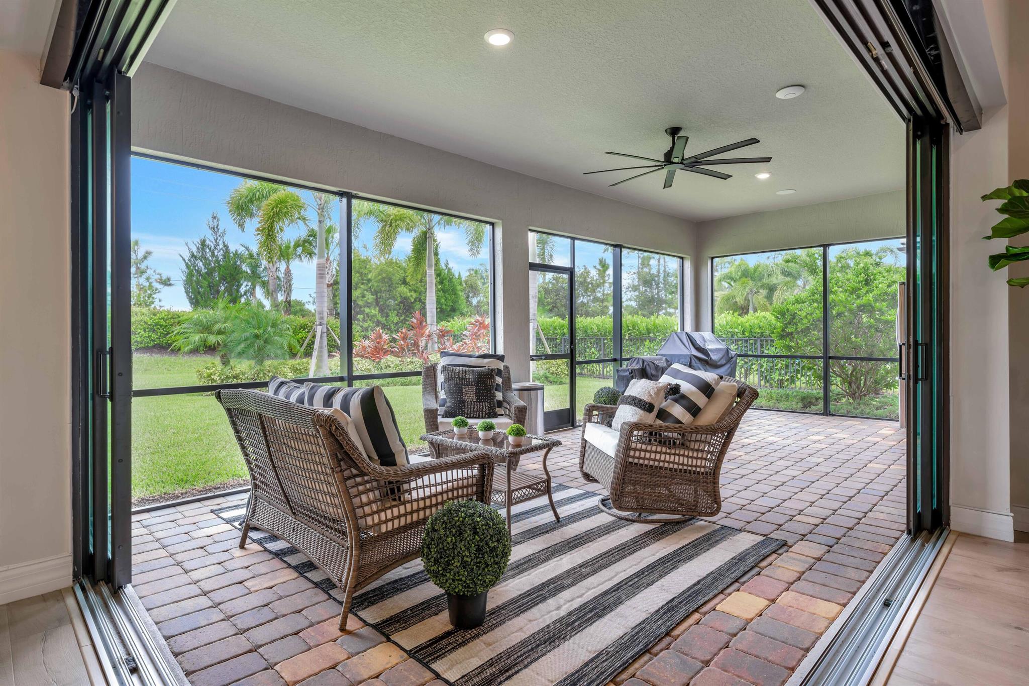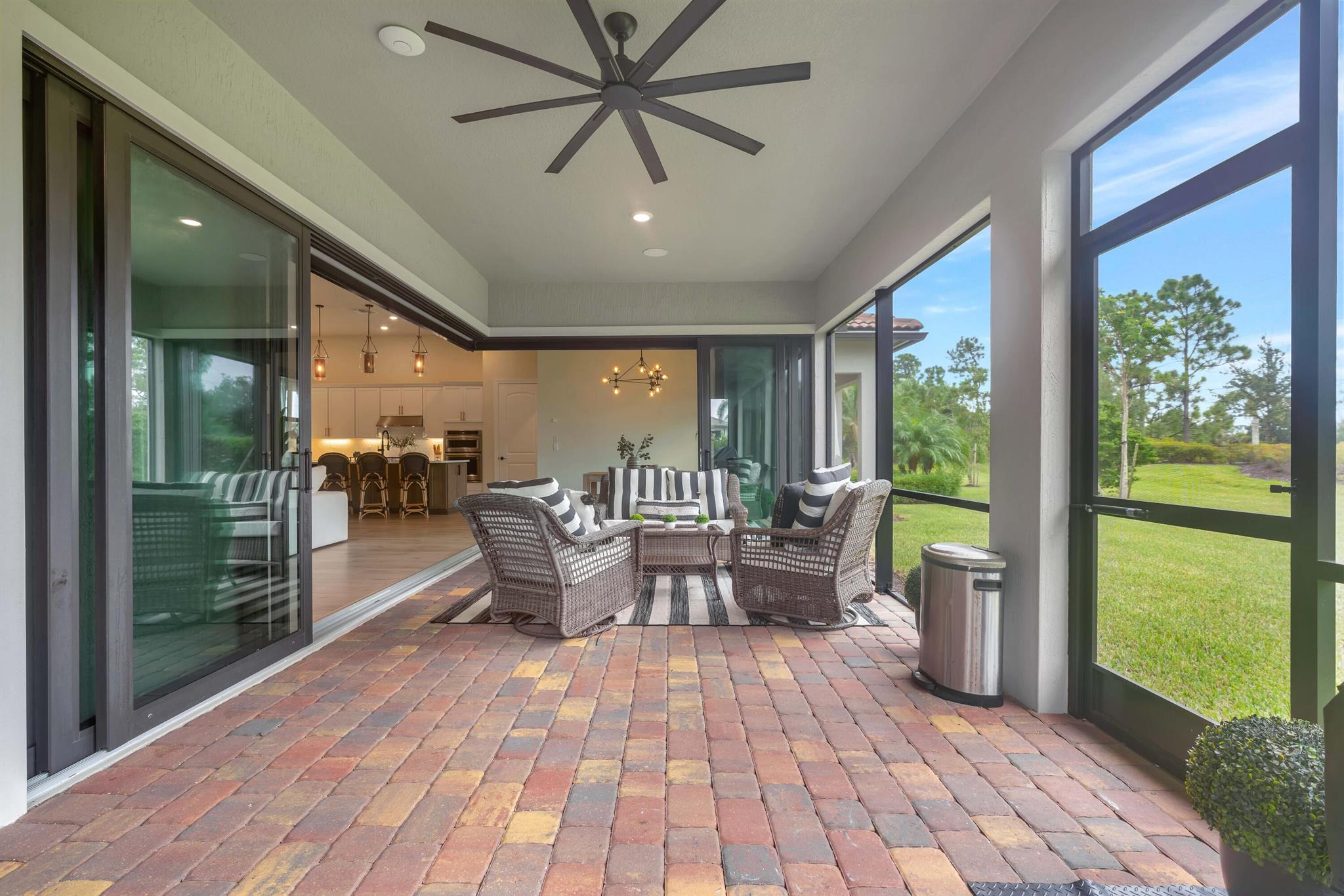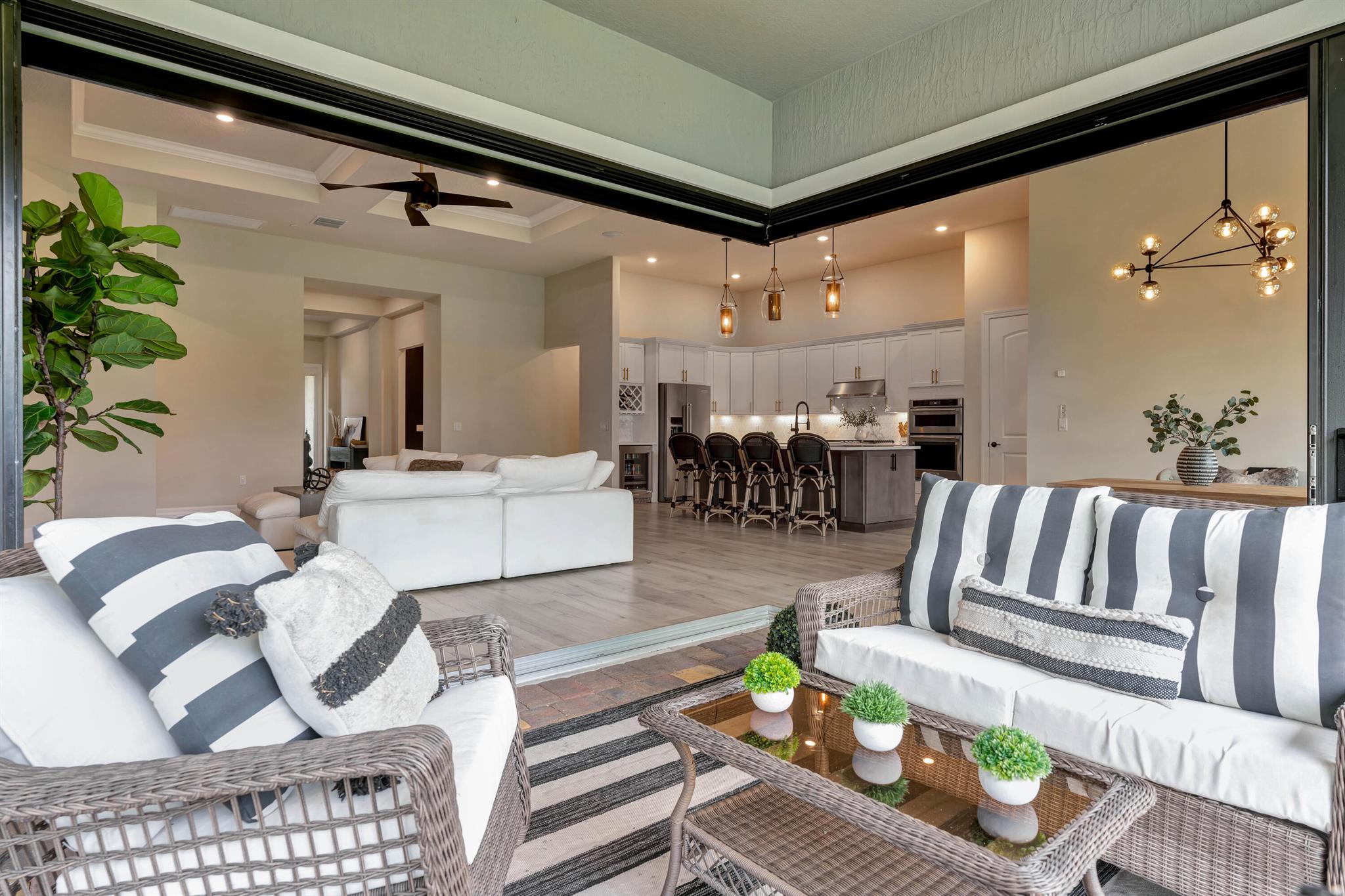 Welcome to your dream home in Ancient Tree, a prestigious gated community built by DiVosta! This stunning newer construction residence offers over 3,000 square feet of luxurious living space, designed with modern living in mind with over $150,000 in upgrades!Freshly painted inside, this home features an open floor plan that is light and airy, perfect for entertaining and everyday living. With 4 spacious bedrooms and two versatile flex rooms, you'll have all the space you need. Some of the windows are adorned with electric shades, providing both privacy and aesthetic appeal.Structural upgrades include zero corner sliding glass doors, a tankless water heater, a pool bath with a covered lanai, all-impact glass, and a screened-in lanai, ensuring durability and convenience.