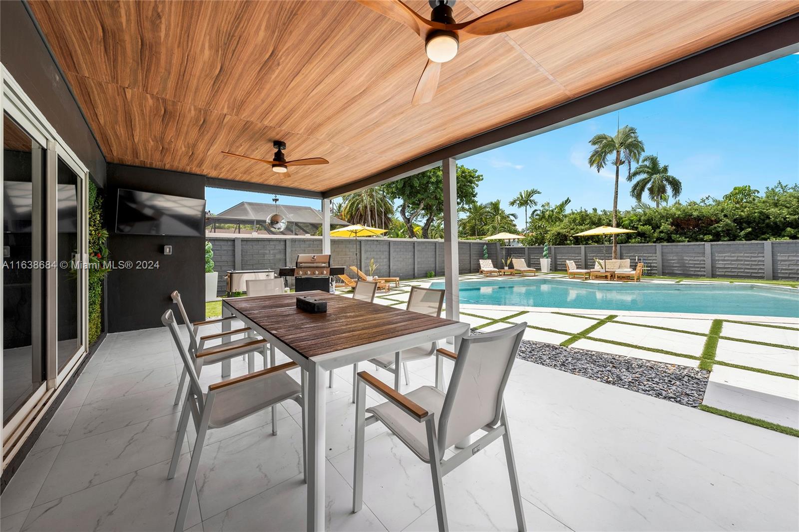 Welcome to this classic renovated 5 BD / 4 BA mid-century pool home, exuding a luxurious Palm Springs vibe. Nestled in Hollywood Hills, this gorgeous home boasts one of the largest lots in the neighborhood, and a resort-style rear yard complete with oversized pool, pristine putting green, outdoor TV, elegant covered Florida room, and cabana bath with relaxing sauna. The expansive primary bedroom offers a stunning view of the pool. Four additional spacious bedrooms and a fully renovated, state-of-the-art kitchen. Enjoy new porcelain floors throughout, spacious two-car garage, and brand-new, high-impact windows and doors. Recent updates include new roof, modern pool lining, and advanced electrical system. Don't miss this opportunity!