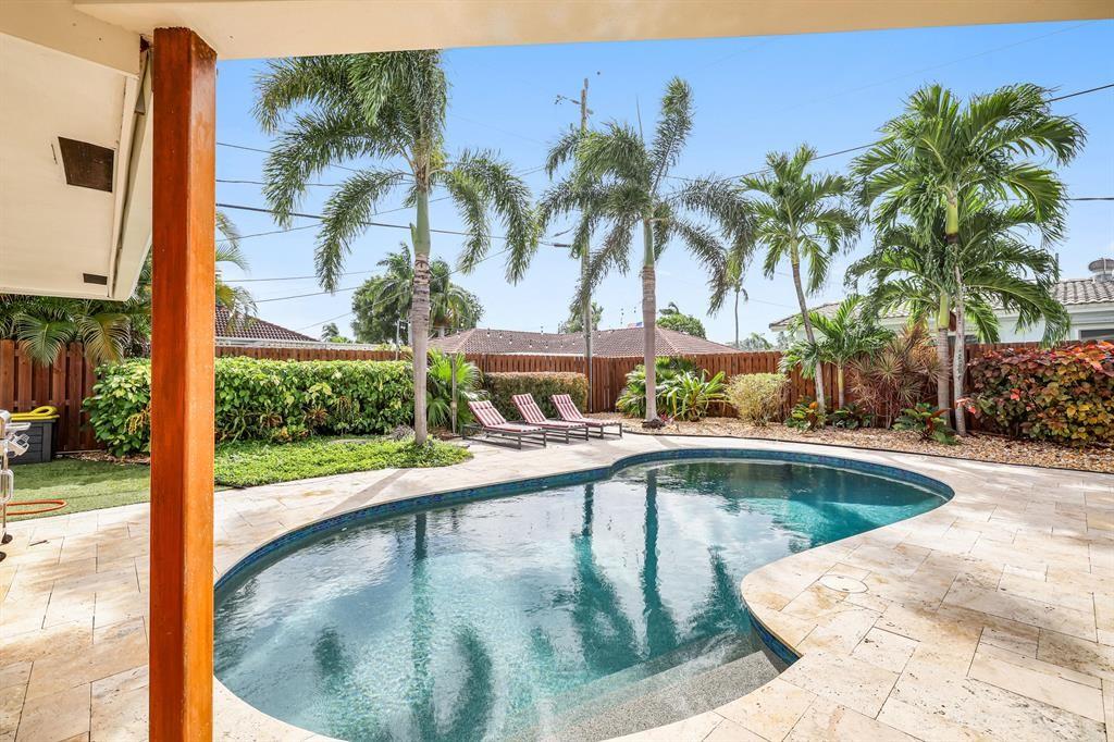 Incredibly large, ranch style home! This 4 bedroom, 3 bath home is equipped with high end SubZero and Bertazzoni appliances. Mother in law suite has its own kitchen, bathroom and hurricane impact door to the backyard. Modern finishes, completely remodeled. Plantation shutters in extra large family room. Views of the backyard/pool from every room in this gorgeous home. Large kitchen island with separate dining room. AC is 2022. Heated pool. Beautiful backyard with turf, outdoor shower and seated bar with window to the kitchen. Primary and two guest rooms have access to the backyard. Spacious layout for a family, split bedroom floor plan. Less than a 5 minute drive to the beach. 2 car garage and indoor laundry. Prestigious Coral Ridge neighborhood perfect for idlillic South Florida living.