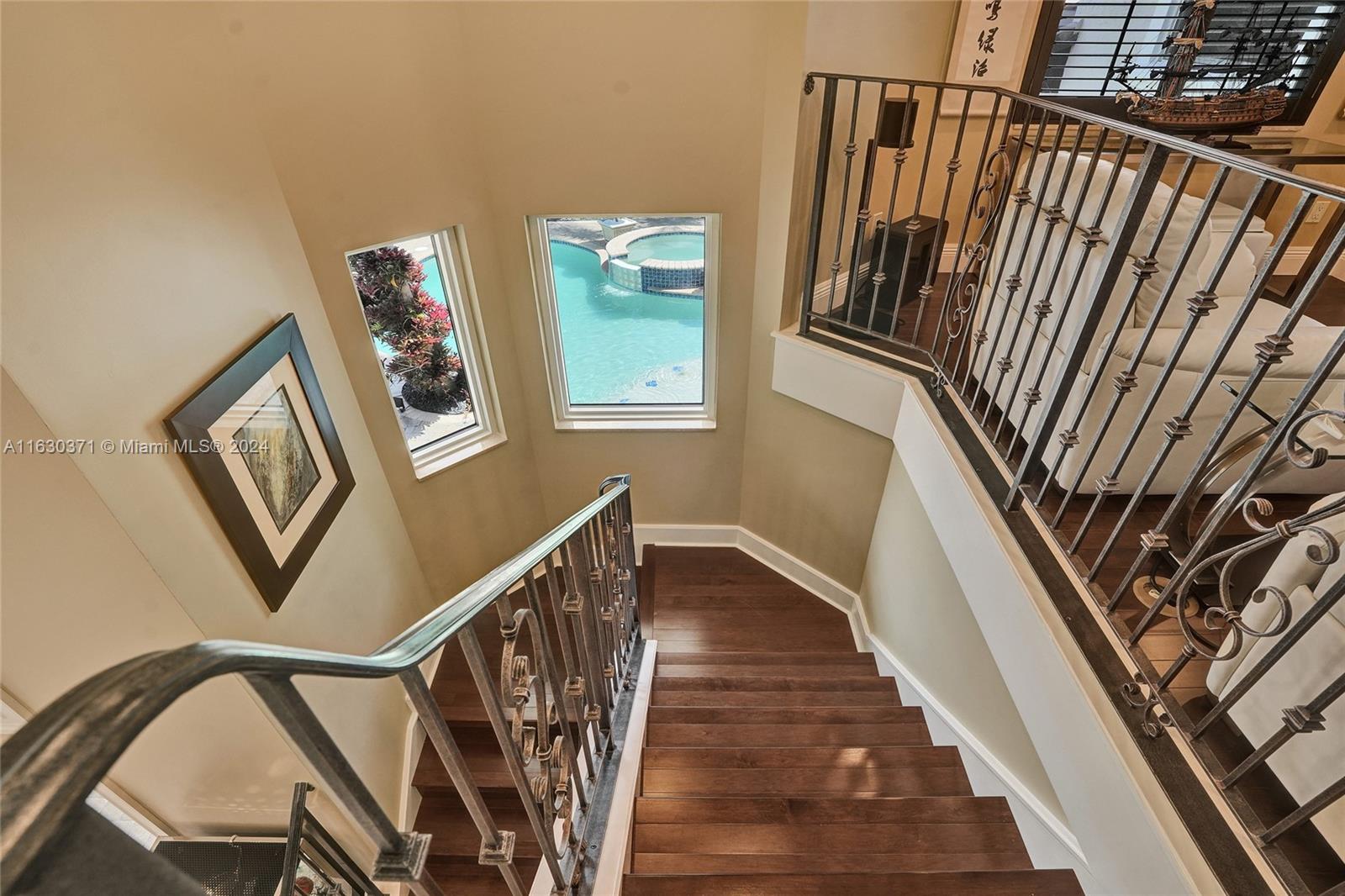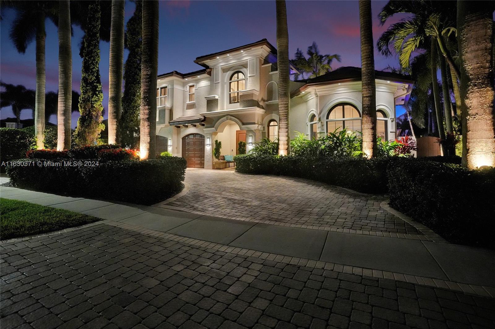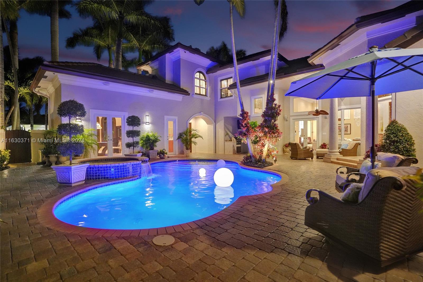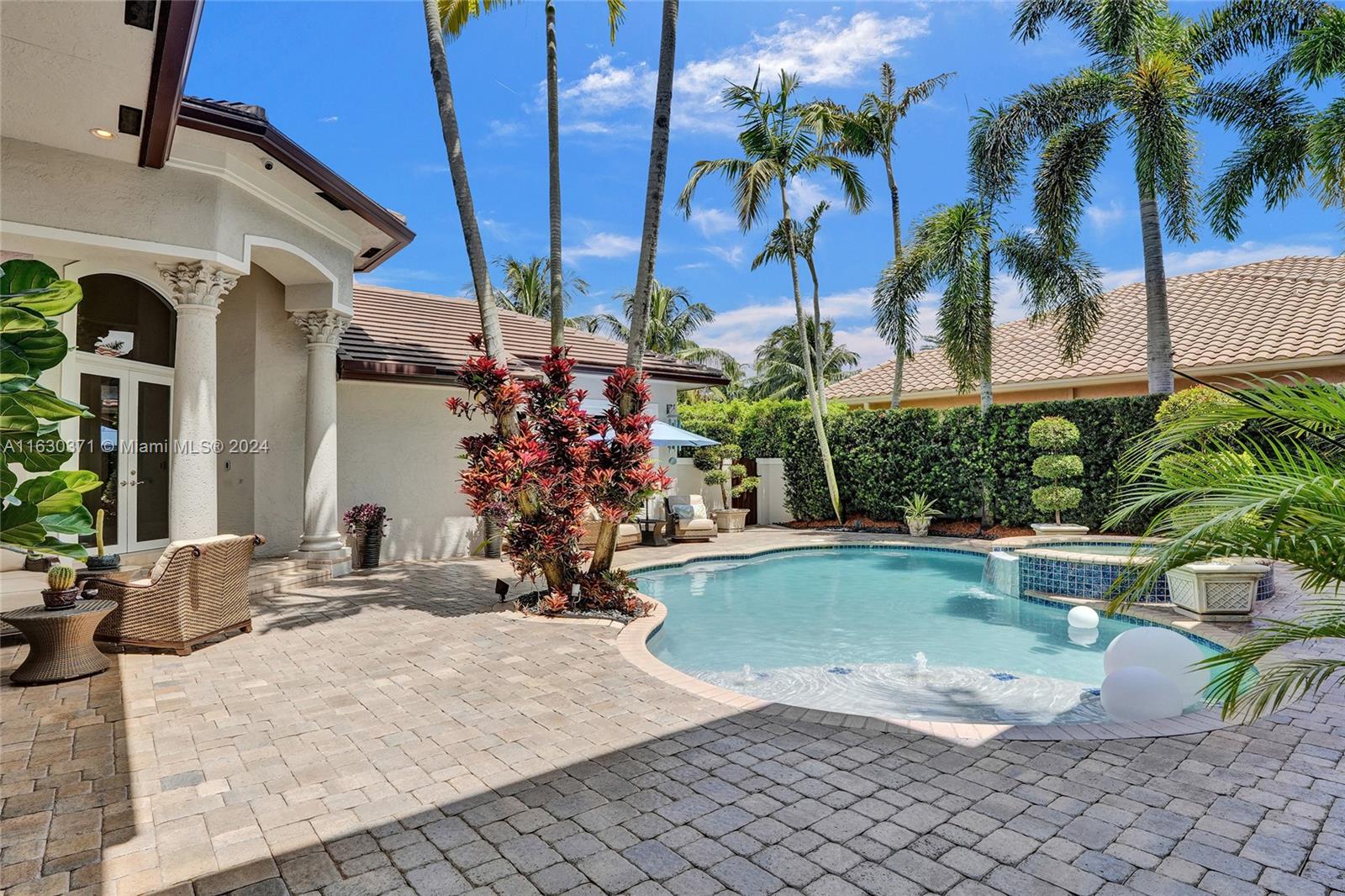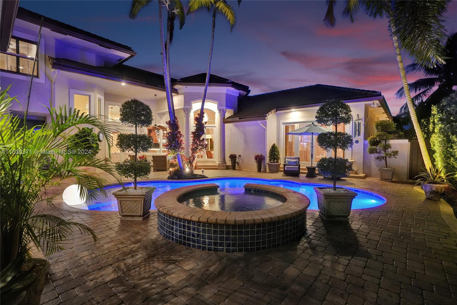YOUR PRIVATE TROPICAL OASIS AWAITS YOU! Stunning 2 story house on a quiet cul-de-sac in the 24/7 guard gated Hawks Landing. It features 5 bed/4.5 bths w/ waterfront views. A New Roof, exterior paint 2023, all impact windows/doors in 2022. Smart Home, security cameras, security lights. The first floor has the sumptuous primary w/dbl W.I.C., marble spa bath. Wood floors & high volume ceilings make this a true retreat. Enjoy your large chef's kitchen with dbl. stacked wood & glass cabinets. High end appliances w/ 6 burner gas stove & dbl. ovens. New wine & beverage cooler makes for easy entertaining. marble & wood floors throughout. The separate guest house has views of the pool & spa plus amazing courtyard landscaping, W.I.C. and refreshment bar plus full bath. Look no further, you’re home.