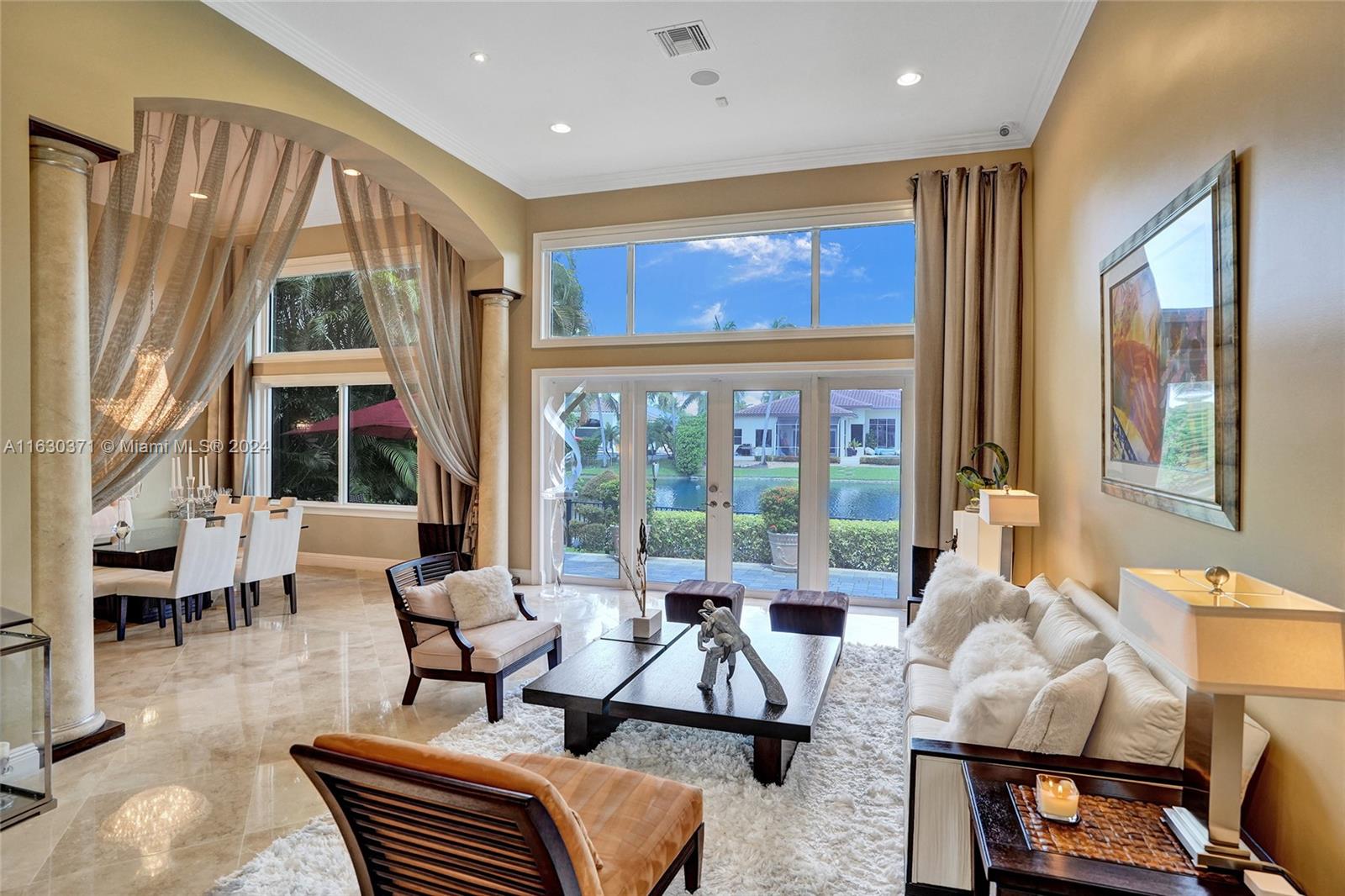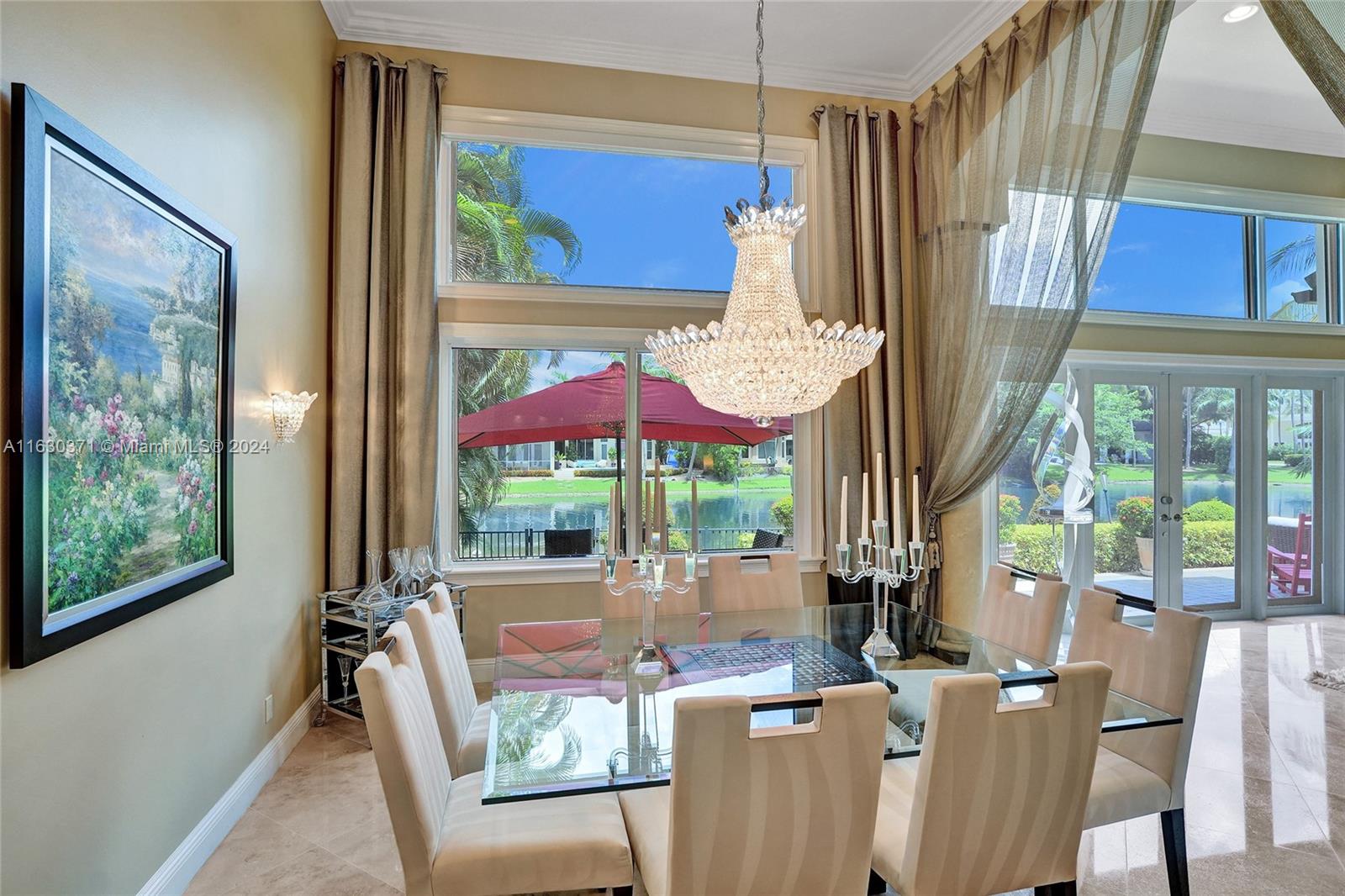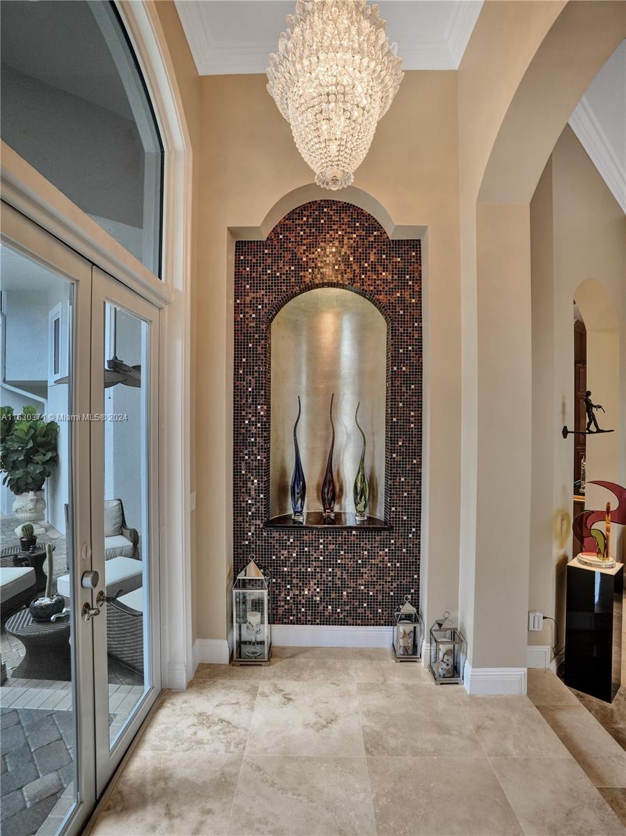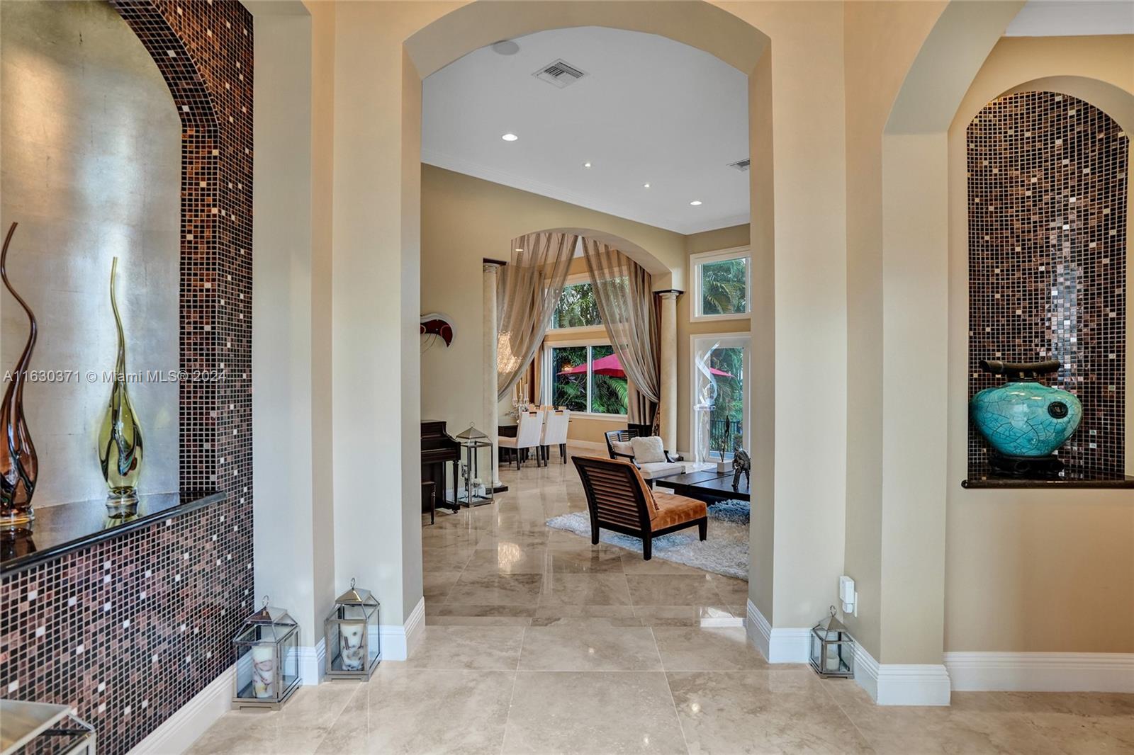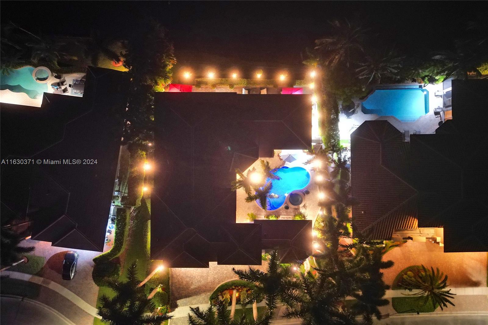 YOUR PRIVATE TROPICAL OASIS AWAITS YOU! Stunning 2 story house on a quiet cul-de-sac in the 24/7 guard gated Hawks Landing. It features 5 bed/4.5 bths w/ waterfront views. A New Roof, exterior paint 2023, all impact windows/doors in 2022. Smart Home, security cameras, security lights. The first floor has the sumptuous primary w/dbl W.I.C., marble spa bath. Wood floors & high volume ceilings make this a true retreat. Enjoy your large chef's kitchen with dbl. stacked wood & glass cabinets. High end appliances w/ 6 burner gas stove & dbl. ovens. New wine & beverage cooler makes for easy entertaining. marble & wood floors throughout. The separate guest house has views of the pool & spa plus amazing courtyard landscaping, W.I.C. and refreshment bar plus full bath. Look no further, you’re home.