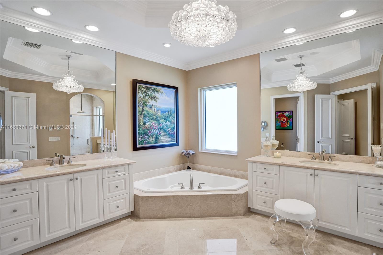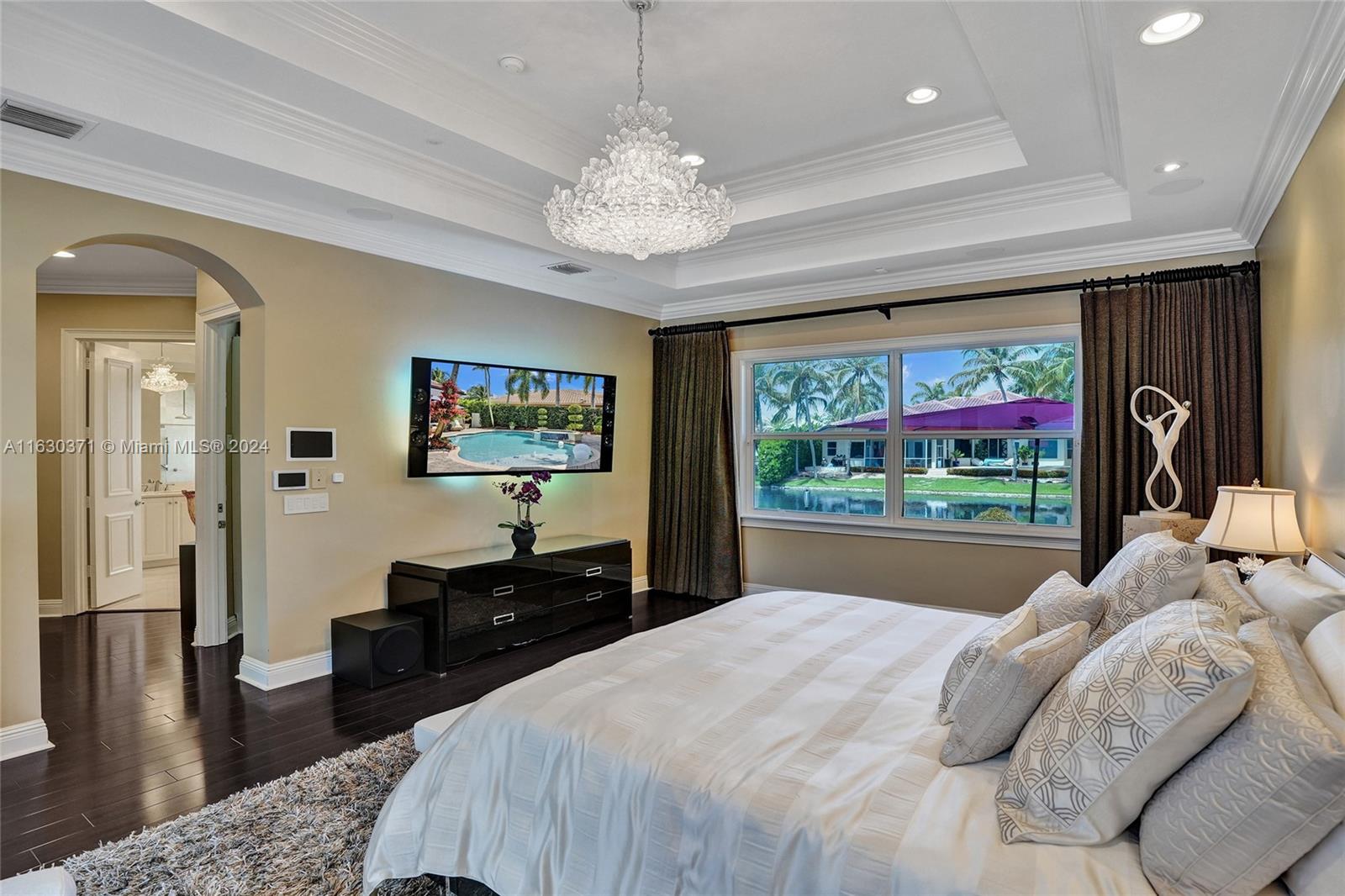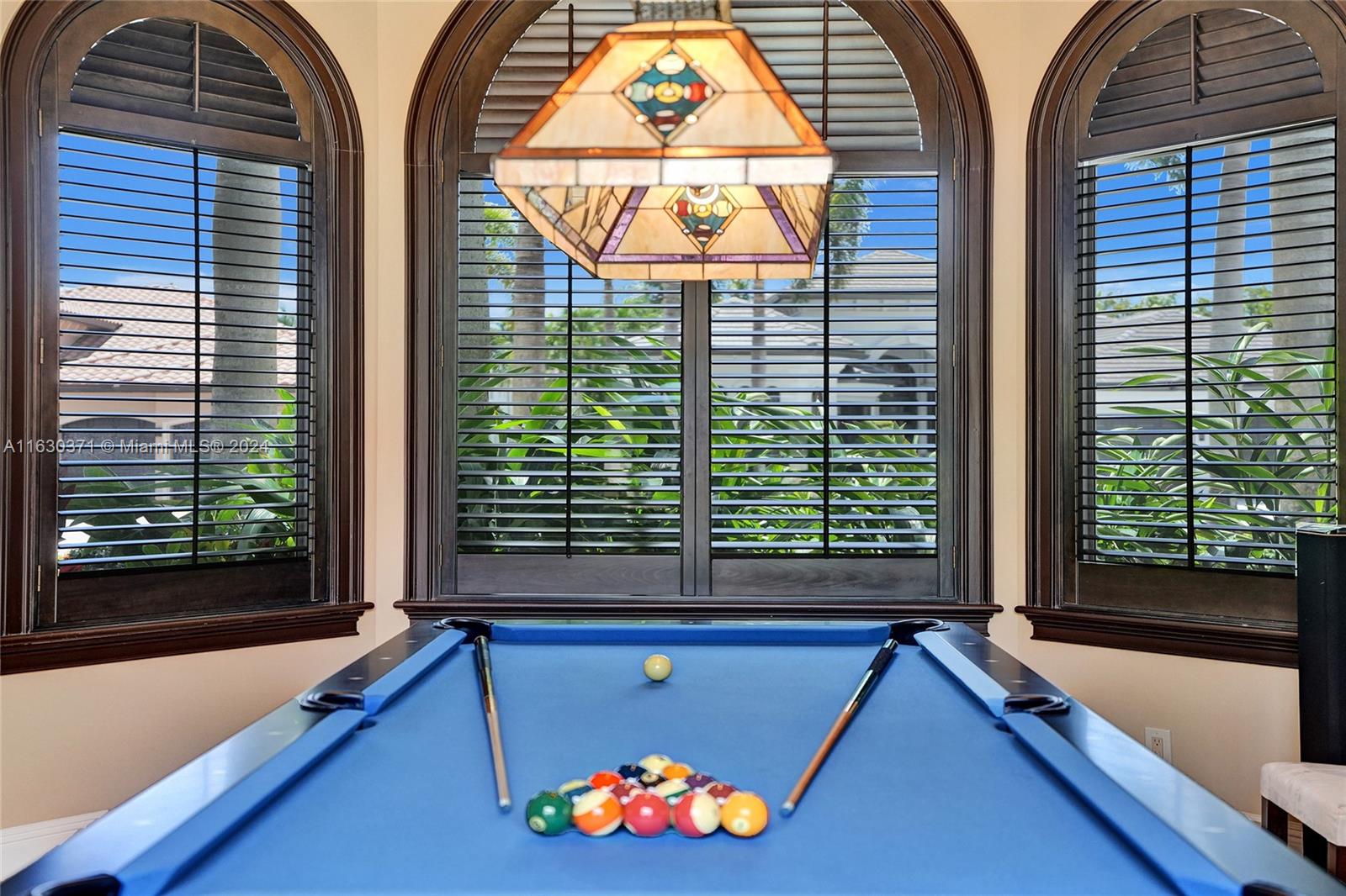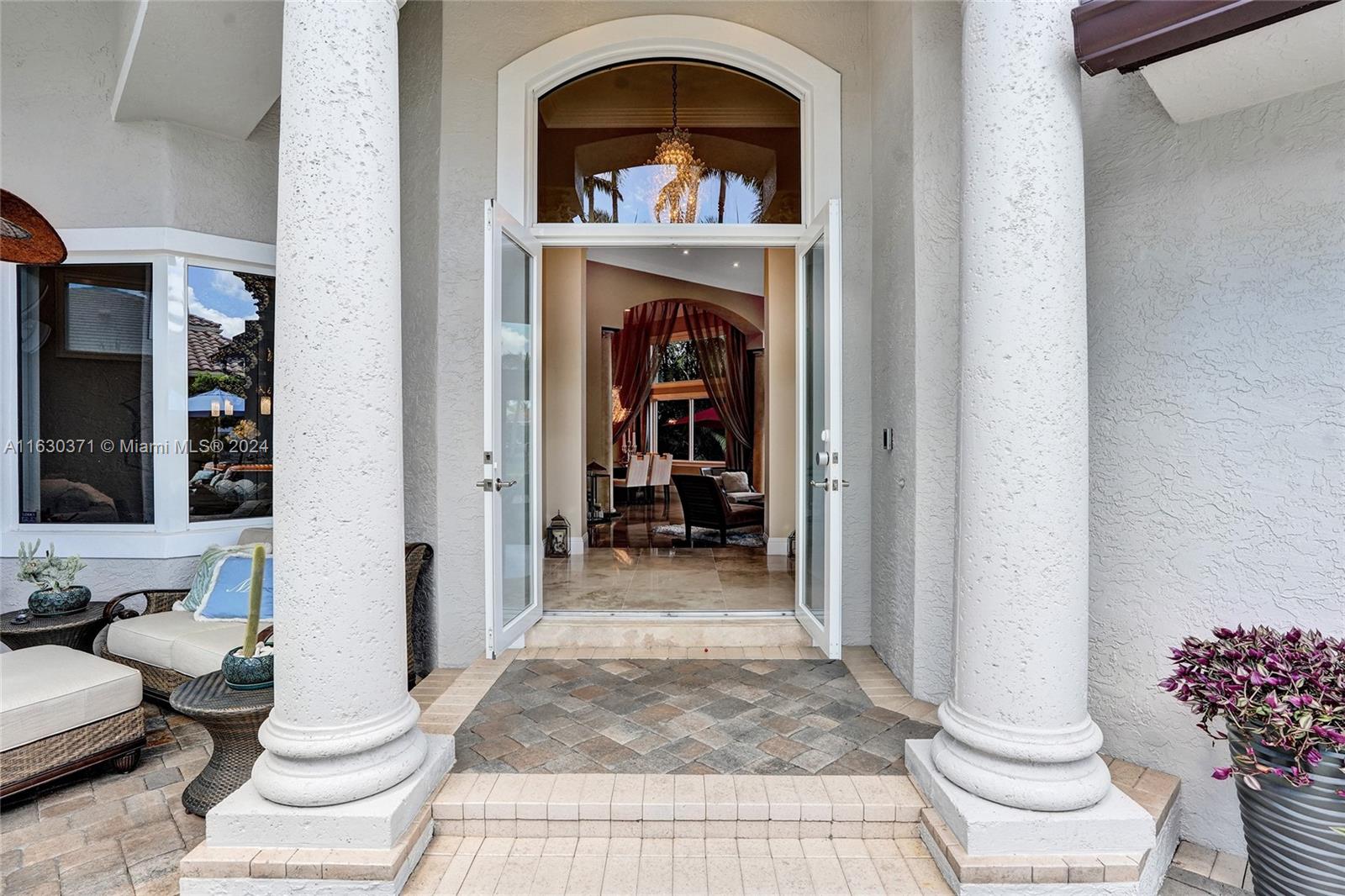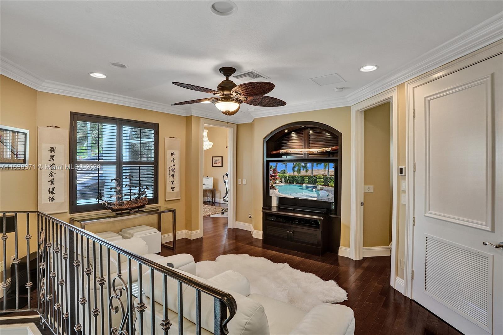 YOUR PRIVATE TROPICAL OASIS AWAITS YOU! Stunning 2 story house on a quiet cul-de-sac in the 24/7 guard gated Hawks Landing. It features 5 bed/4.5 bths w/ waterfront views. A New Roof, exterior paint 2023, all impact windows/doors in 2022. Smart Home, security cameras, security lights. The first floor has the sumptuous primary w/dbl W.I.C., marble spa bath. Wood floors & high volume ceilings make this a true retreat. Enjoy your large chef's kitchen with dbl. stacked wood & glass cabinets. High end appliances w/ 6 burner gas stove & dbl. ovens. New wine & beverage cooler makes for easy entertaining. marble & wood floors throughout. The separate guest house has views of the pool & spa plus amazing courtyard landscaping, W.I.C. and refreshment bar plus full bath. Look no further, you’re home.