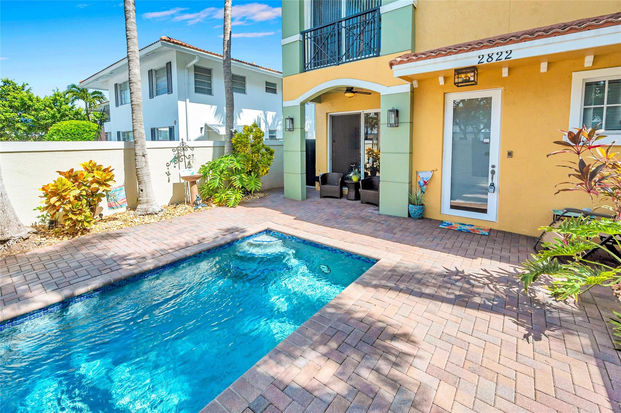 Two-story, newer construction (2007) townhouse with private splash/cocktail pool in boutique Coral Ridge development! Spacious, corner unit offers an open floor plan with main living area, including a powder room, on the first floor and all three bedrooms, along with a separate laundry room, on the second floor. Features include: sleek, modern kitchen w/new appliances (2023), quartz countertops & backsplash and an abundance of wood cabinetry; oversized primary suite with huge walk-in closet; true 2-car garage w/driveway parking for 2 additional vehicles; volume ceilings; impact glass throughout; private & walled courtyard entry. Very desirable location only blocks from the beach and just minutes to Las Olas and downtown!